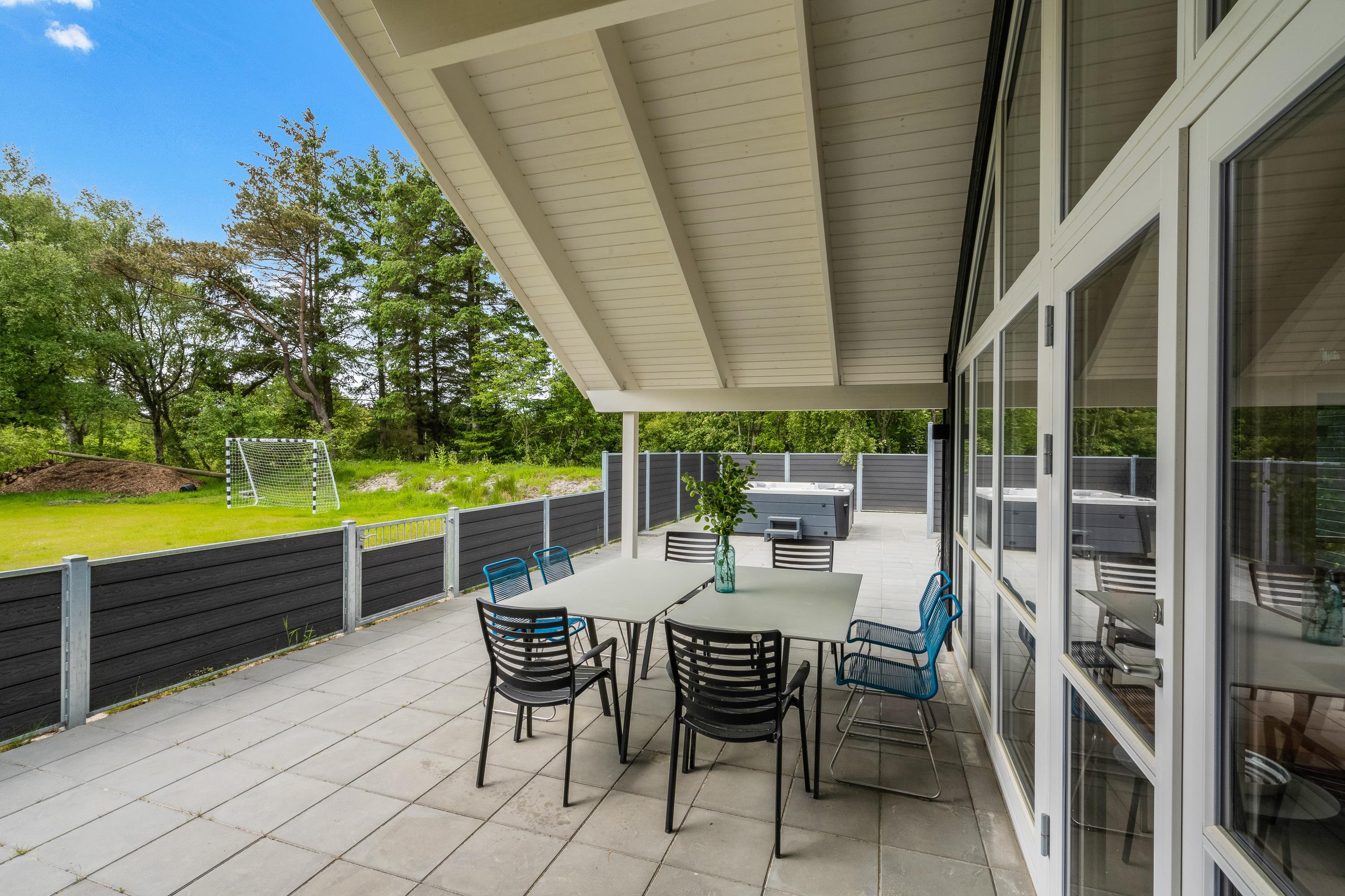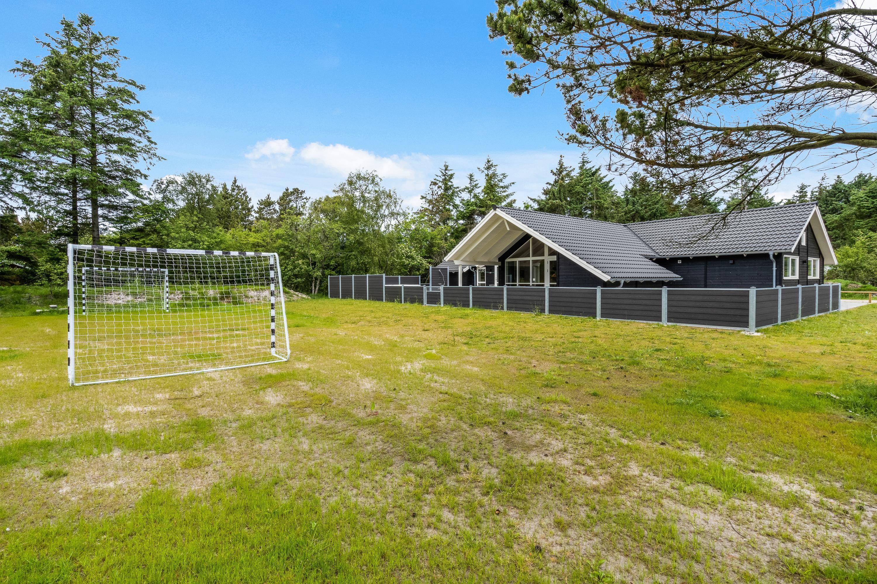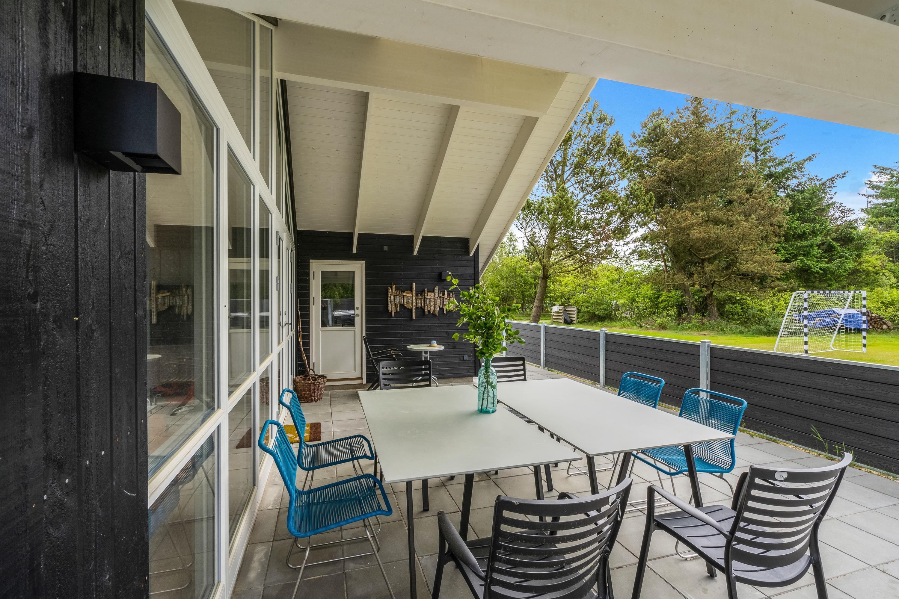 Terrassen er lukket, og derfor kan I roligt have jeres hunde med herude, uden at de går på opdagelse på egen hånd. I haven er der 2 fodboldmål, hvor I kan spille fodboldkampe på jeres ferie – hvem er feriens bedste fodboldspiller?