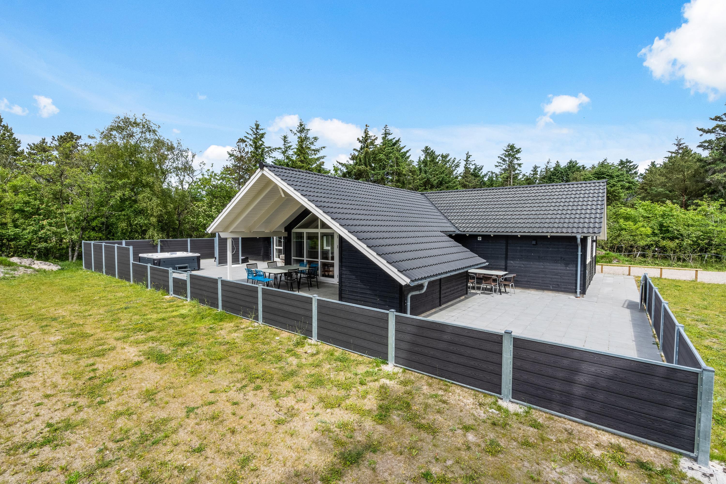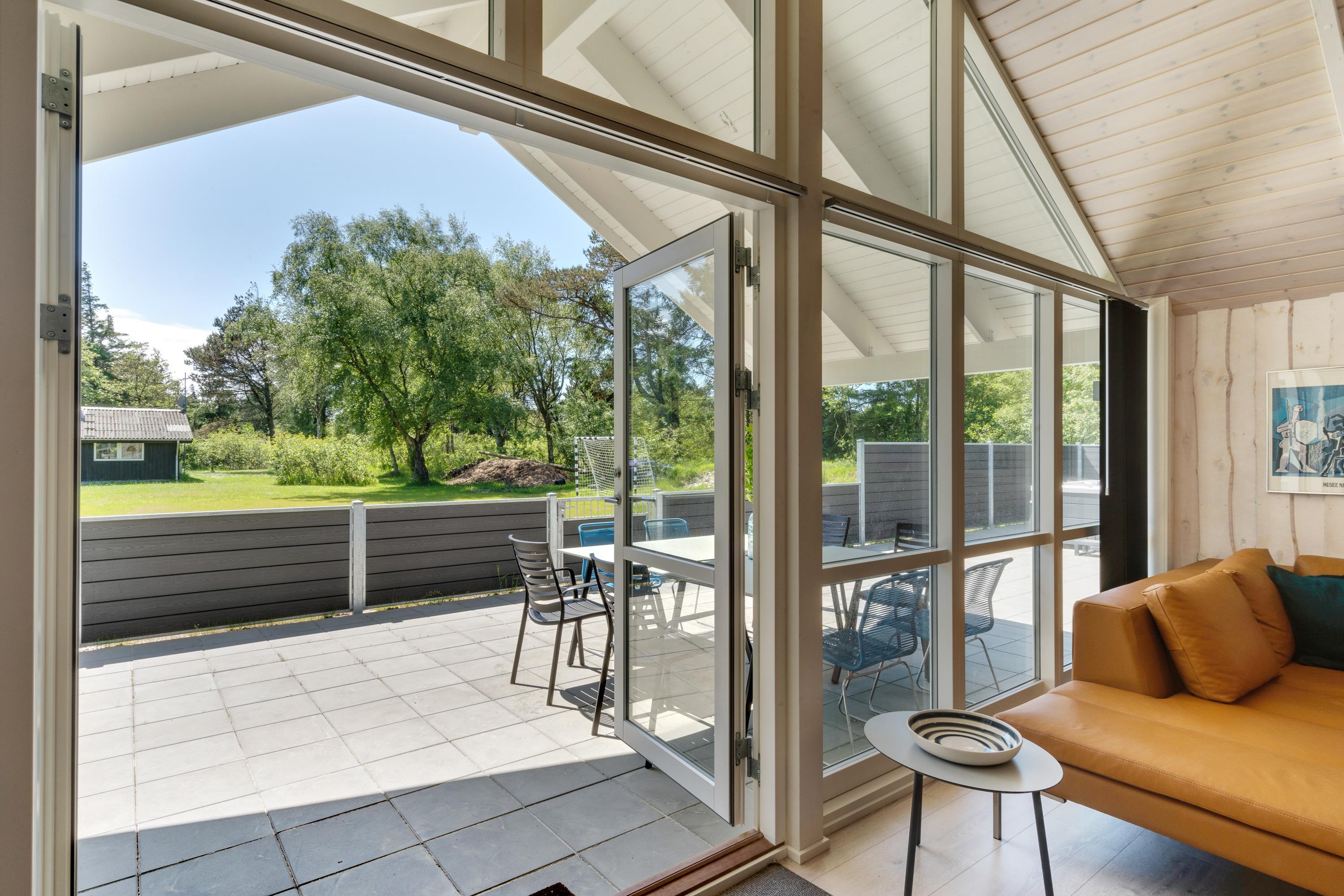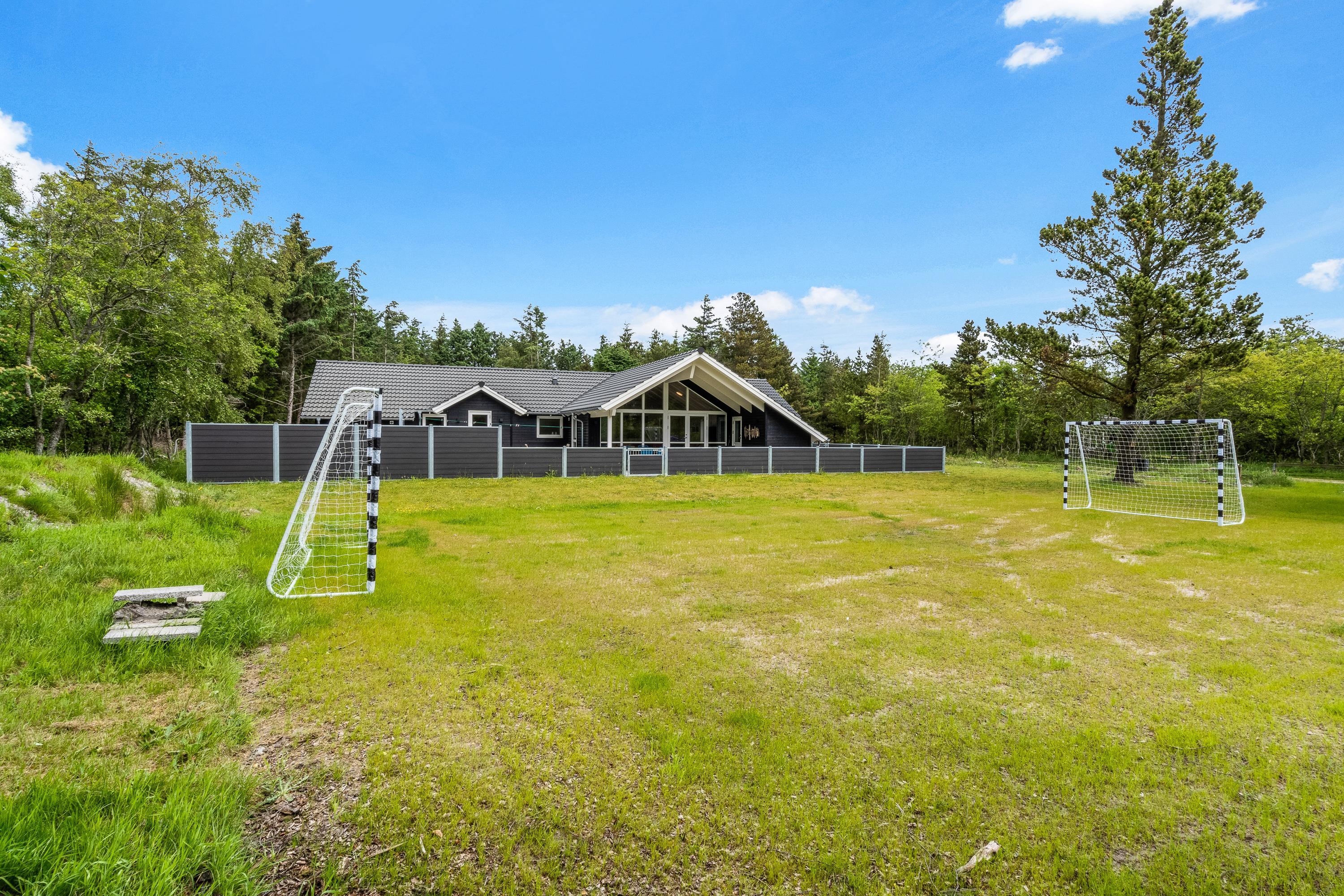Terrassen er lukket, og derfor kan I roligt have jeres hunde med herude, uden at de går på opdagelse på egen hånd. I haven er der 2 fodboldmål, hvor I kan spille fodboldkampe på jeres ferie – hvem er feriens bedste fodboldspiller?