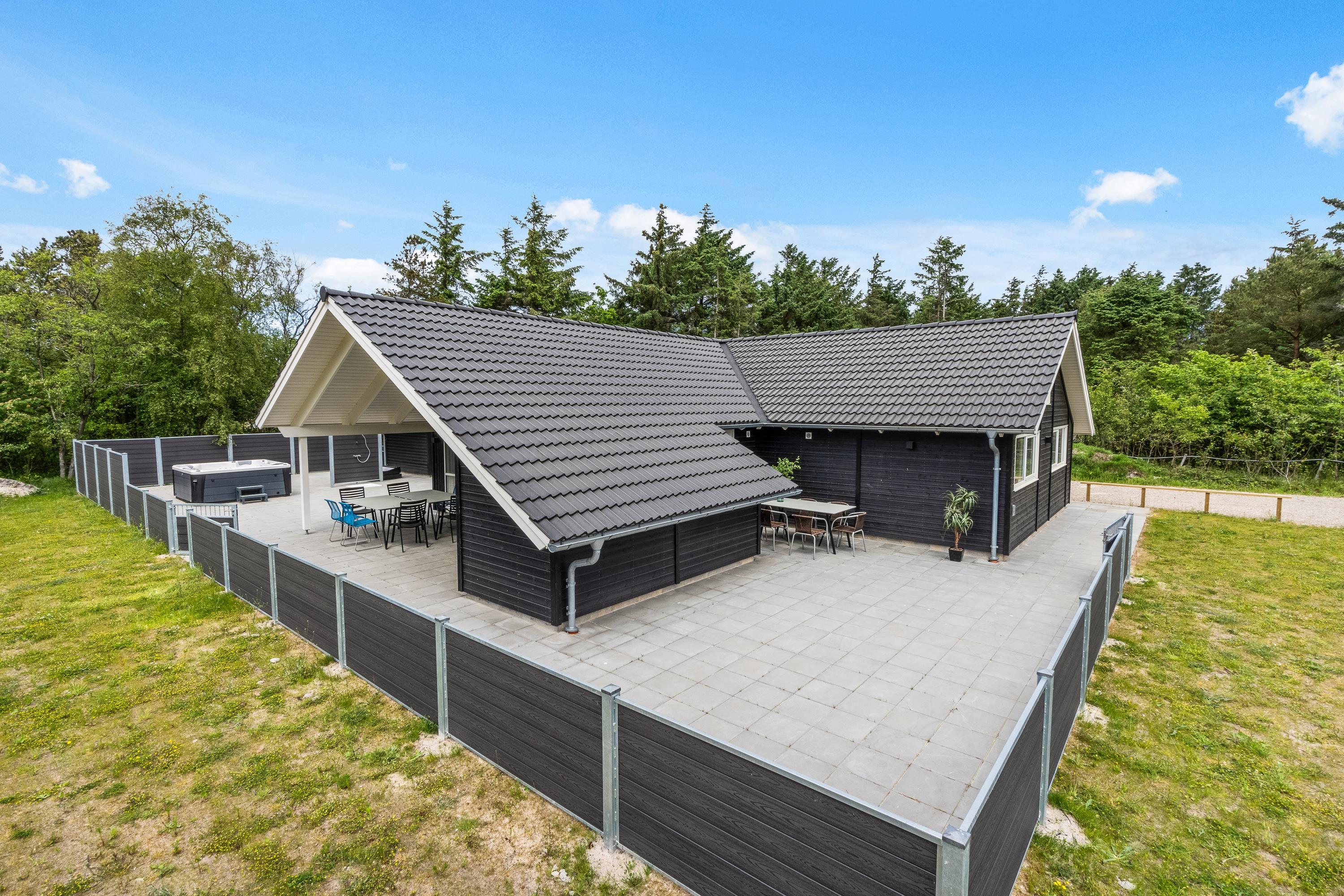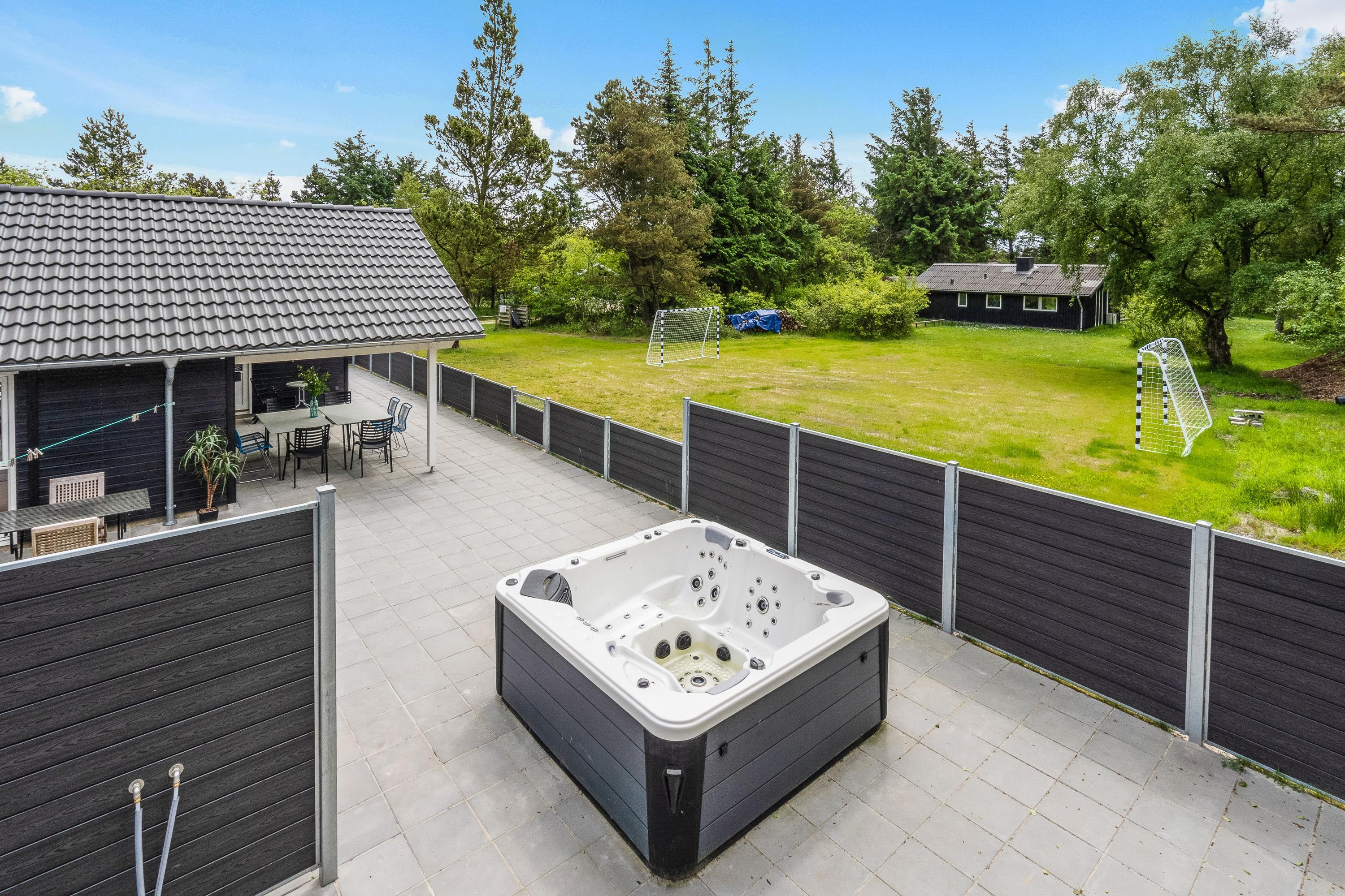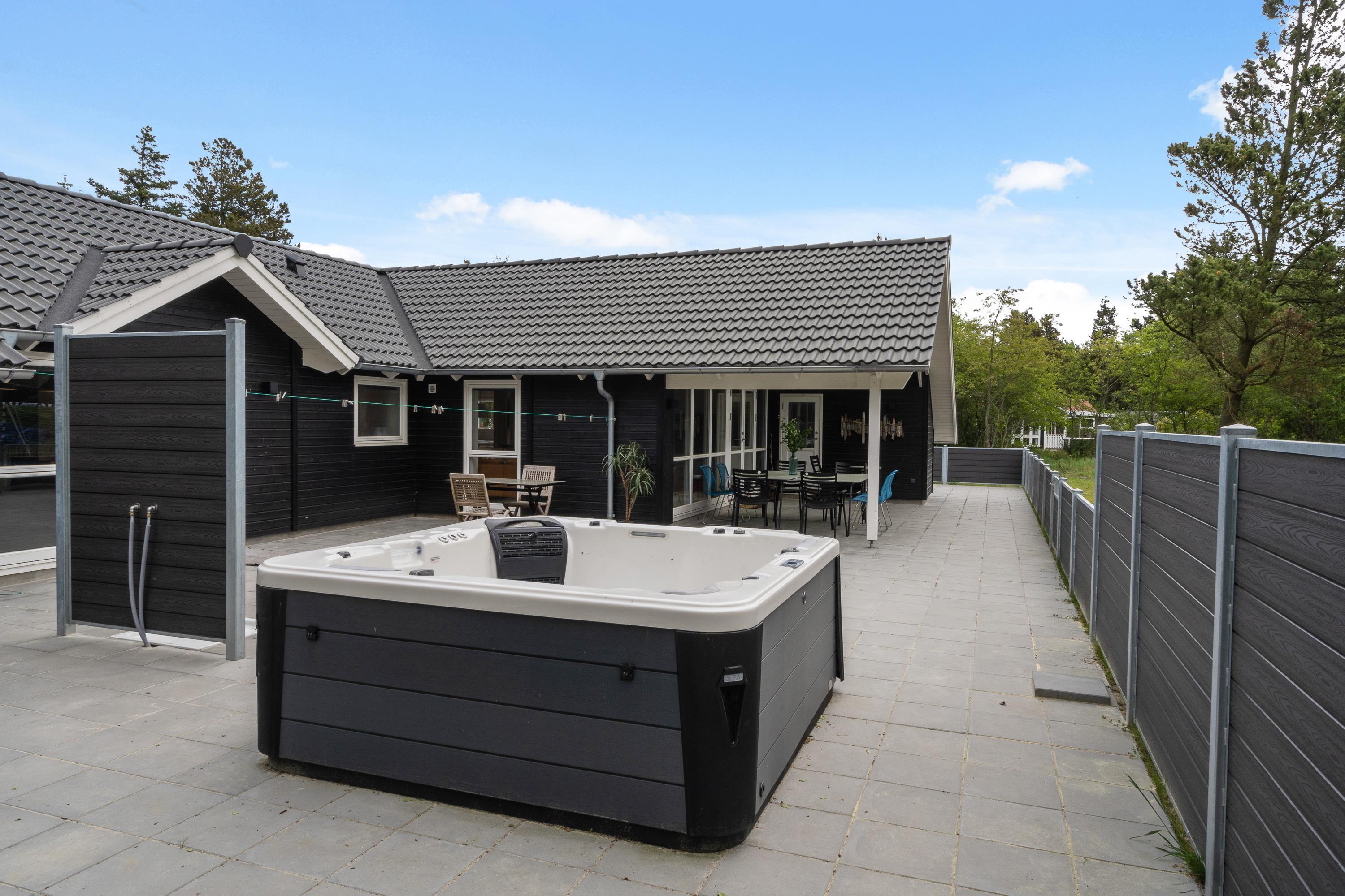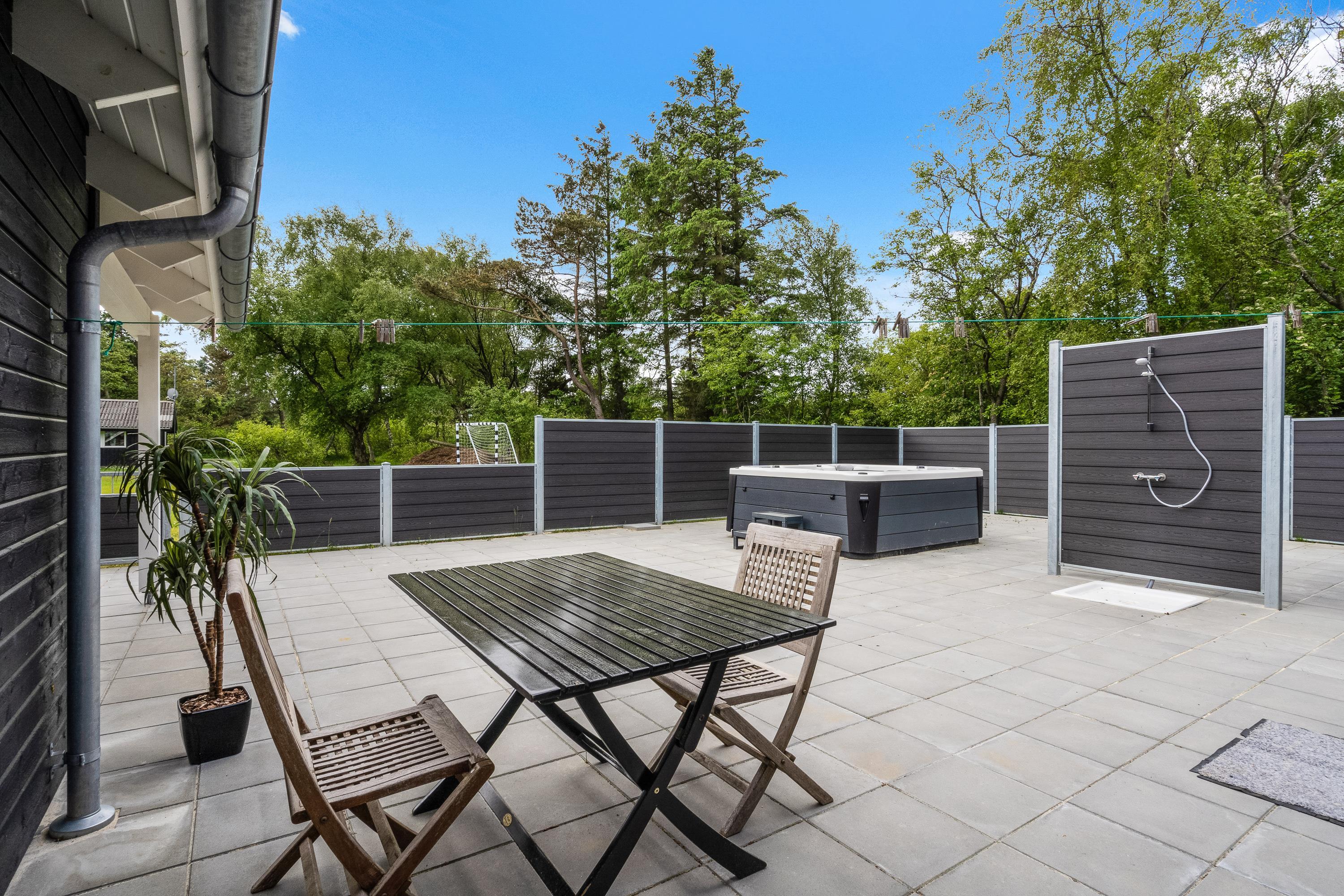 Der er også gode afslapningsmuligheder på sommerhusets terrasse. Her står der en dejlig udespa, som I kan læne jer tilbage i med lyden af fuglefløjt. På terrassen er der også en udebruser, som I kan skylle jer under efter en god strandtur. Udebruseren er lukket fra 1. november til 1. april.