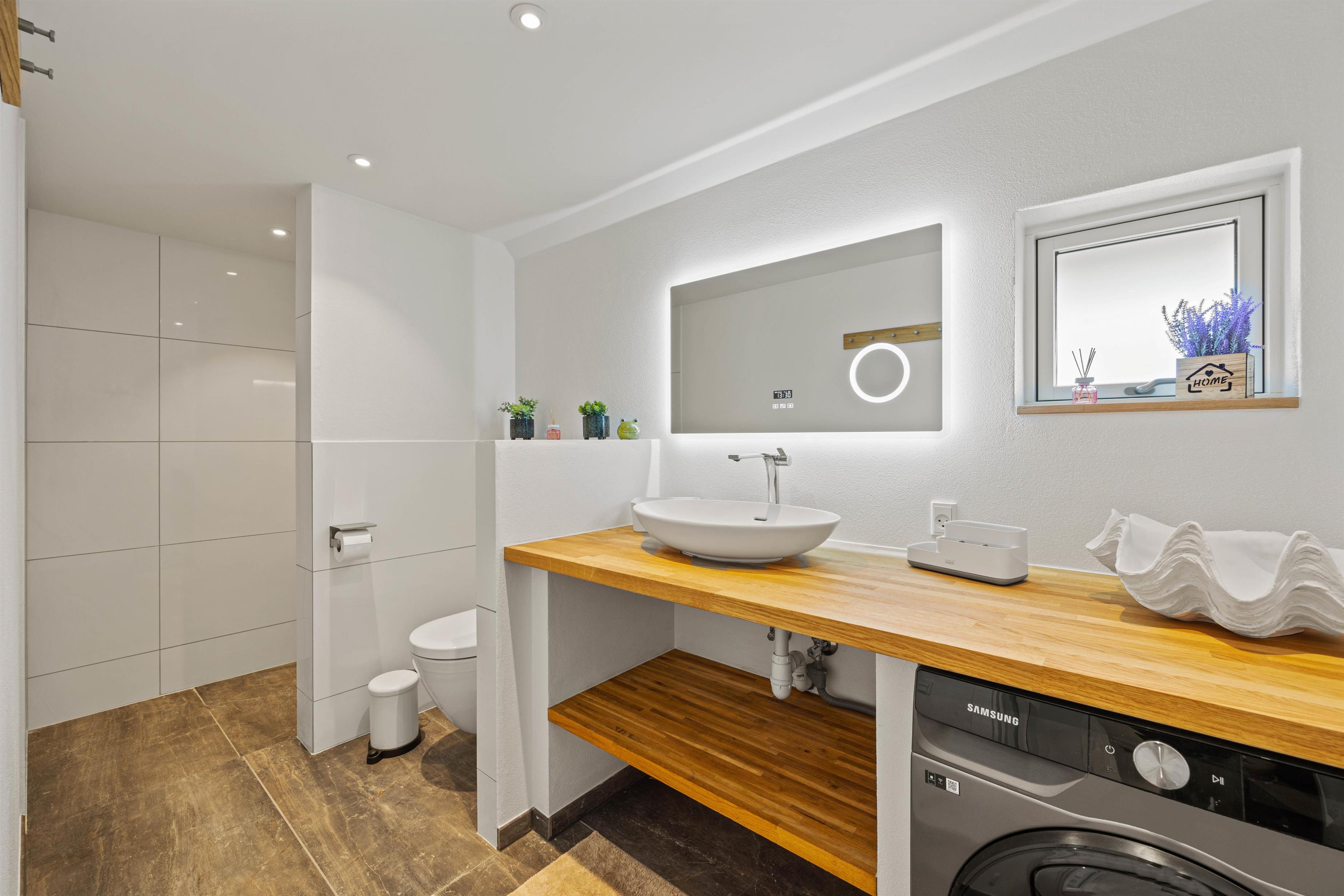Terrassen inviterer i det hele taget til skønne dage i den friske luft. Hele vejen langs kanten af terrassen køber små spots, der lyser uderummet op om aftenen og forlænger timerne udenfor. Og med glasfoldedøre og muligheden for at rulle markise ud over spiseområdet kan du selv vælge, om terrassen skal være åben, afskærmet eller overdækket.