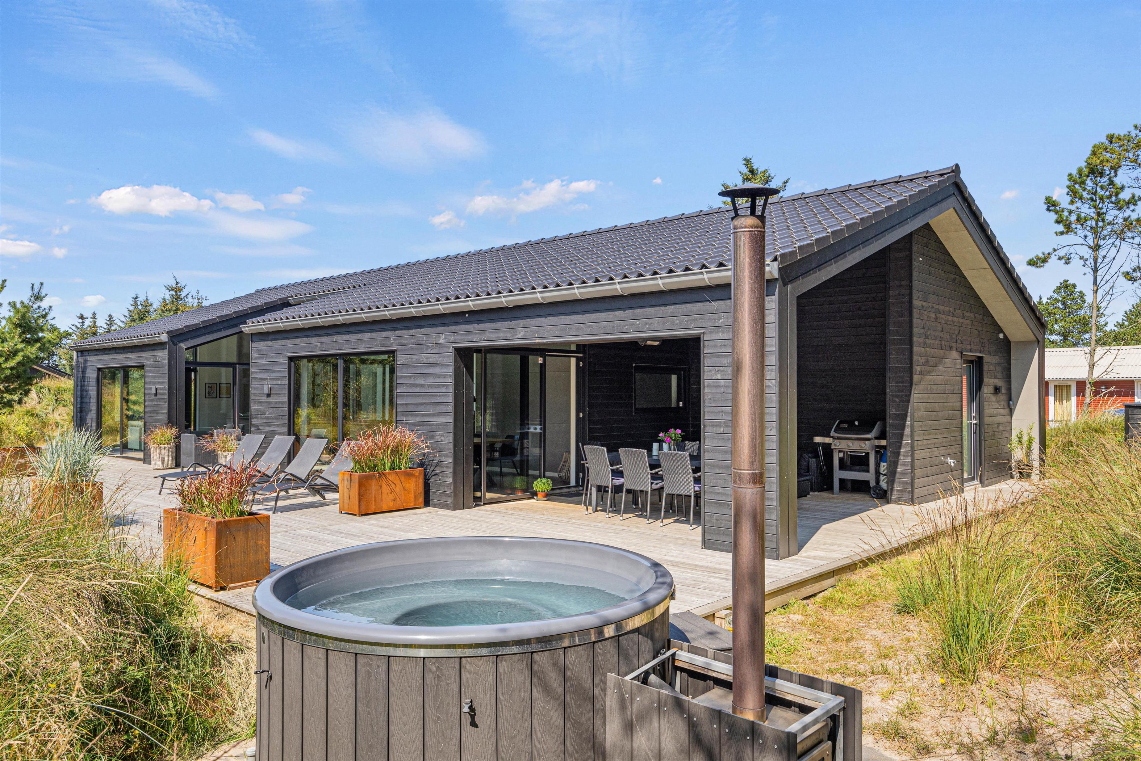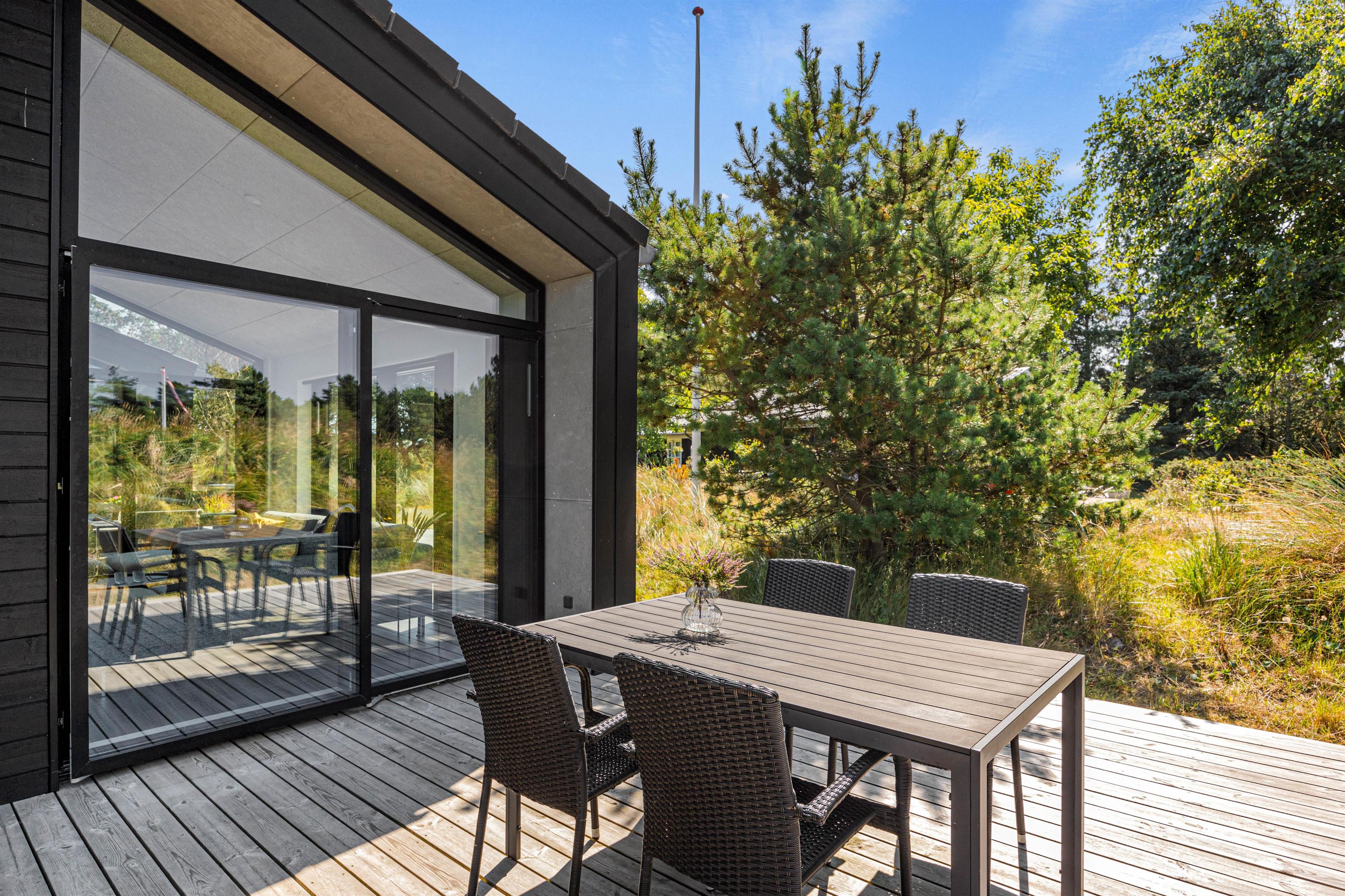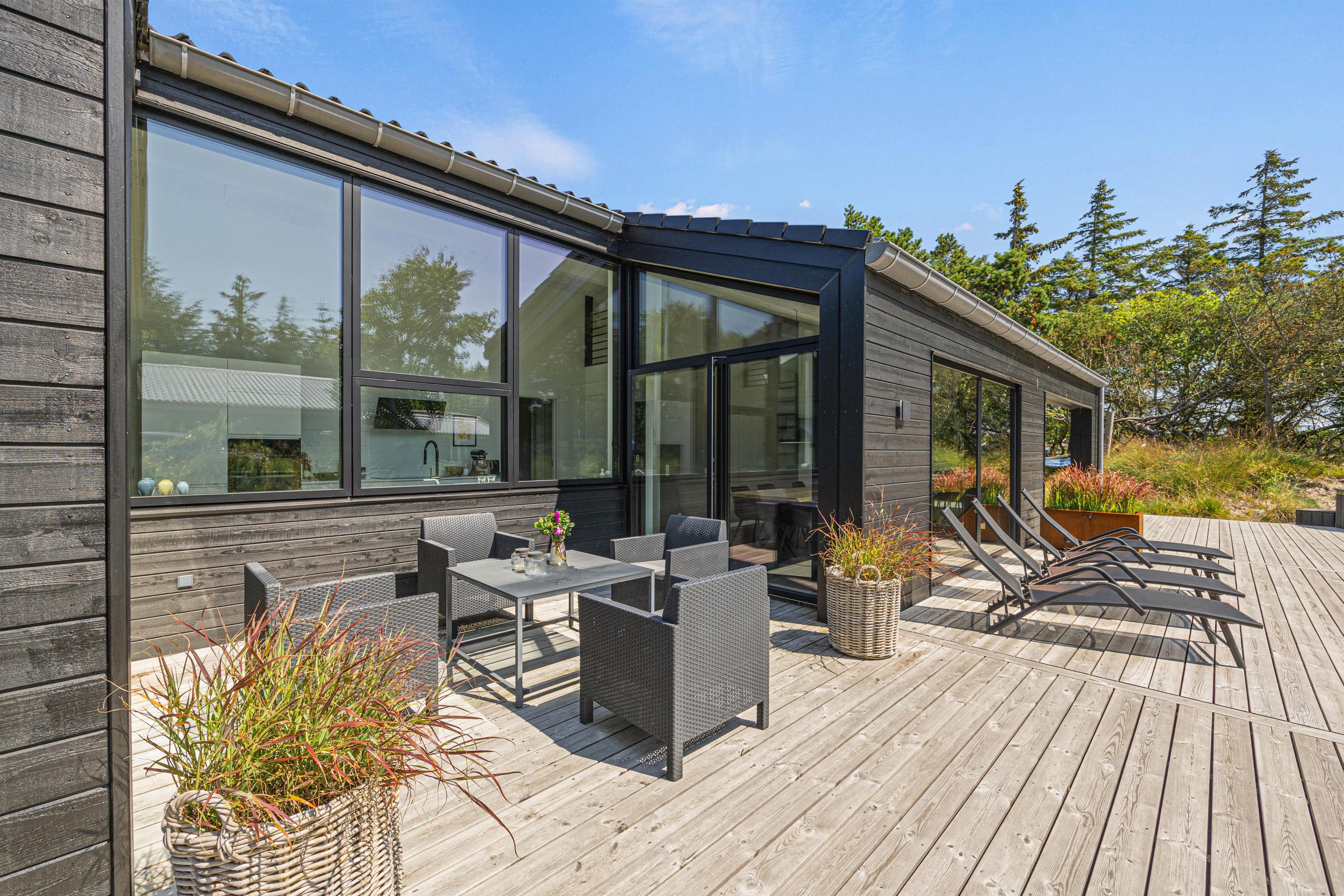 Et moderne og dejligt sommerhus til 8 gæster. En ren og minimalistisk indretning og de store smukke vinduer inviterer lyset indenfor og skaber den rette atmosfære. Udenfor venter jer en lækker overdækket træterrasse med loungeområde og et varmt vildmarksbad.