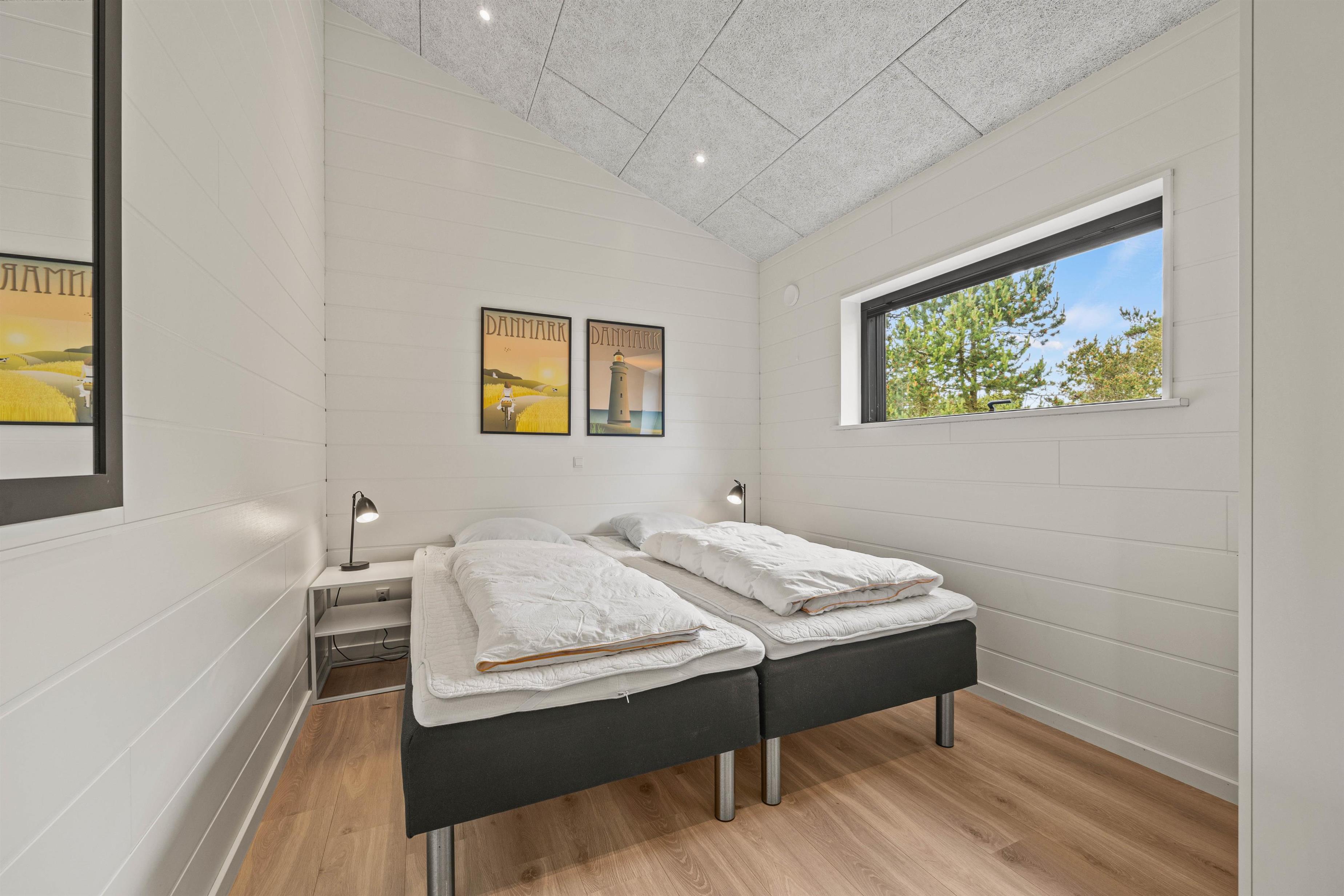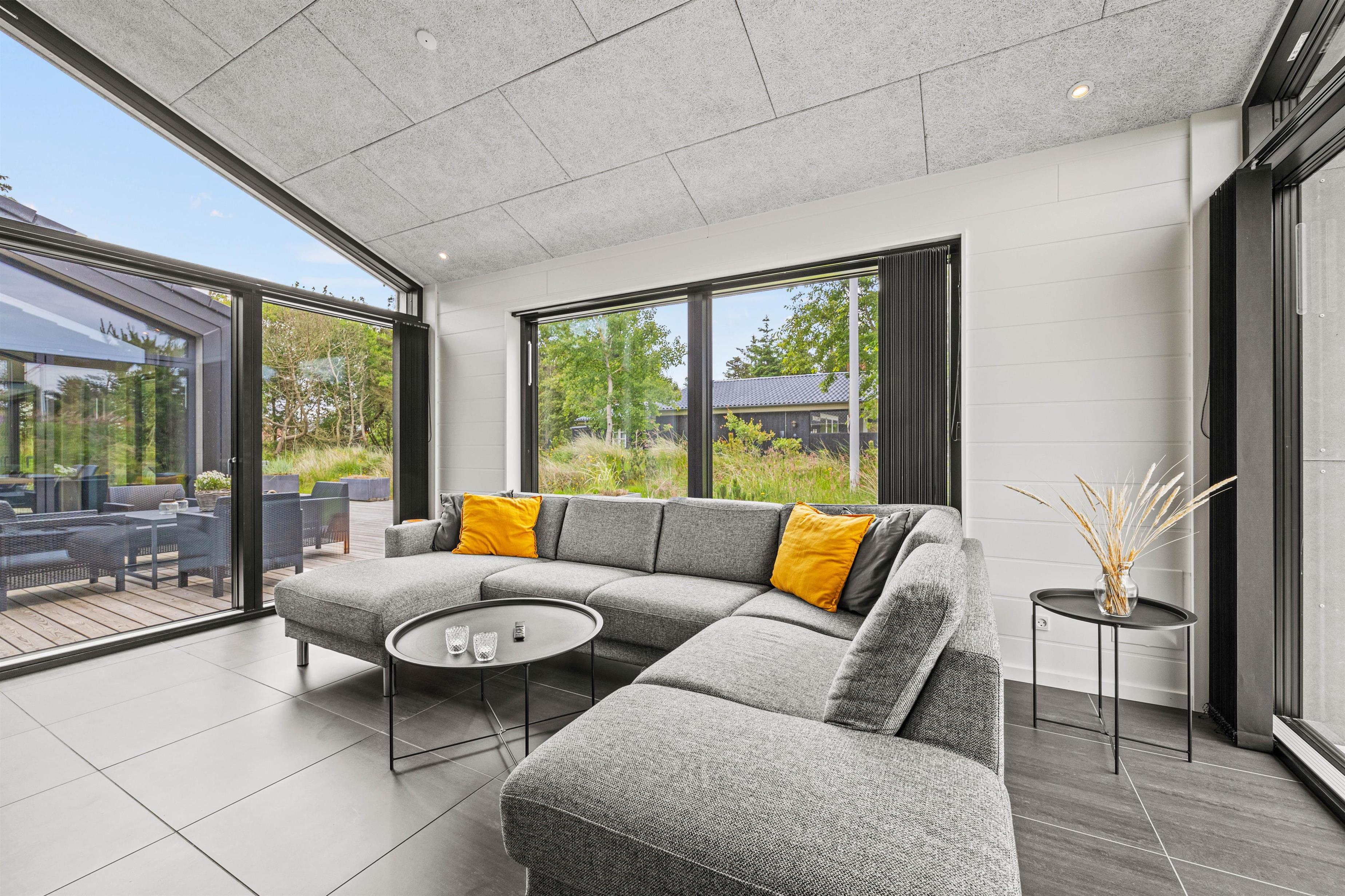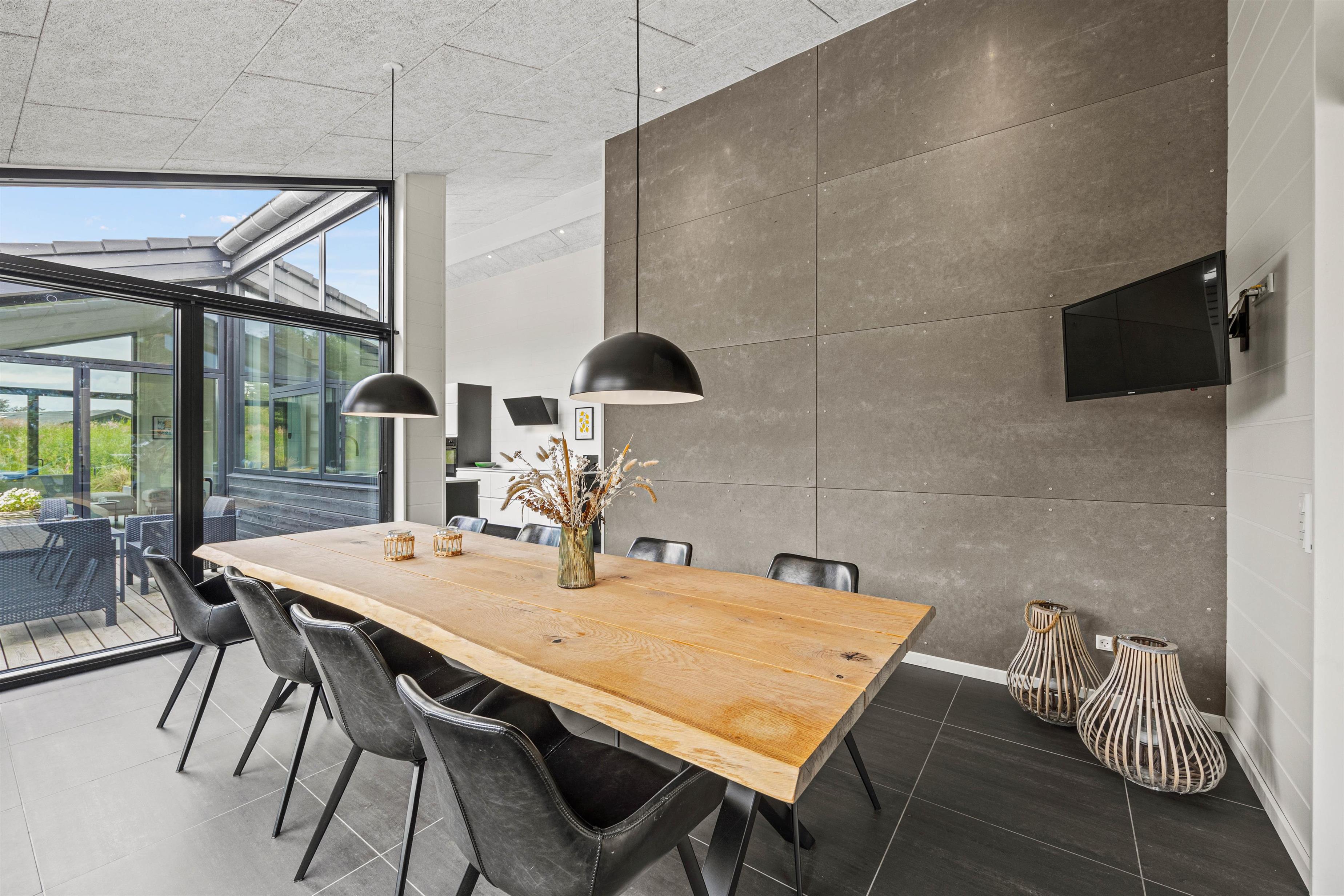 Et moderne og dejligt sommerhus til 8 gæster. En ren og minimalistisk indretning og de store smukke vinduer inviterer lyset indenfor og skaber den rette atmosfære. Udenfor venter jer en lækker overdækket træterrasse med loungeområde og et varmt vildmarksbad.