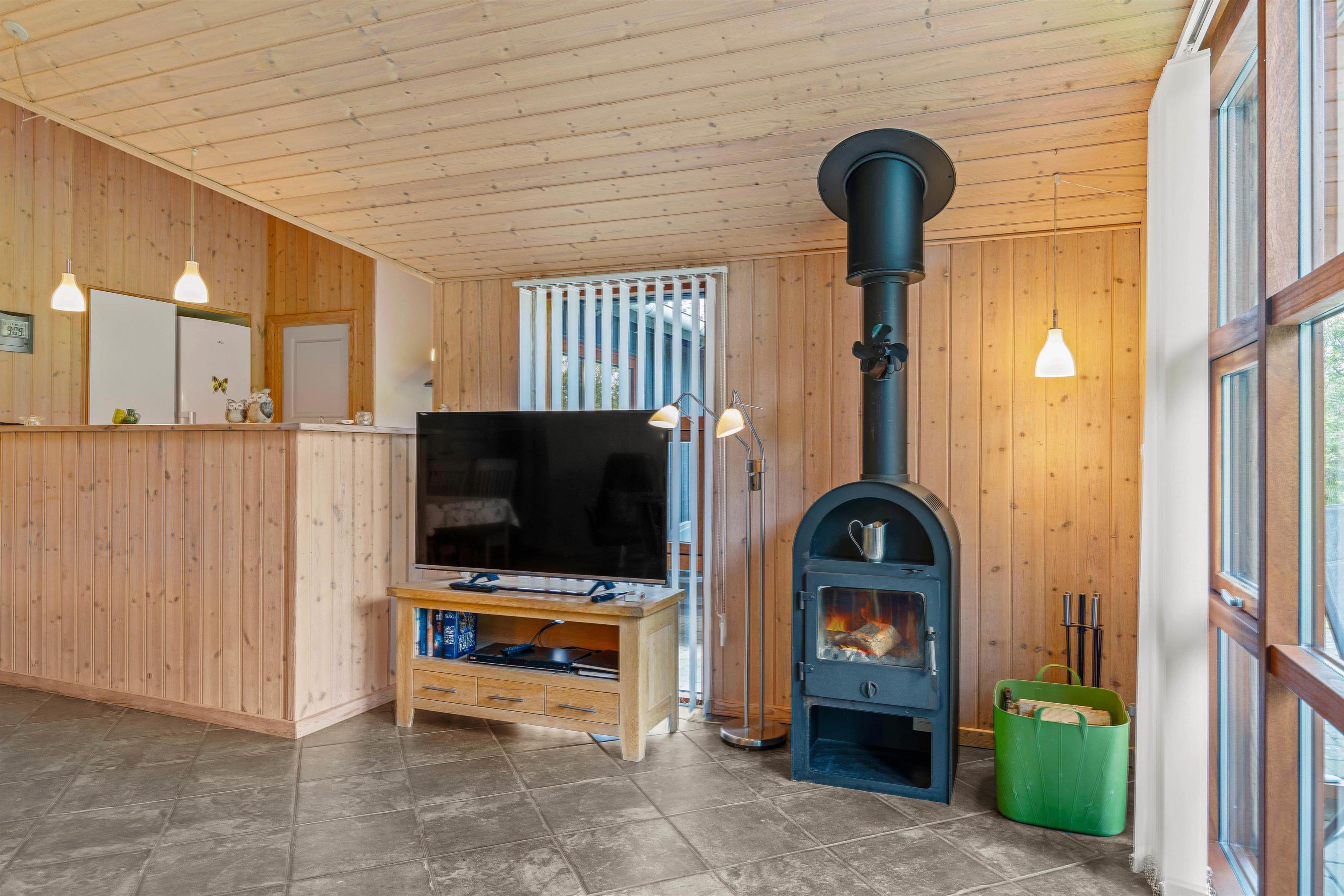 Der er danske tv-kanaler i sommerhuset, så efter en begivenhedsrig feriedag kan I slå jer ned i sofaen og nyde en hyggelig aften med film og popcorn. I stuen sørger brændeovnen for en ekstra hyggelig feriestemning og naturligvis også en god varme på en kølig efterårsdag. I kan med fordel også benytte jer af den energibesparende varmepumpe til et behageligt indeklima.