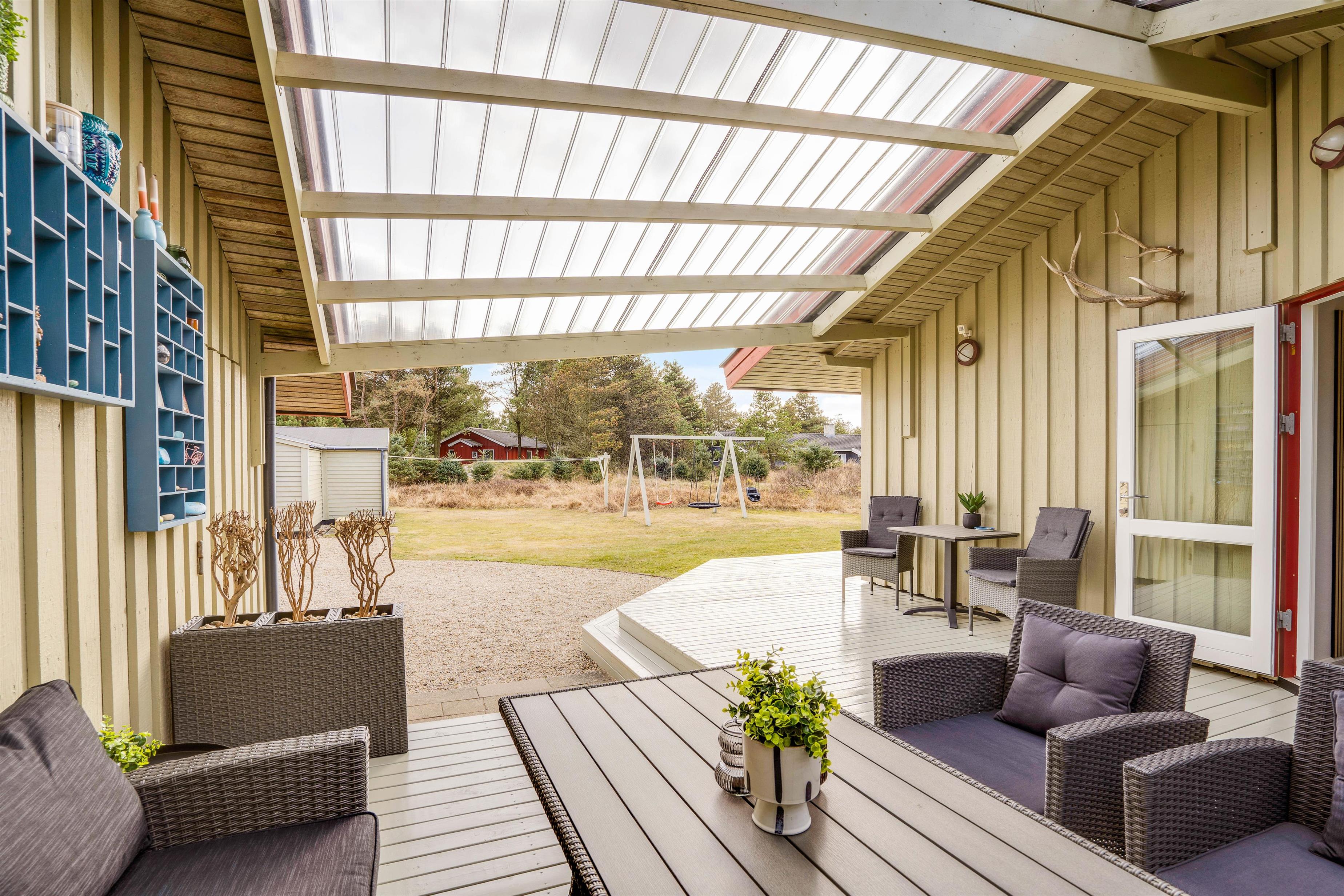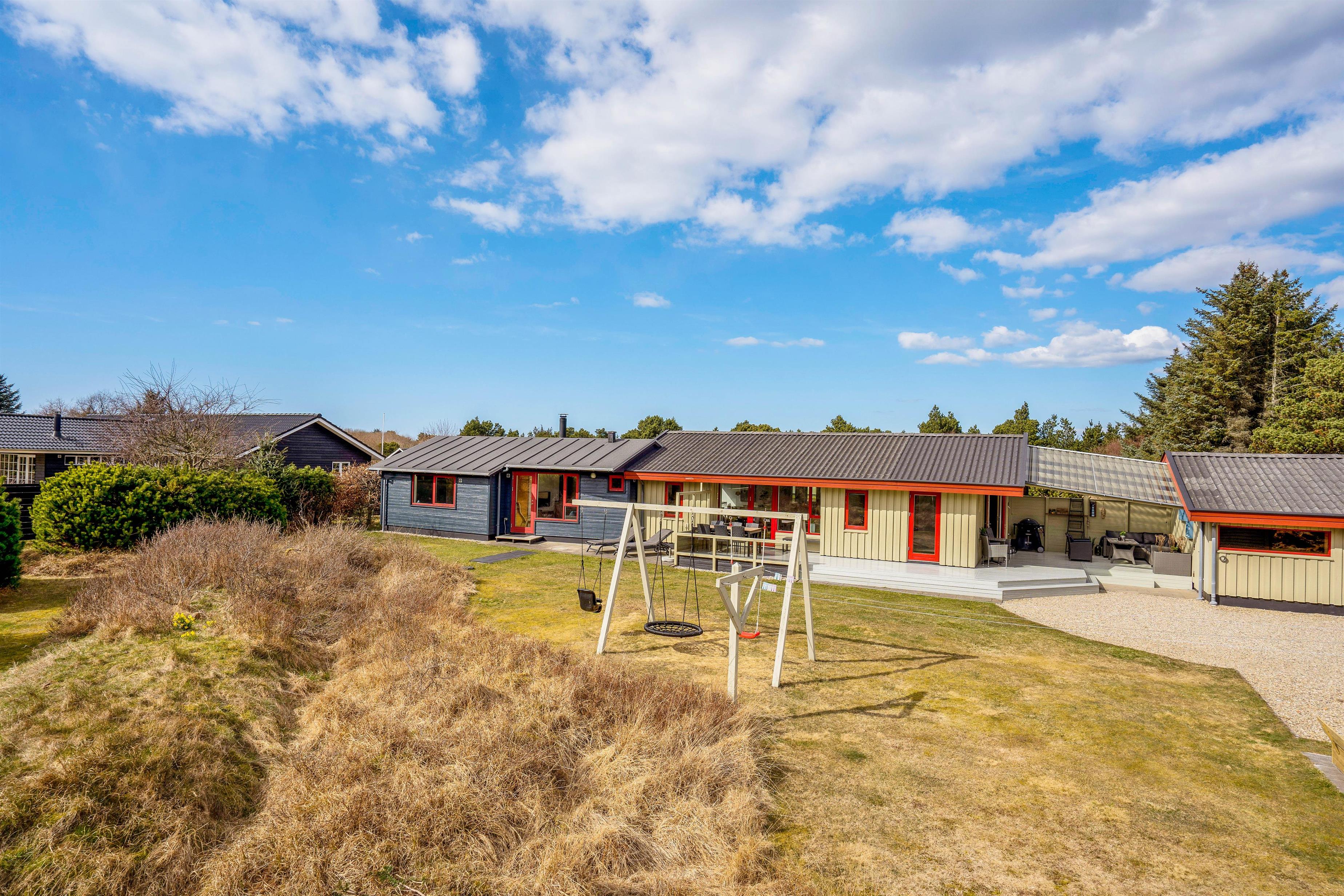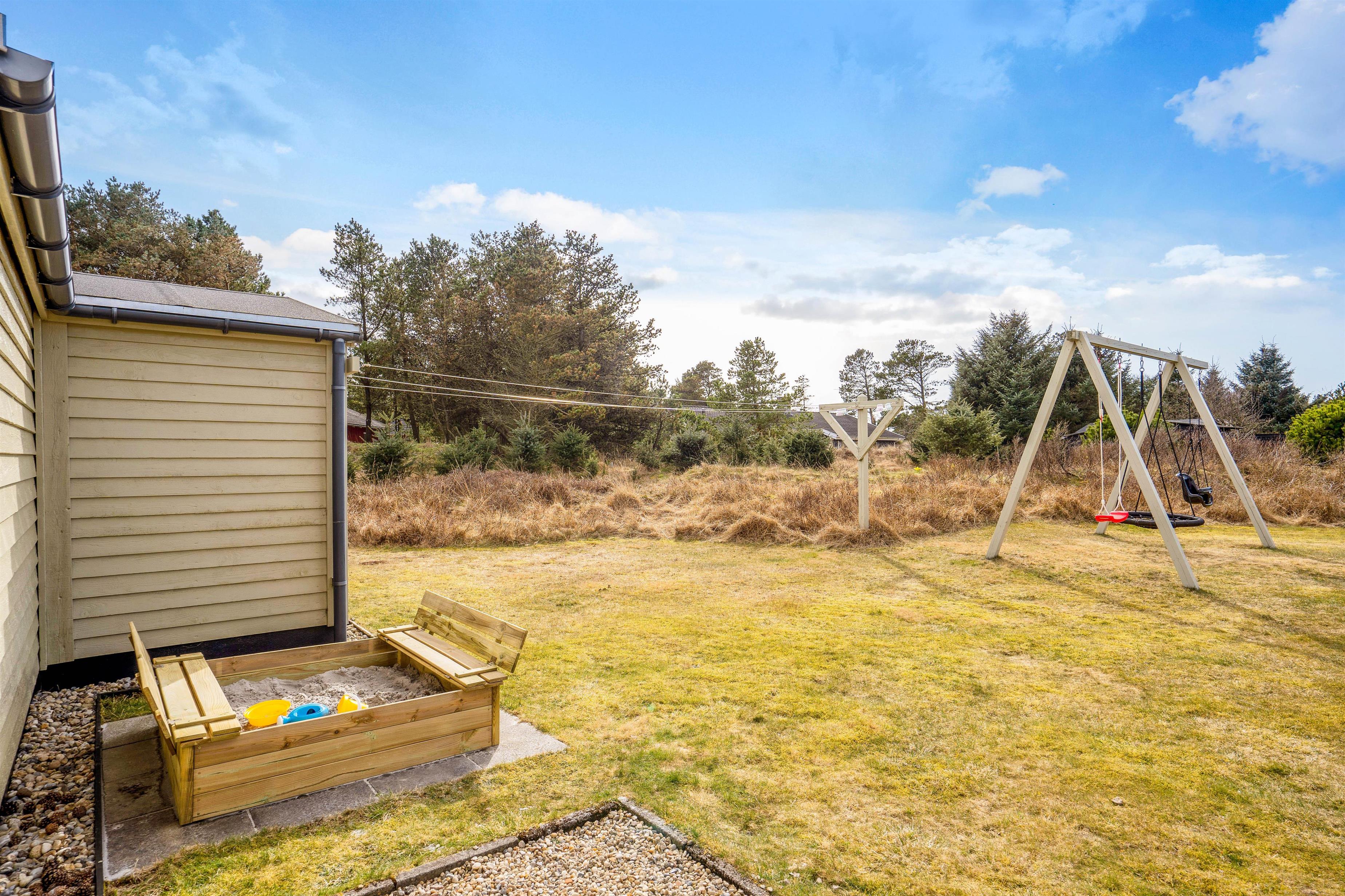 På terrassen er der rig mulighed for, at I kan slappe af i havemøbler og liggestole på et godt spot i solen. Mens I slapper af og nyder ferien på terrassen, kan I holde øje med børnene, der leger i haven, hvor der både er en sandkasse og et gyngestativ til dem.