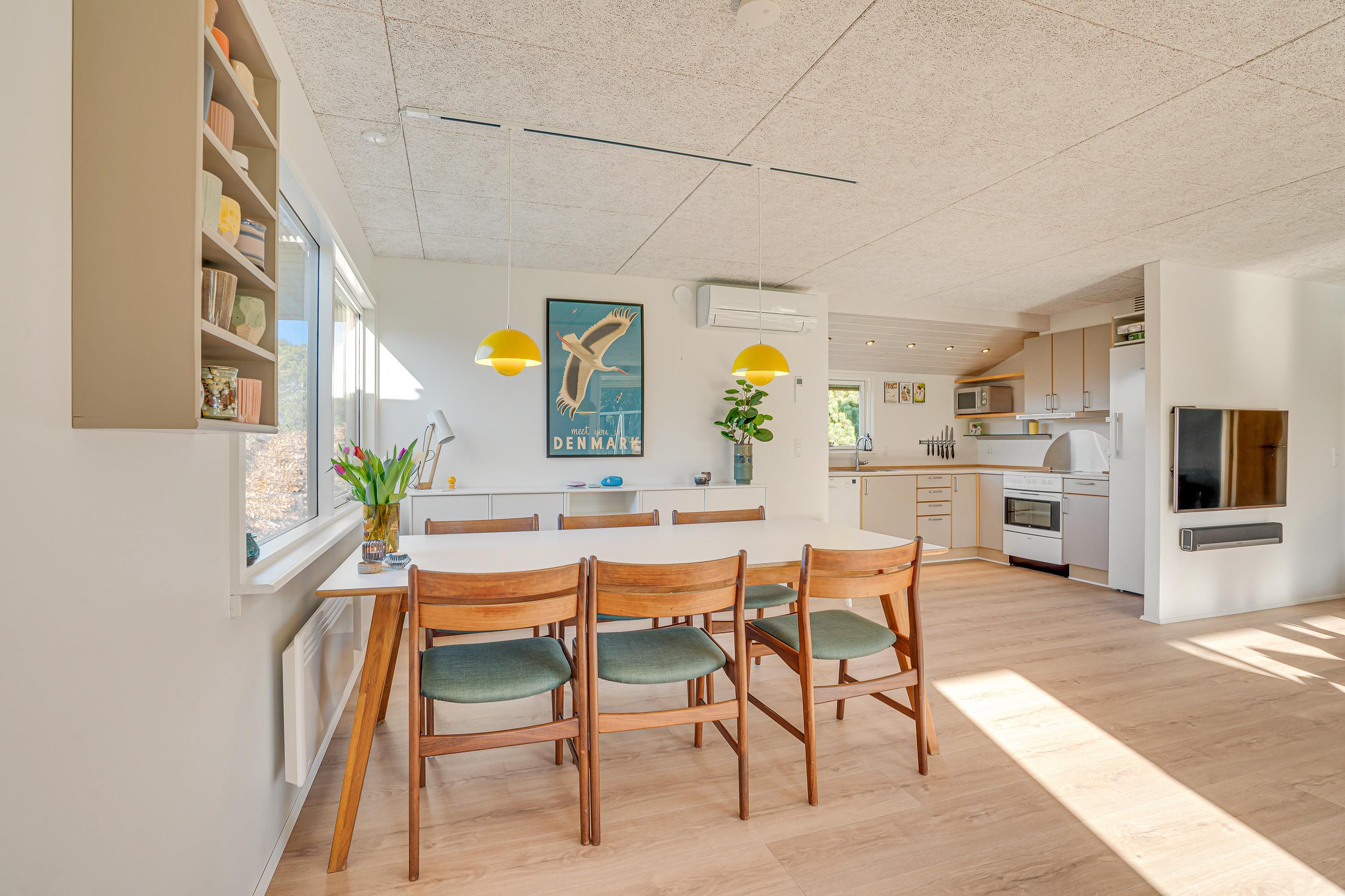 Det store samlingspunkt i sommerhuset er alrummet, der forener køkken, stue og spiseplads. Her kan I nyde hinandens selskab, selv når nogle står for madlavningen i køkkenet, og andre ser film i stuen – alt imens sørger brændeovnen for at sprede varme og hygge. Den lyse indretning i rummet bliver på bedste vis komplementeret af det skønne lysindfald, der tilsammen skaber en fantastisk ferieatmosfære.