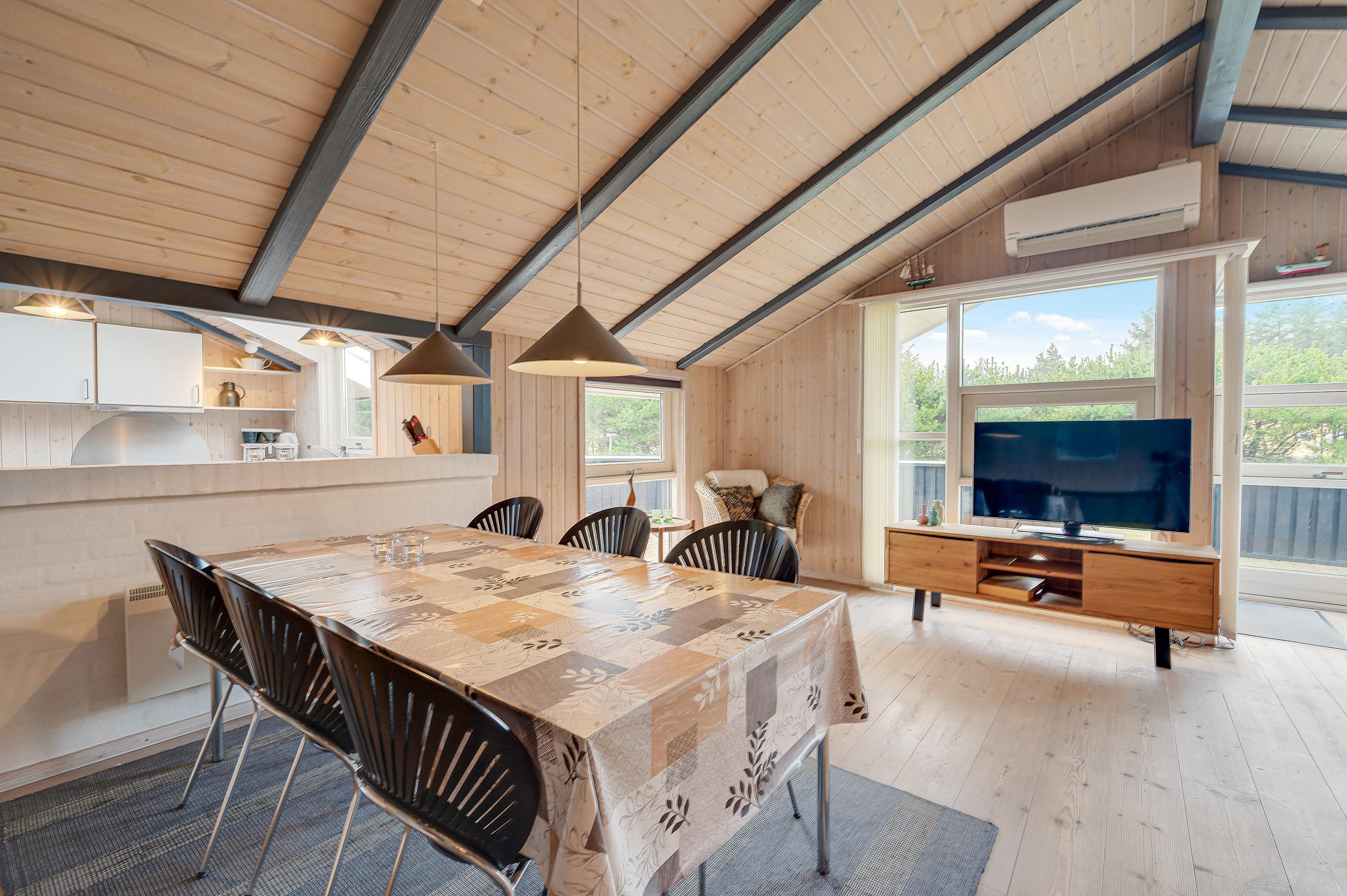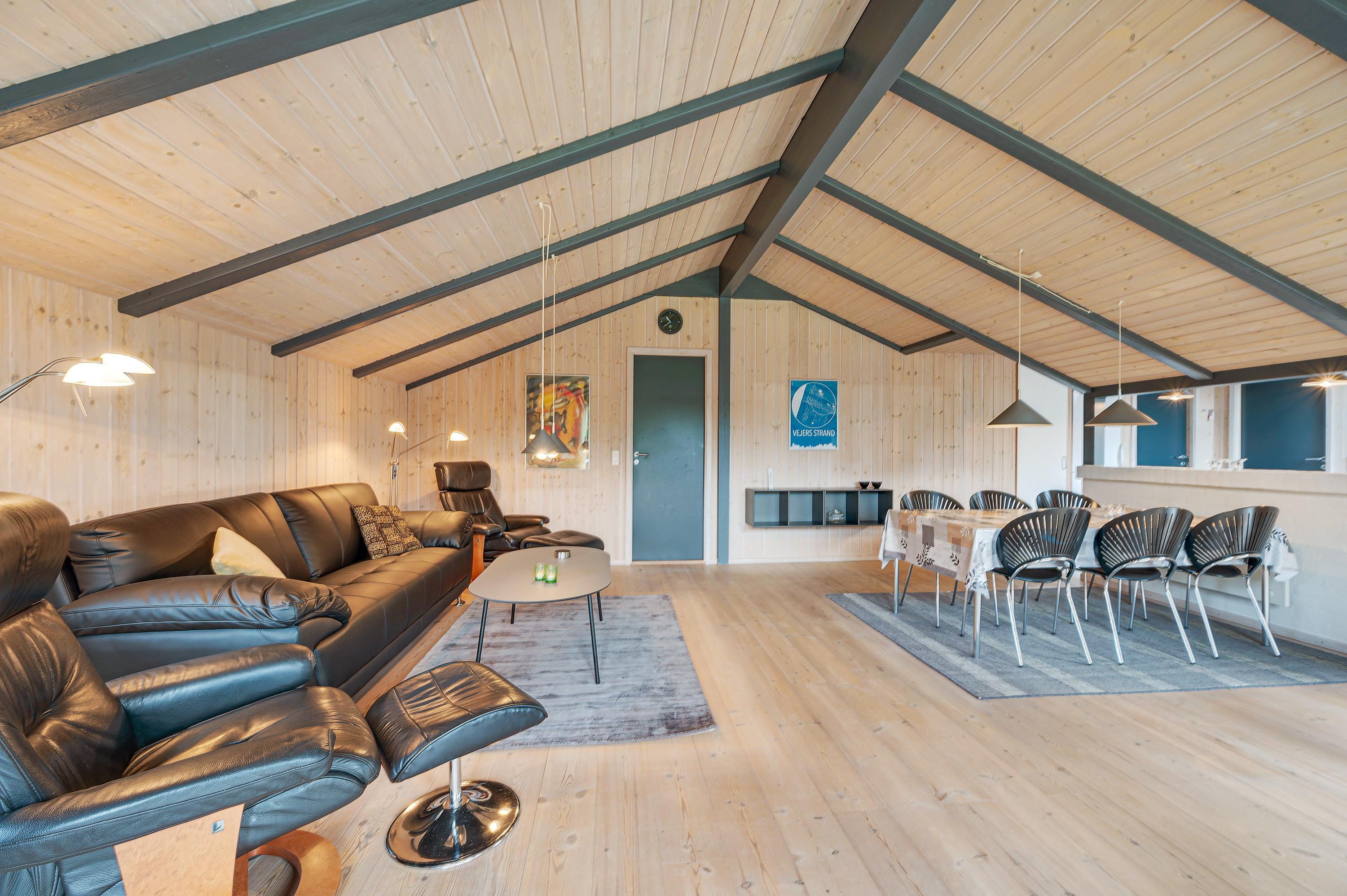 Fra det øjeblik, I træder ind ad døren i dette smagfuldt indrettede hus med det lyse træværk og de mørke spær, vil feriestemningen sænke sig over jer.