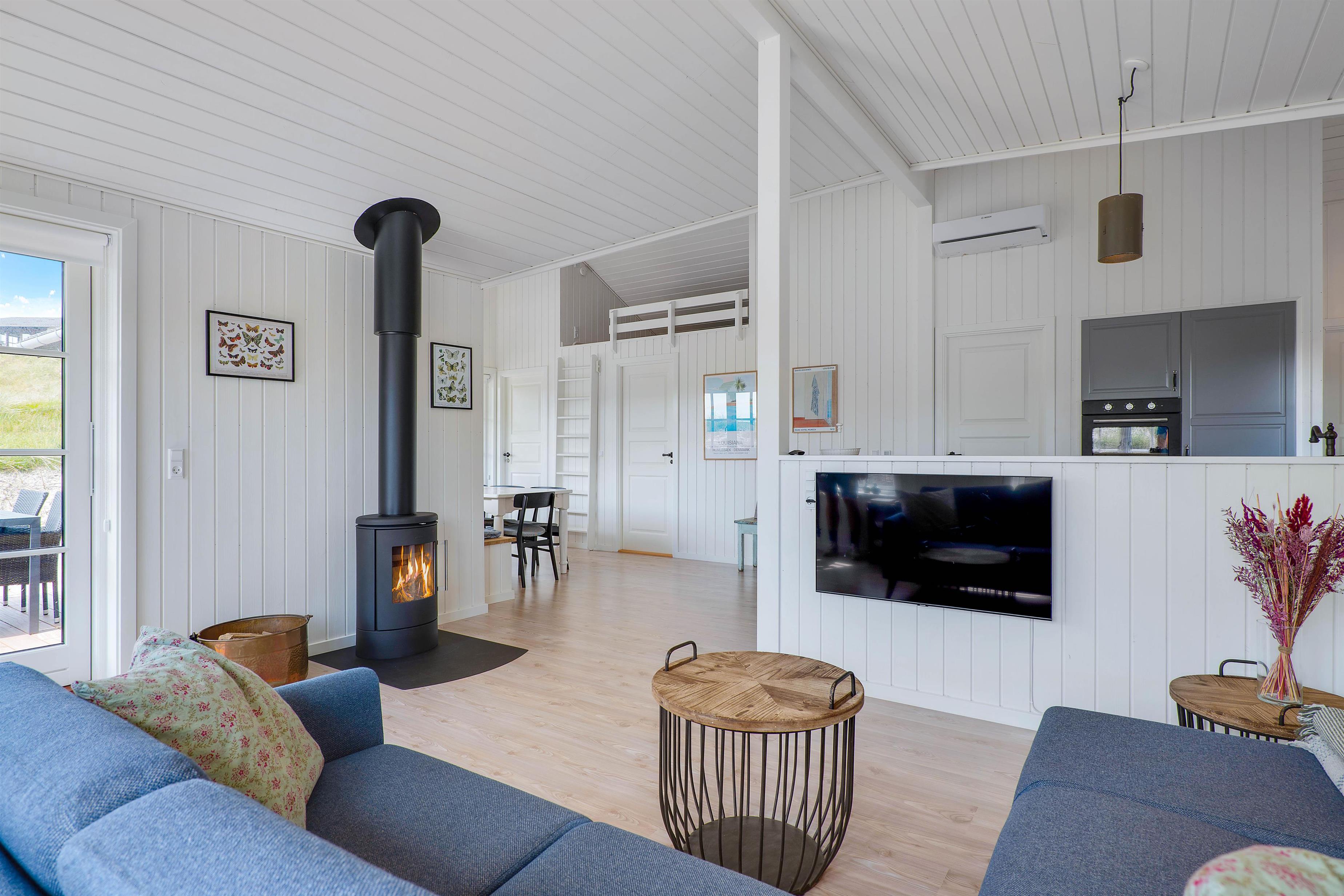 Hyggelige feriestunder får I med garanti masser af i opholdsrummet, der forener både køkken, spisestue og stue. I de kølige måneder står brændeovnen i sofahjørnet klar til at sprede hyggelig stemning og god varme. Omvendt byder sommerhalvåret helt sikkert på mange dejlige solskinsdage, og her er det meget praktisk, at I har flere udgange til terrassen.