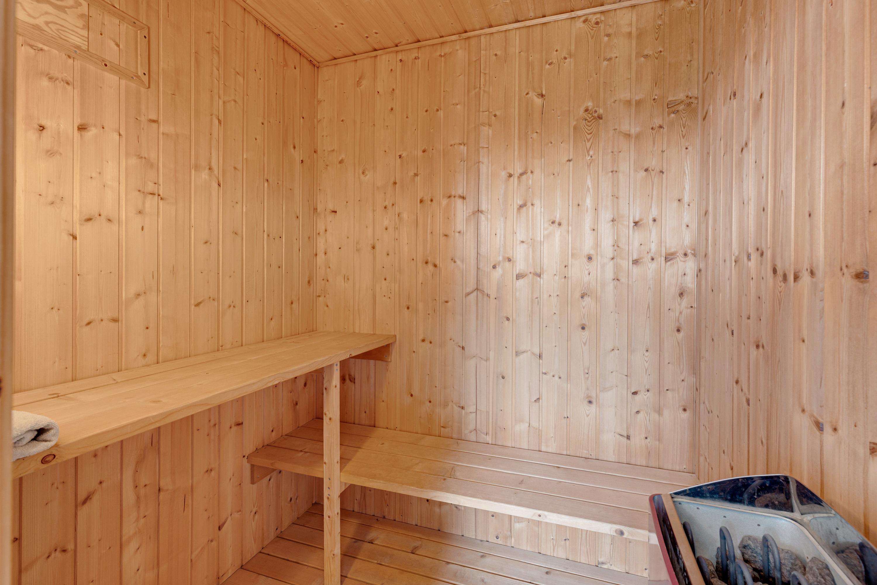 Hyggelig og indbydende indretning med brændeovn og sauna