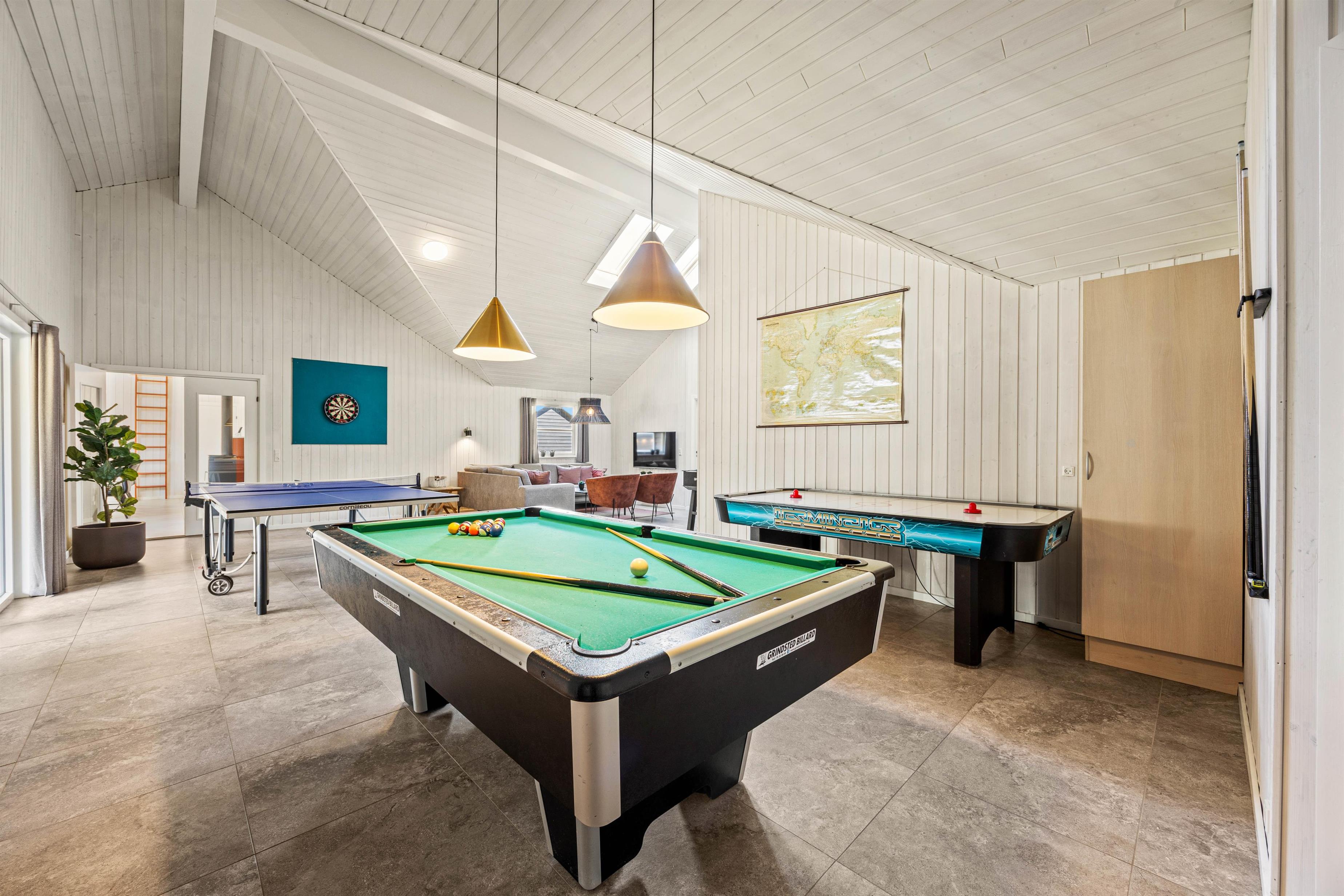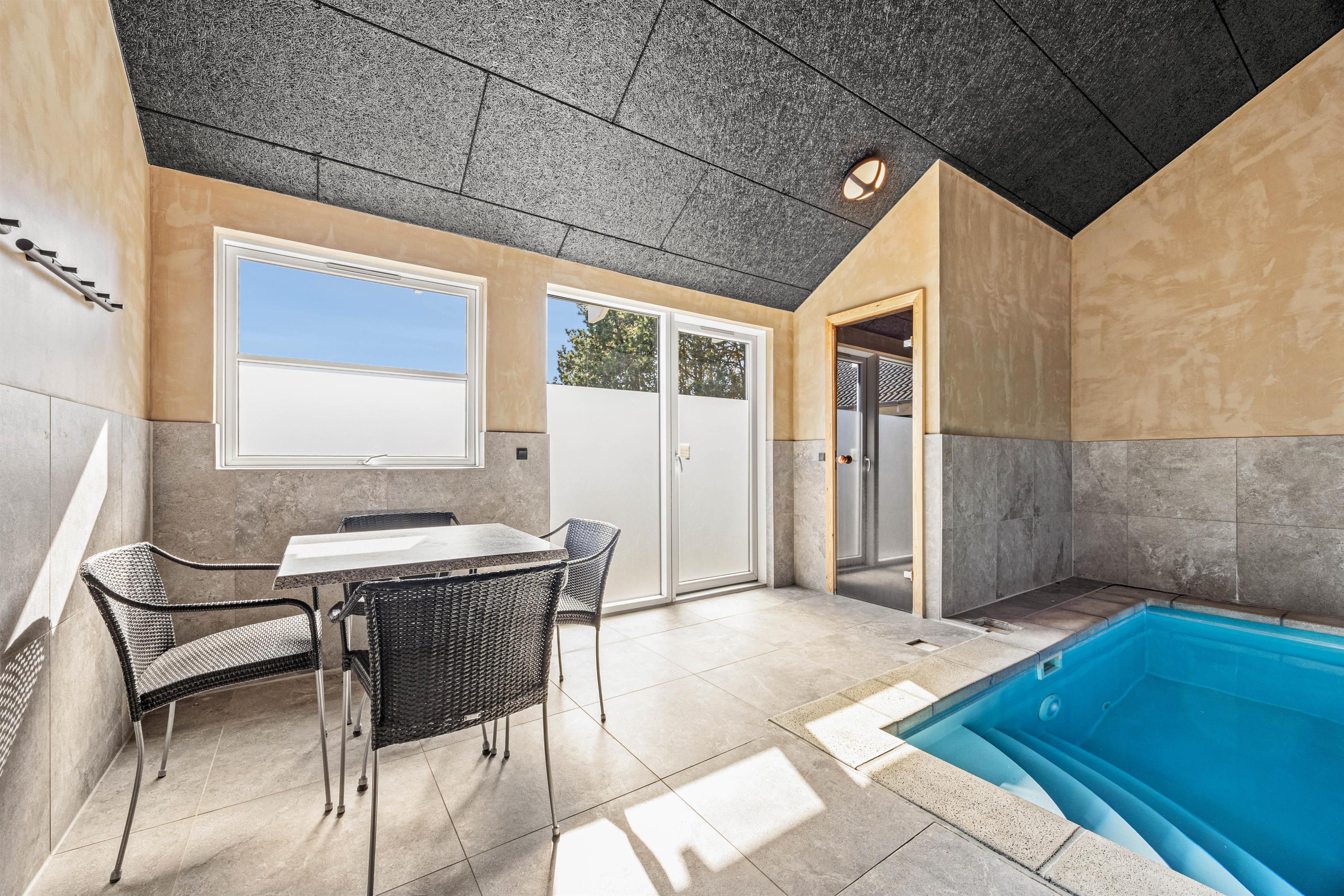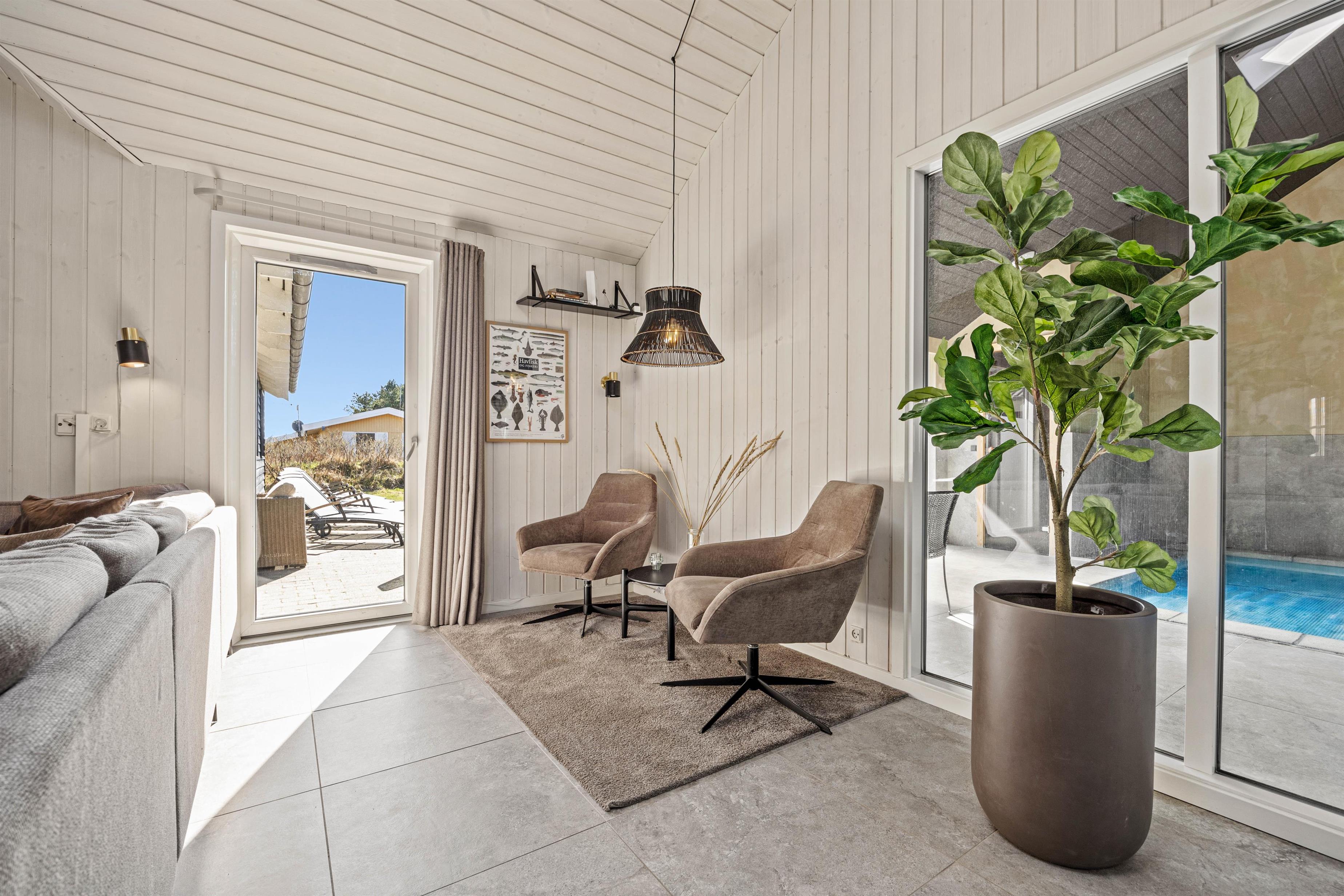 Feriehuset i Vejers er et sandt aktivitetshus, der tilbyder dig og dine medrejsende adskillige muligheder for fritidsaktiviteter. Nyd den fantastiske swimmingpool, eller træk dig tilbage til saunaen eller spabad for at forkæle krop og sjæl. For fysisk aktivitet står billard, bordtennis og bordfodbold til din rådighed. Du kan også være aktiv udendørs på den store grund på 2957 m², hvad enten det er til beachvolleyball eller en afslappet grillaften på den overdækkede terrasse.