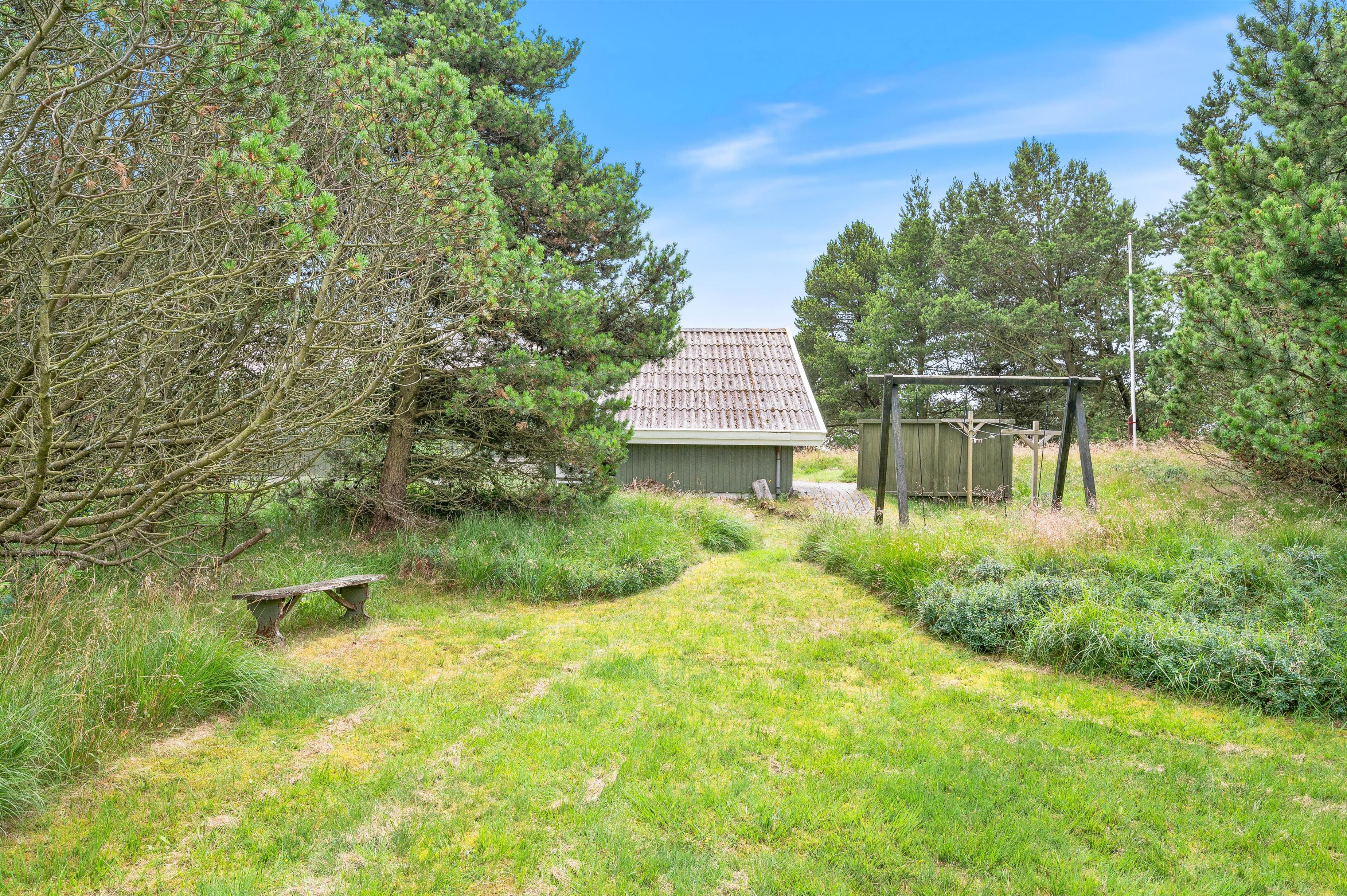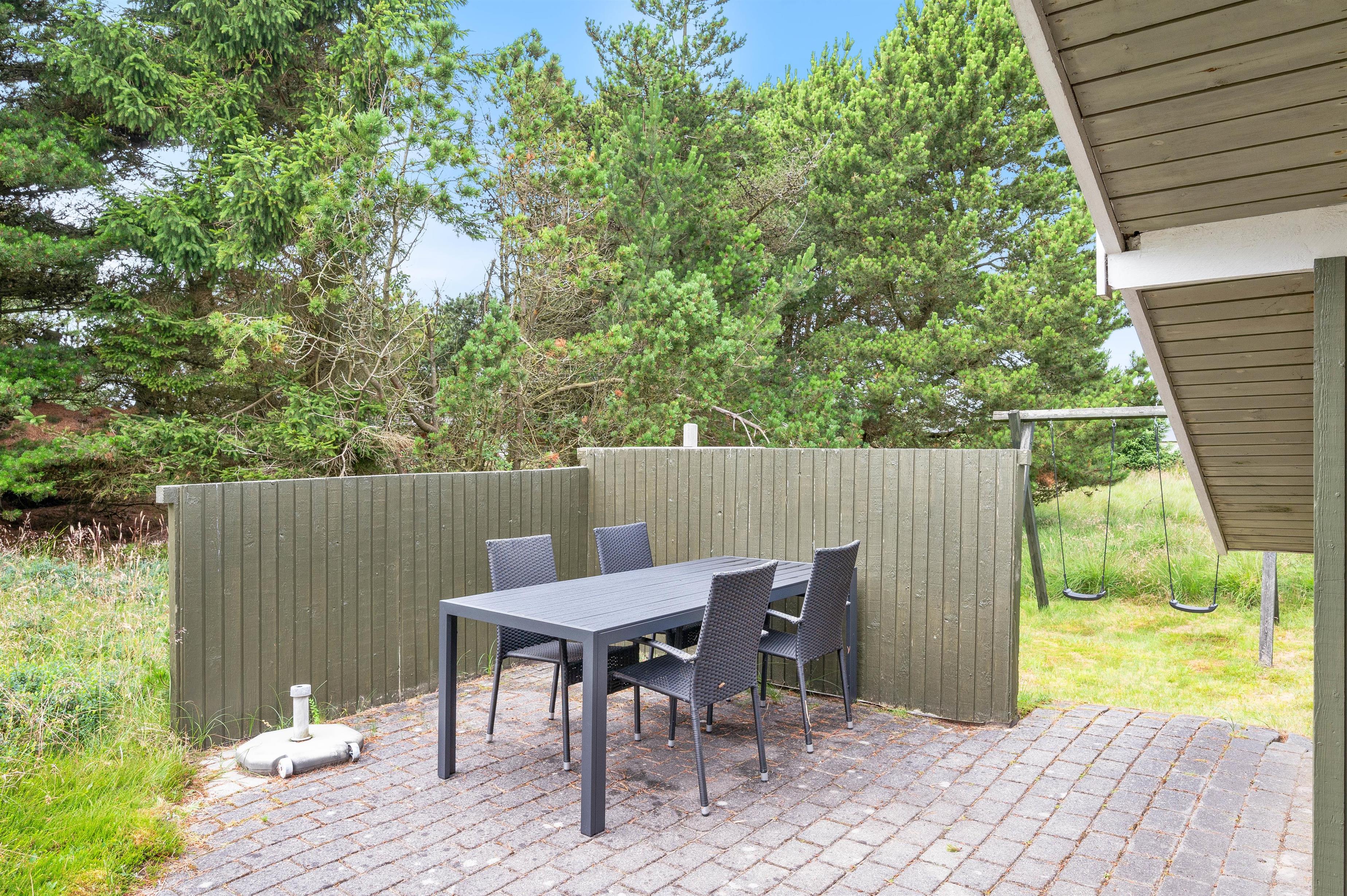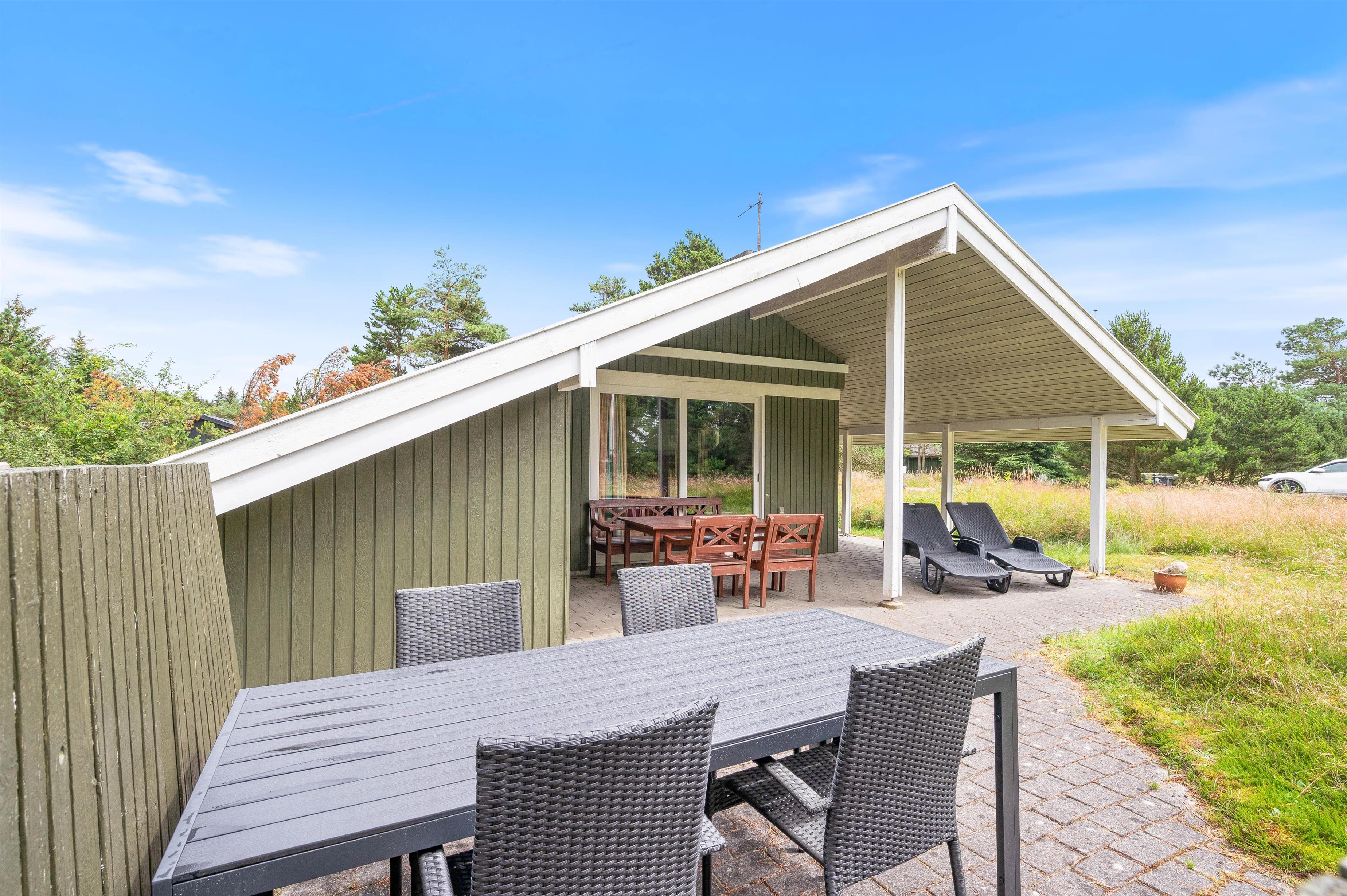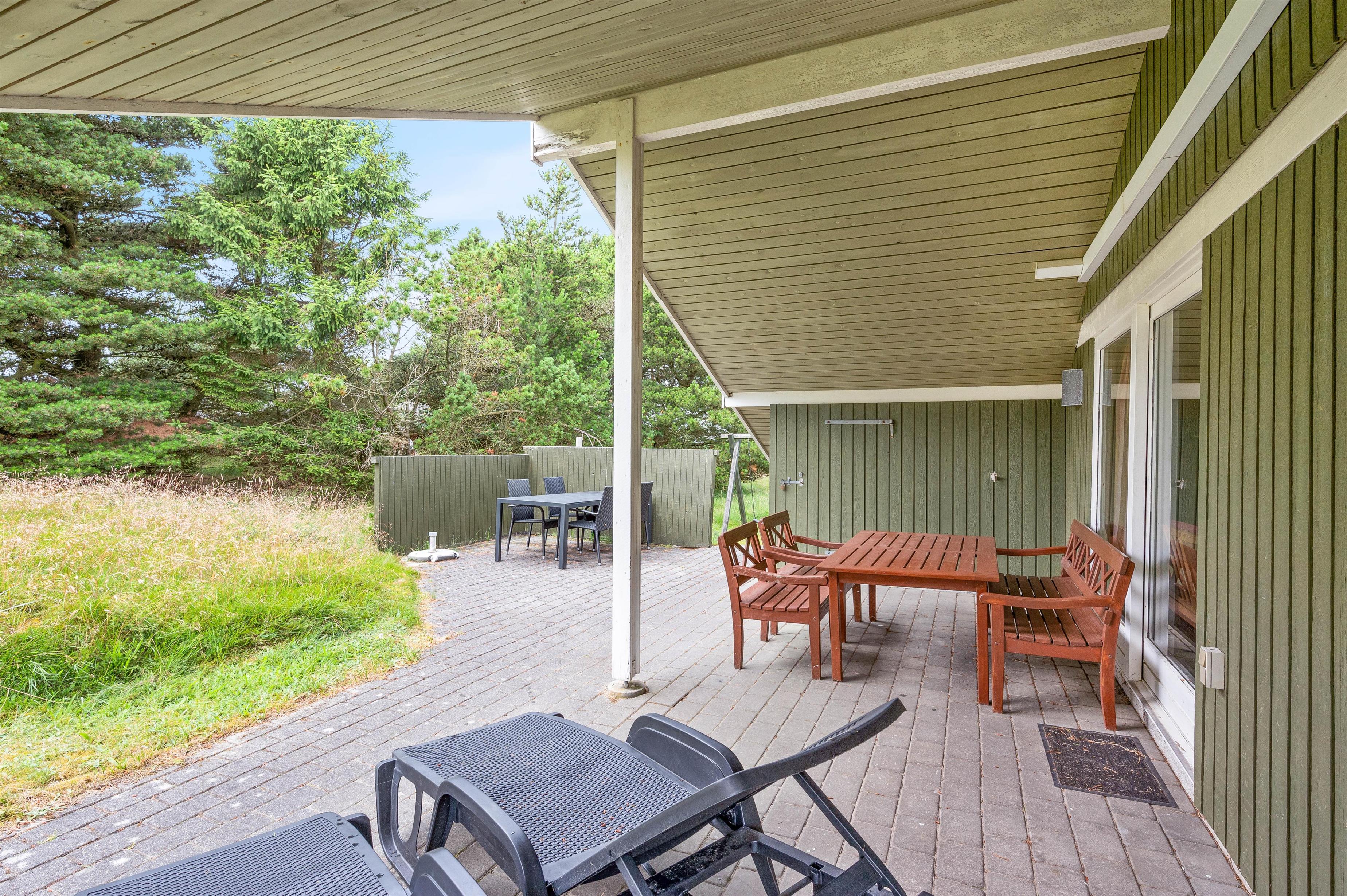 Dette klassiske feriehus ligger på en smuk naturgrund, hvor du kan nyde dine feriedage uforstyrret. Terrassen, som kan tilgås direkte fra stuen, indbyder til afslapning med en god bog i hånden, enten på solsengen eller i havemøblerne.