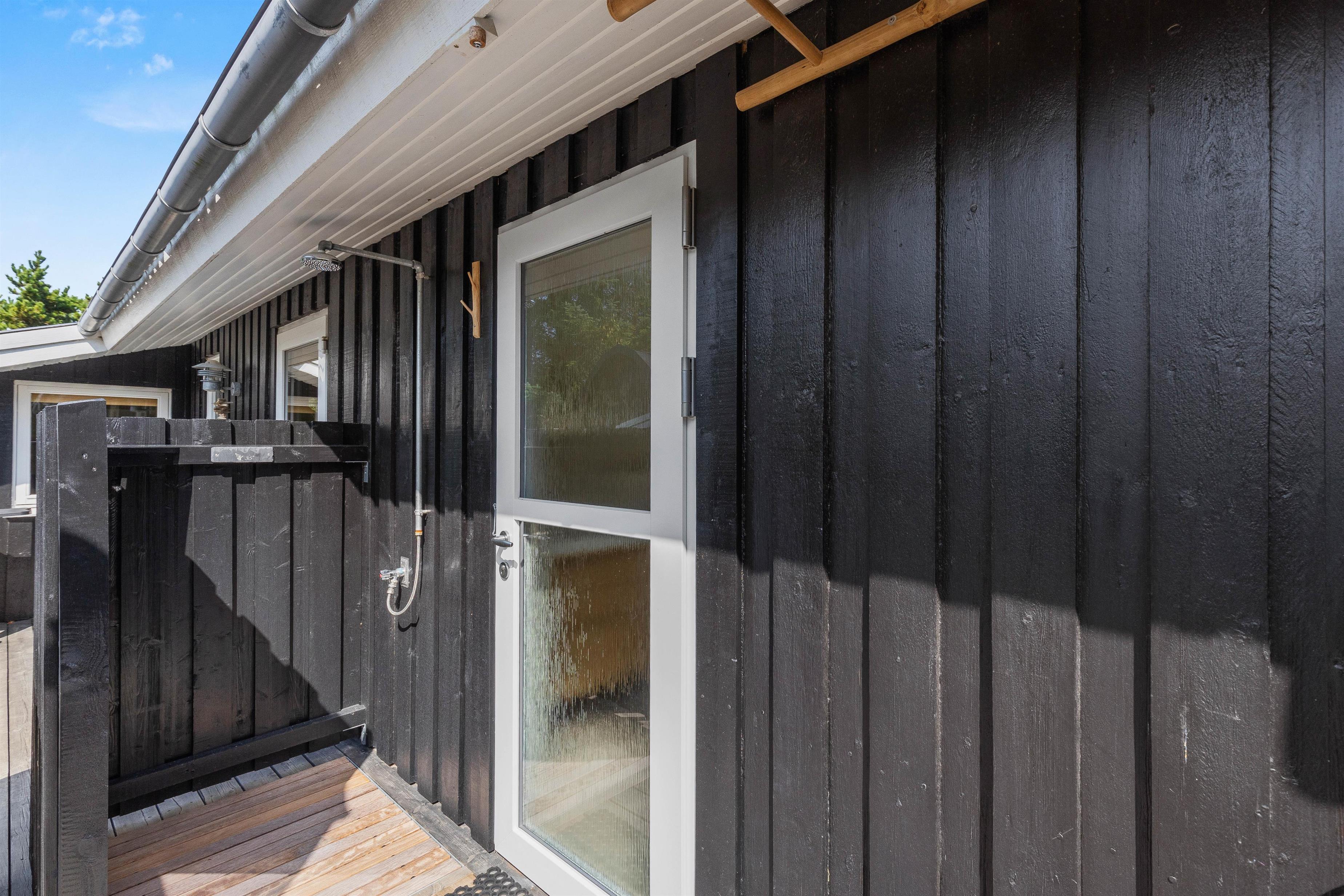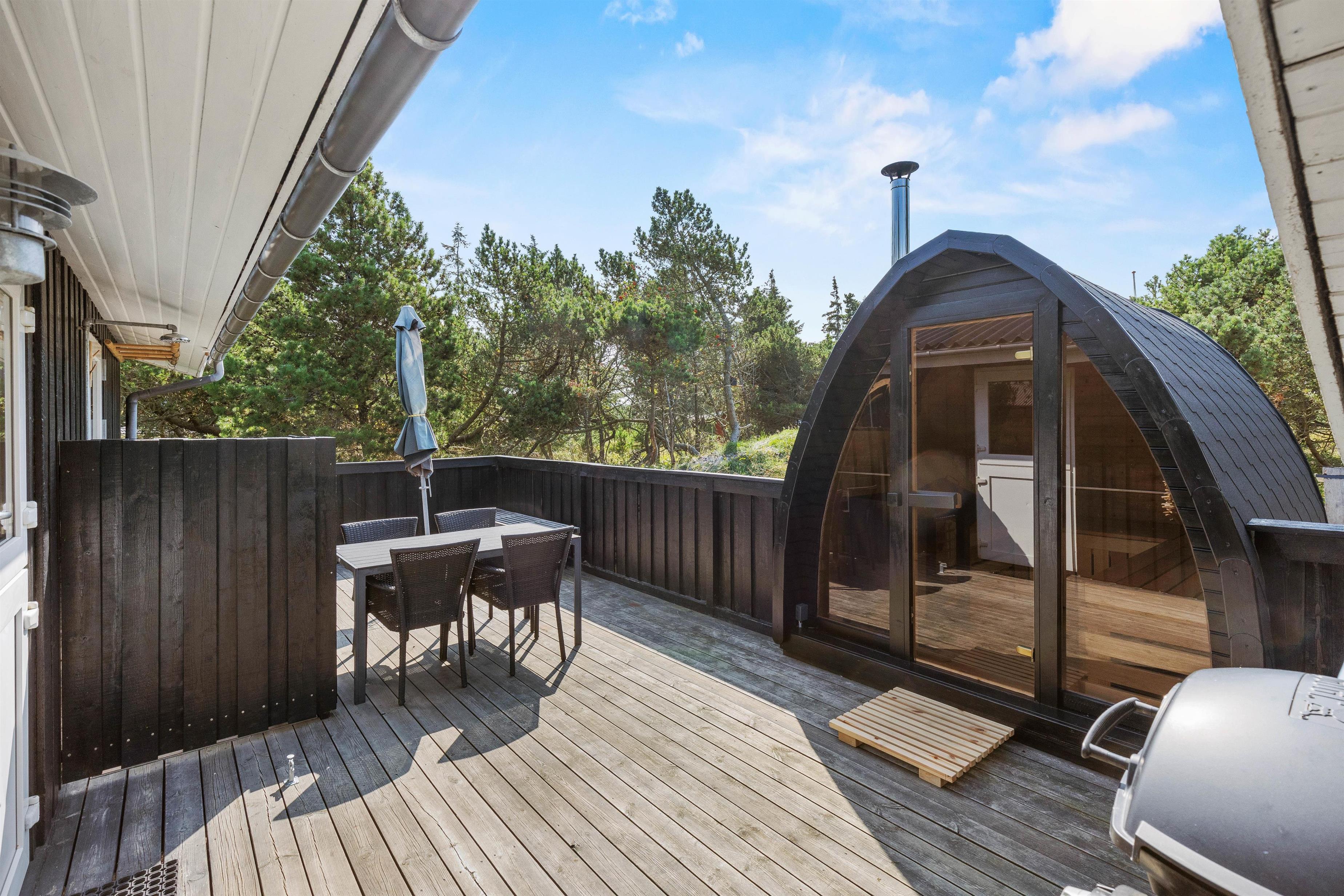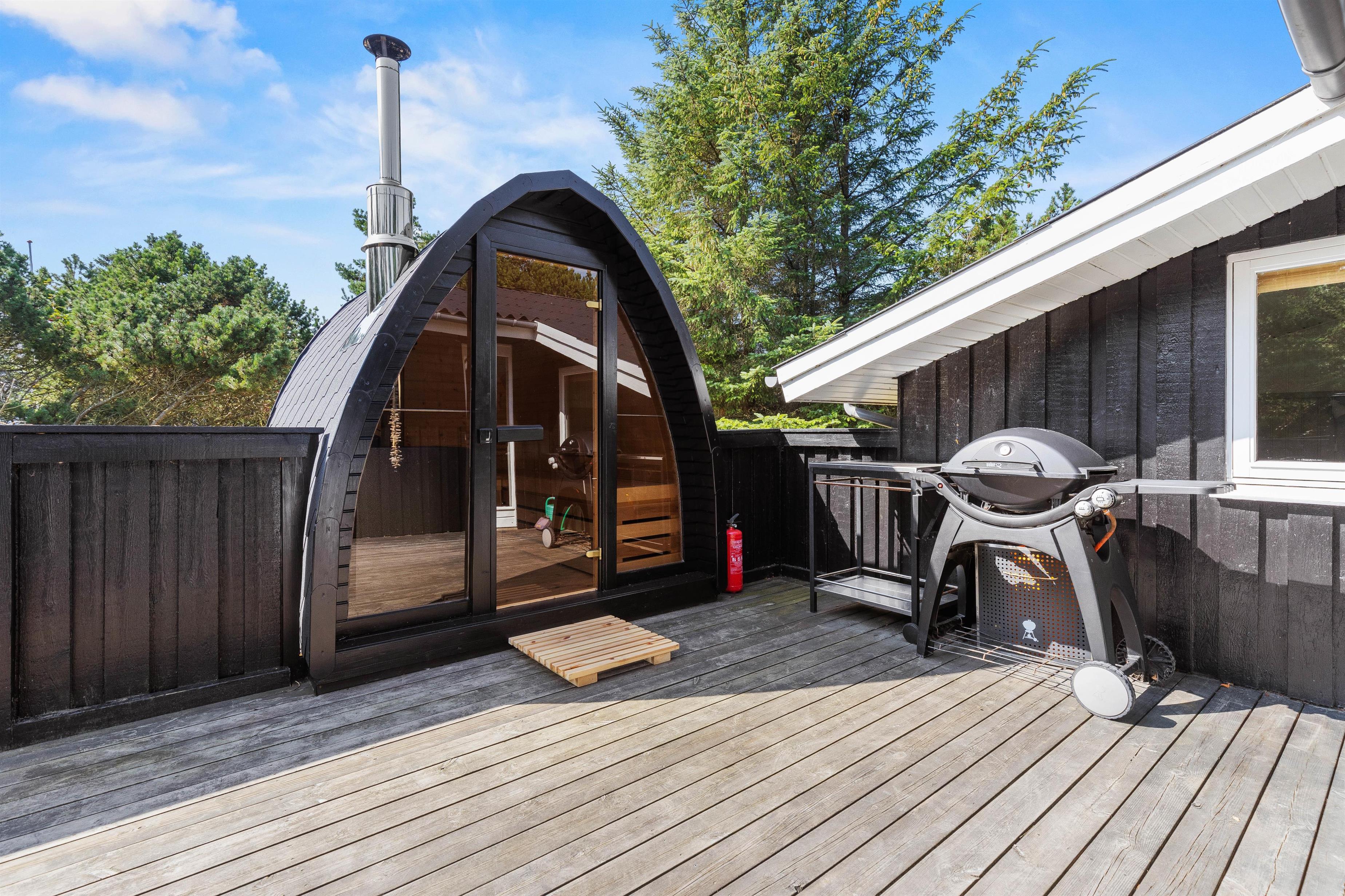 På de lune ferieaftenener kan I tilberede jeres aftensmad på gasgrillen og nyde den på en af terrasserne som en hyggelig afslutning på en dejlig feriedag. Fra feriehusets nye badeværelse er der direkte udgang til terrassen, hvor I kan fuldende dagen med en tur i udesaunaen og et friskt skyld under udebruseren. Udebruser er lukket fra 1. november til 1. april på grund af frostsikring.