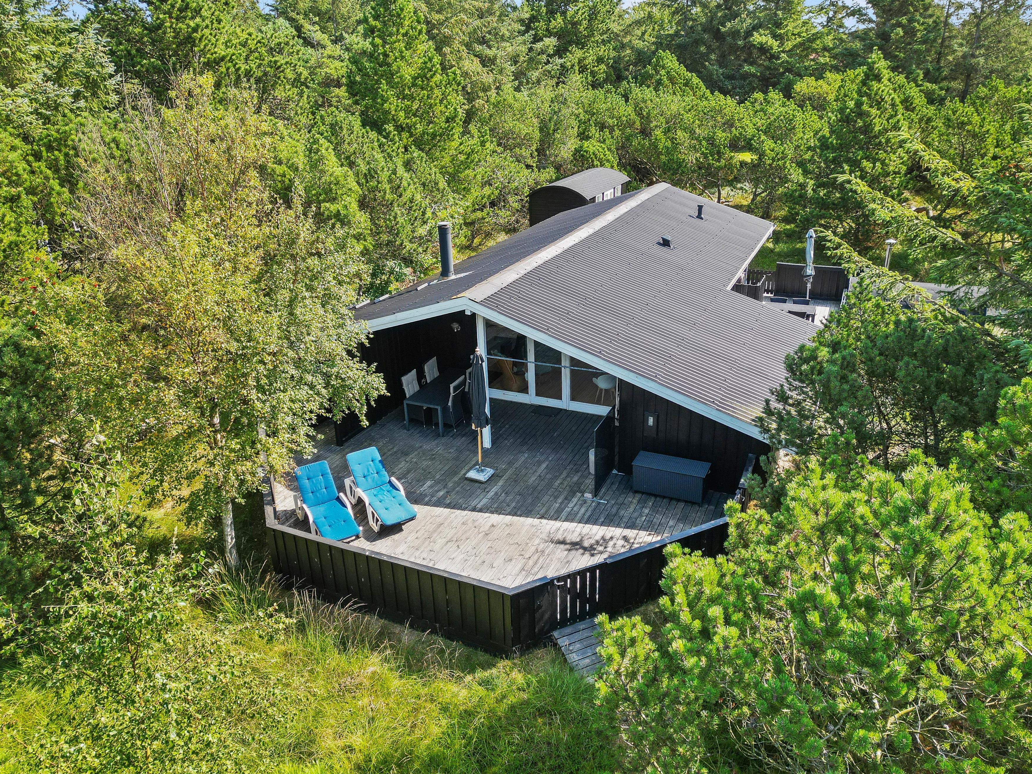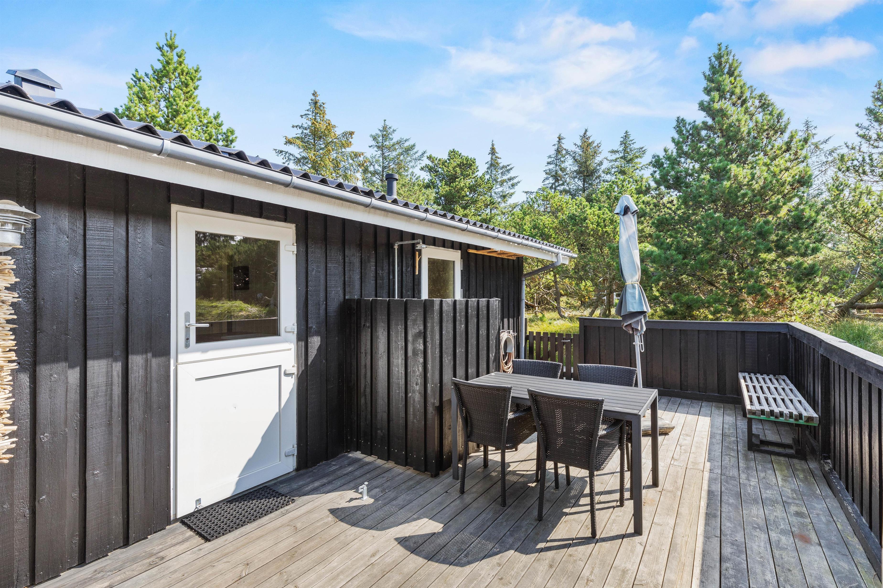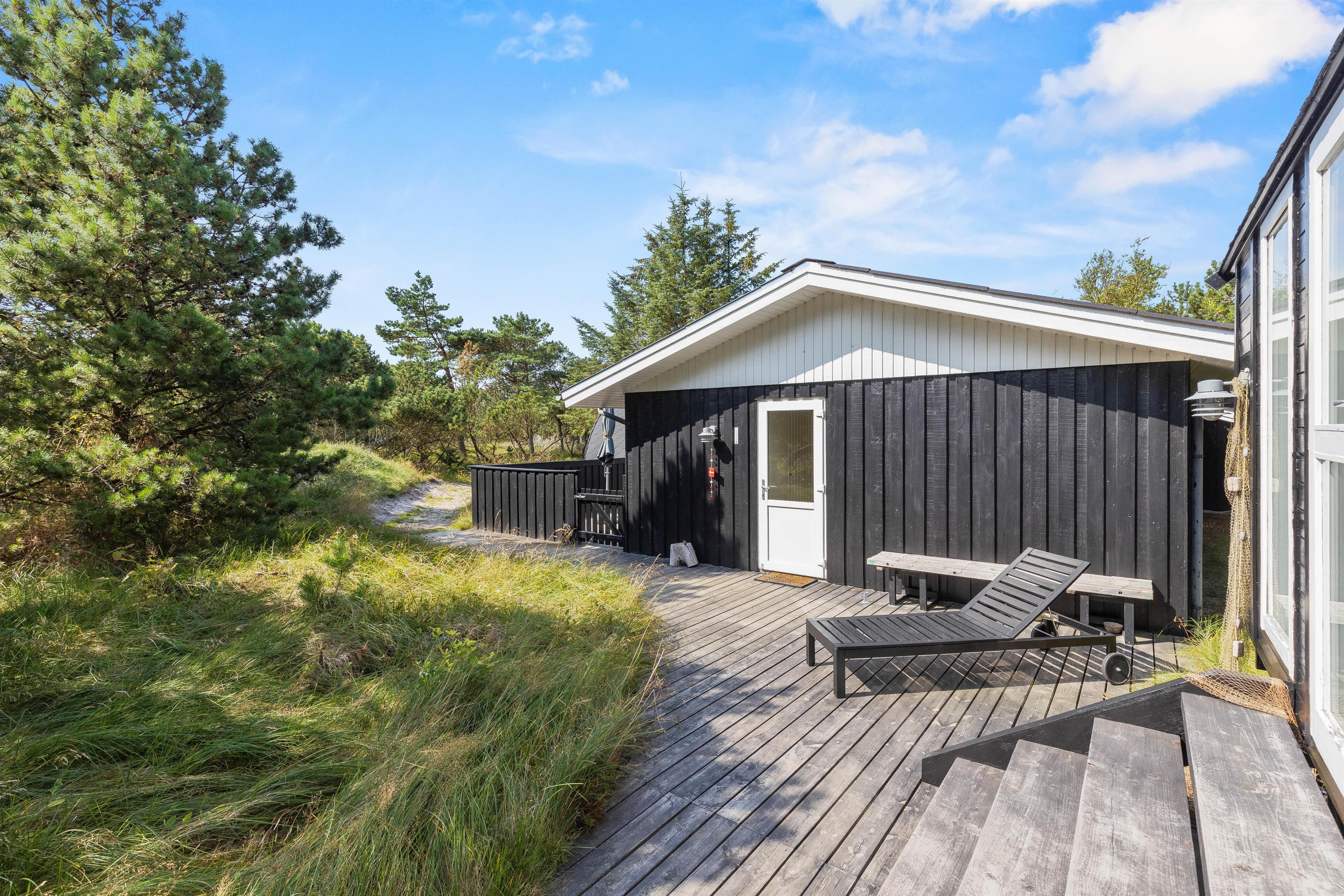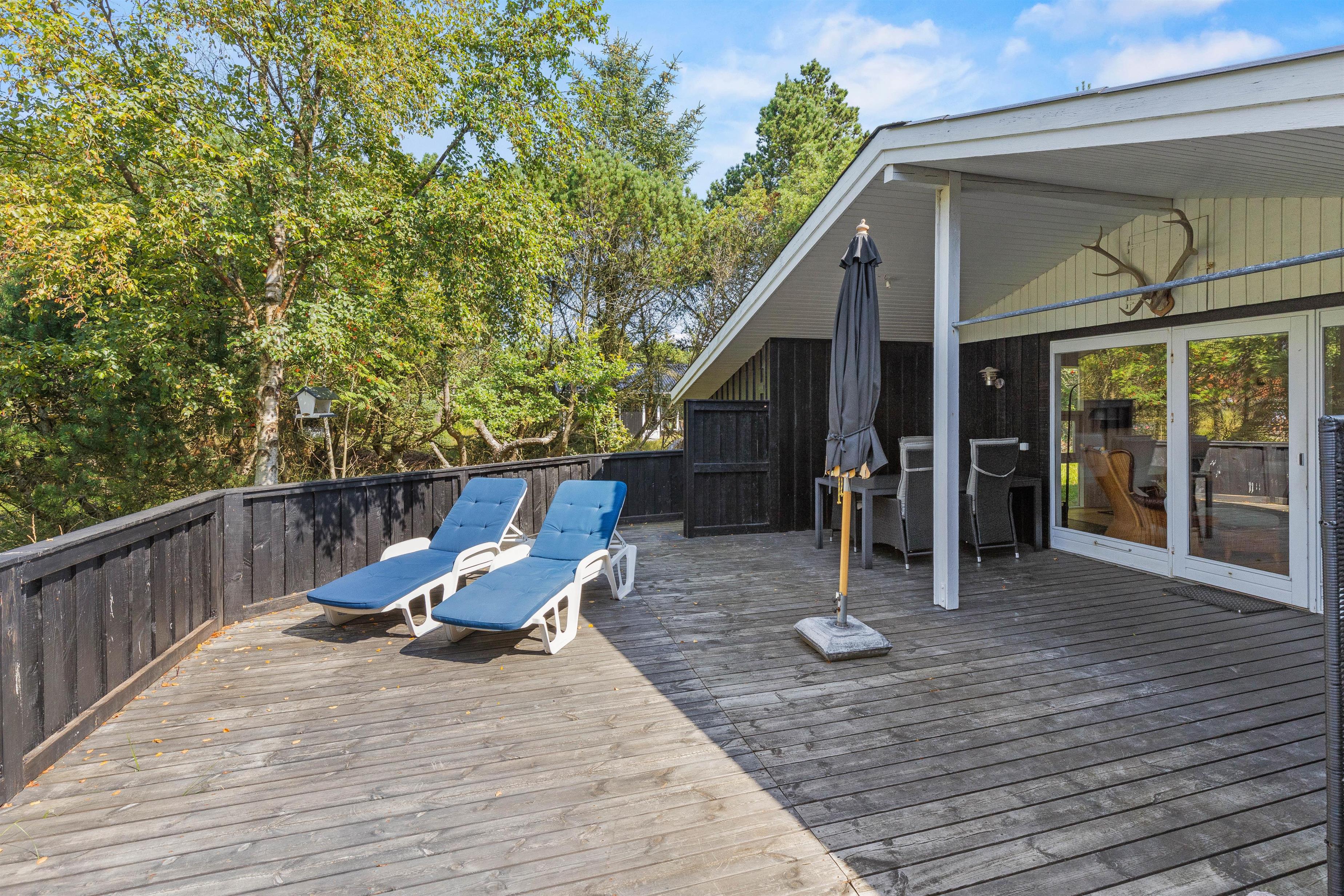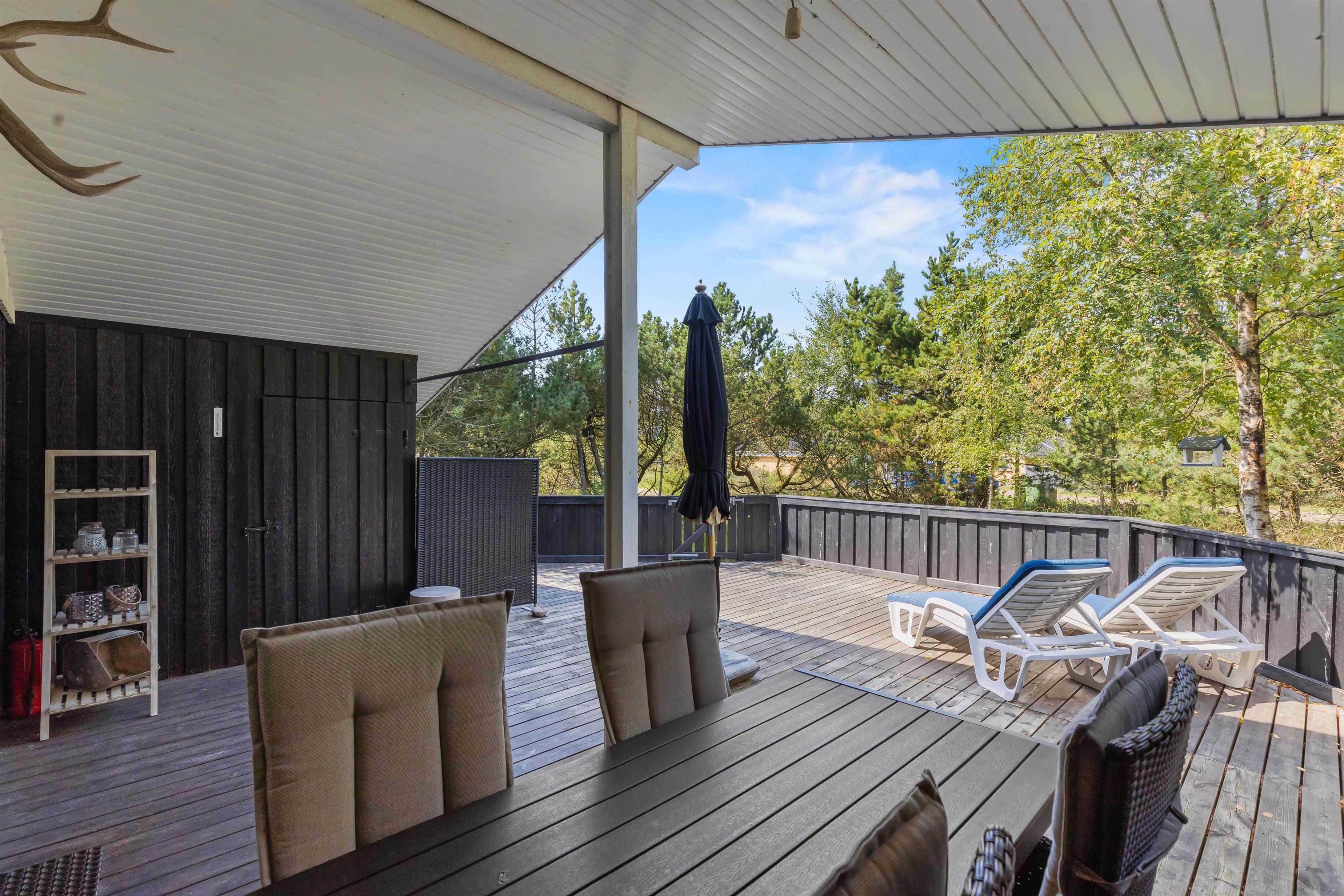 Udendørs byder sommerhuset på flere skønne terrasser, som I kan nyde de solrige dage af jeres ferie på. På terrasserne kan I finde jer en god plads i solen, hvorfra I kan nyde ferien fra havemøblerne og liggestolene. Den ene af terrasserne er delvist overdækket, så her kan I også sidde i skygge, hvis I skulle få brug for at holde en pause fra solen eller søge ly for en lille regnbyge.