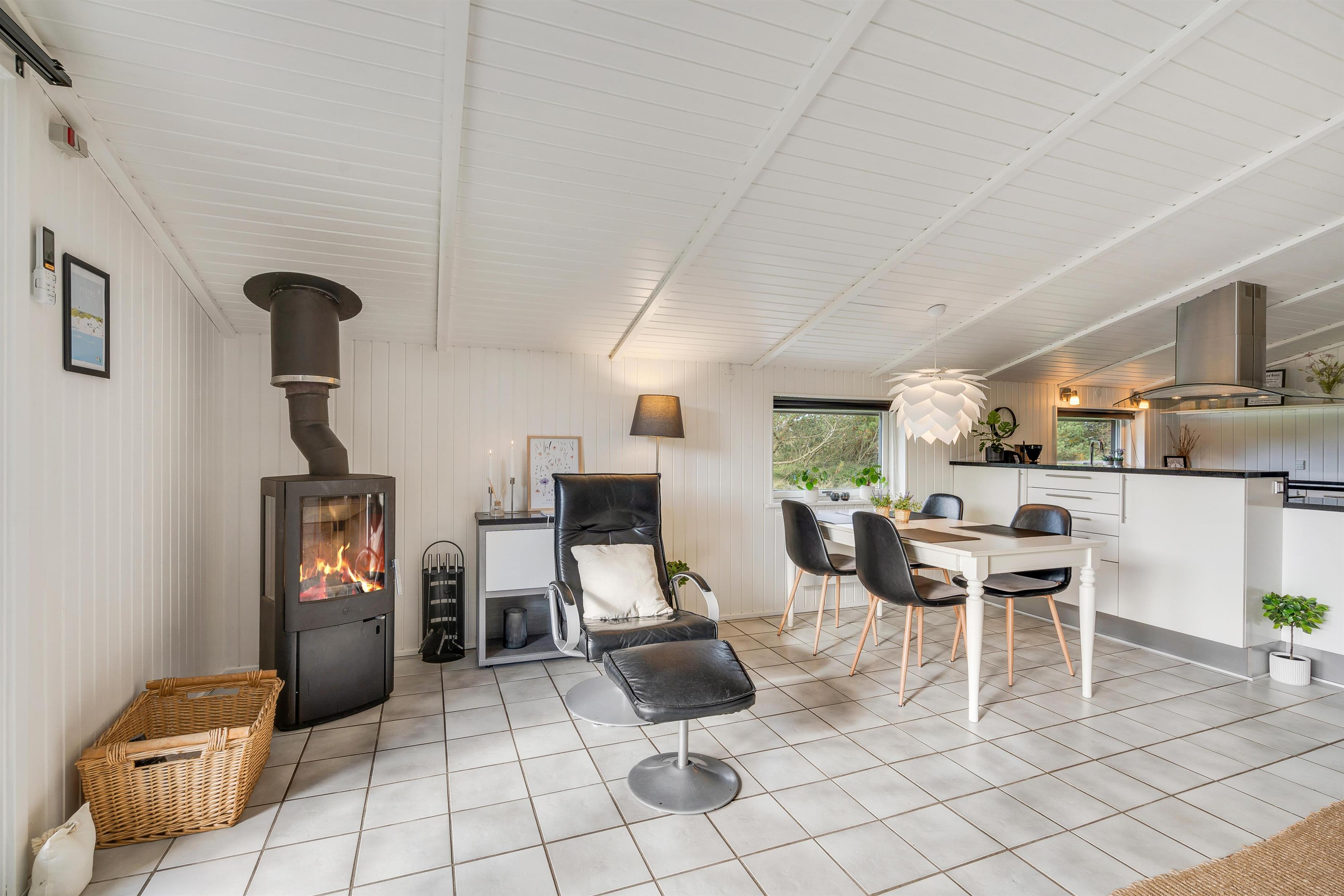 Det store samlingspunkt på jeres ferie vil uden tvivl være sommerhusets alrum, hvor køkkenet ligger i åben forbindelse med stue og spiseplads. I alrummet kan I nyde hinandens selskab, når I laver mad, spiser, spiller spil eller ser film i tv’et. Brændeovnen i alrummet sætter prikken over i’et for den hyggelige feriestemning med sin knitren og varme.