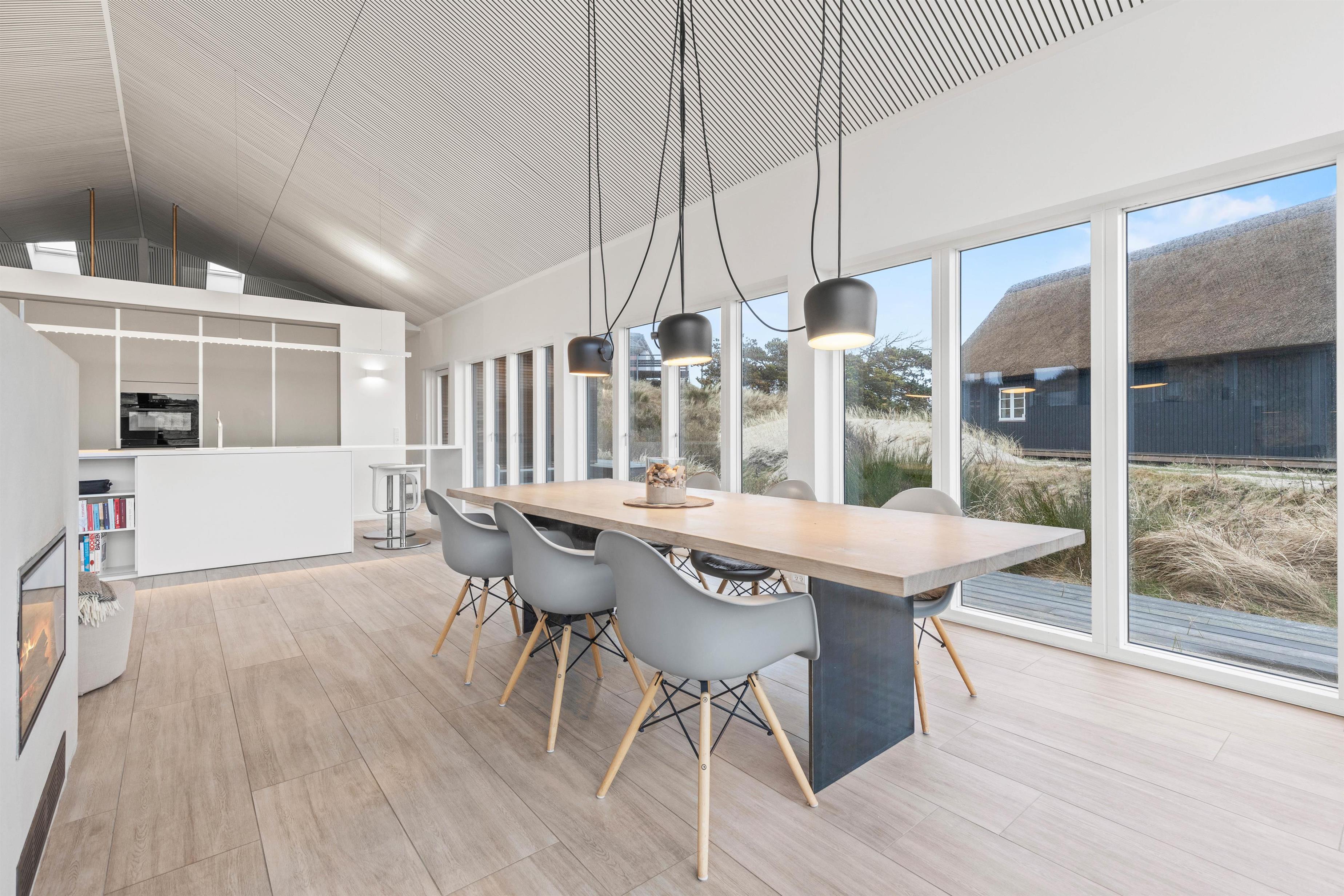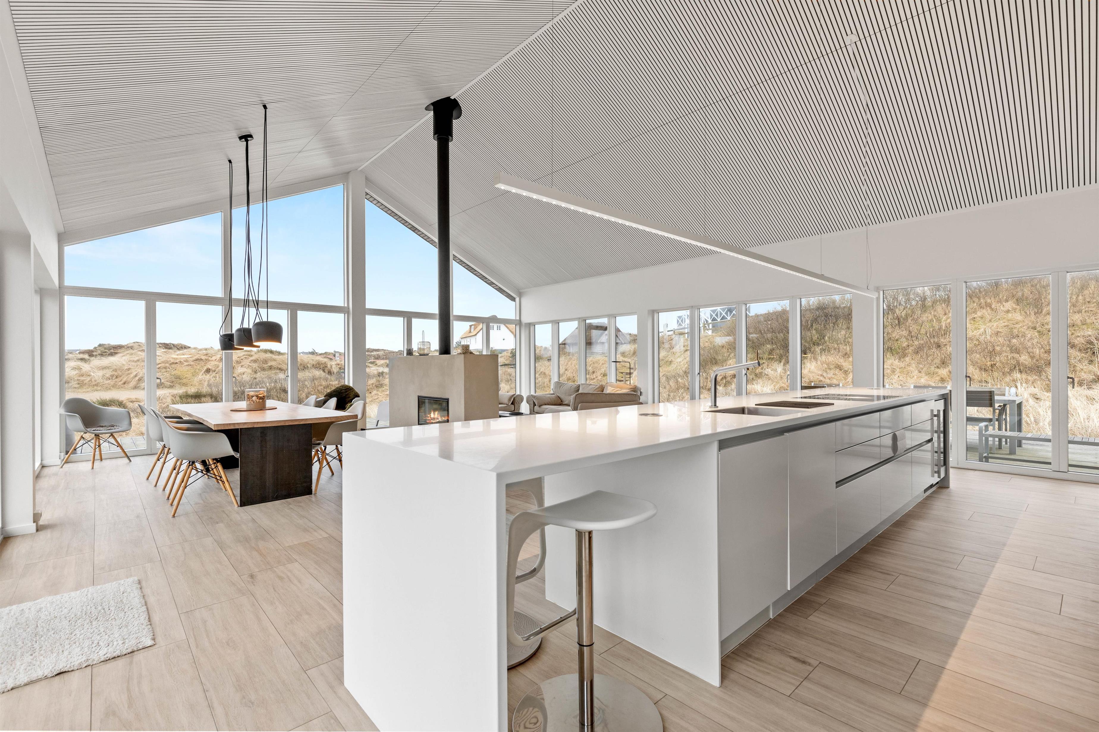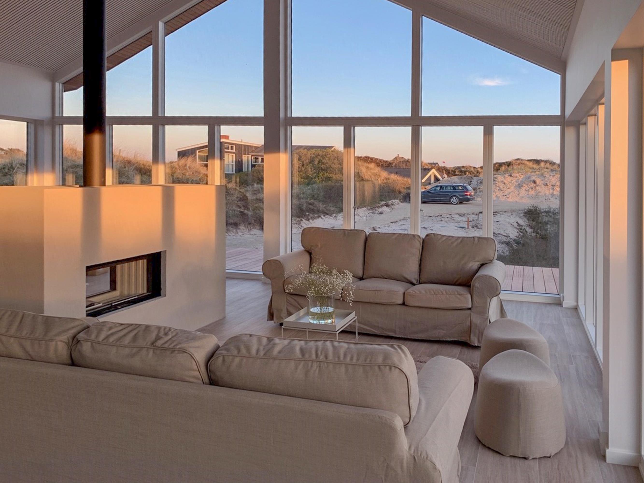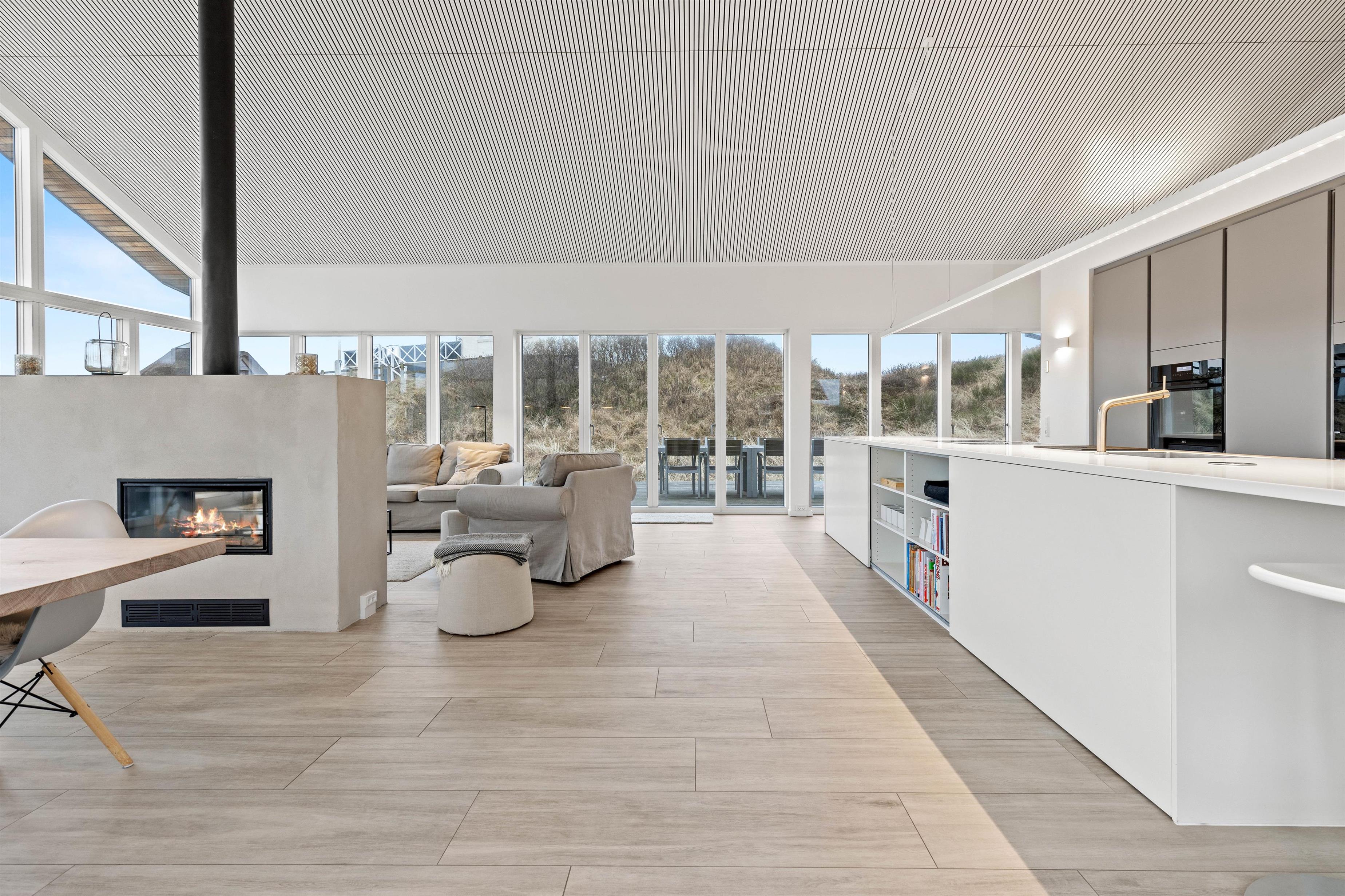 Gennem de store panoramavinduer, som kan åbnes til alle sider, strømmer det særlige lys, du kun finder direkte ved Vesterhavet. Sæt jer til rette i de smukke, enkle og moderne indrettede rum og nyd den lækre kombination af lys, hygge og varme gennem energibesparende luft-til-vand varmesystem og udsigten til den smukke natur. Om aftenen sørger feriehusets kamin, der er åben til 2 sider, for en ekstra hyggelig stemning, når ilden knitrer og kaster et varmt orange skær ud i hele rummet.