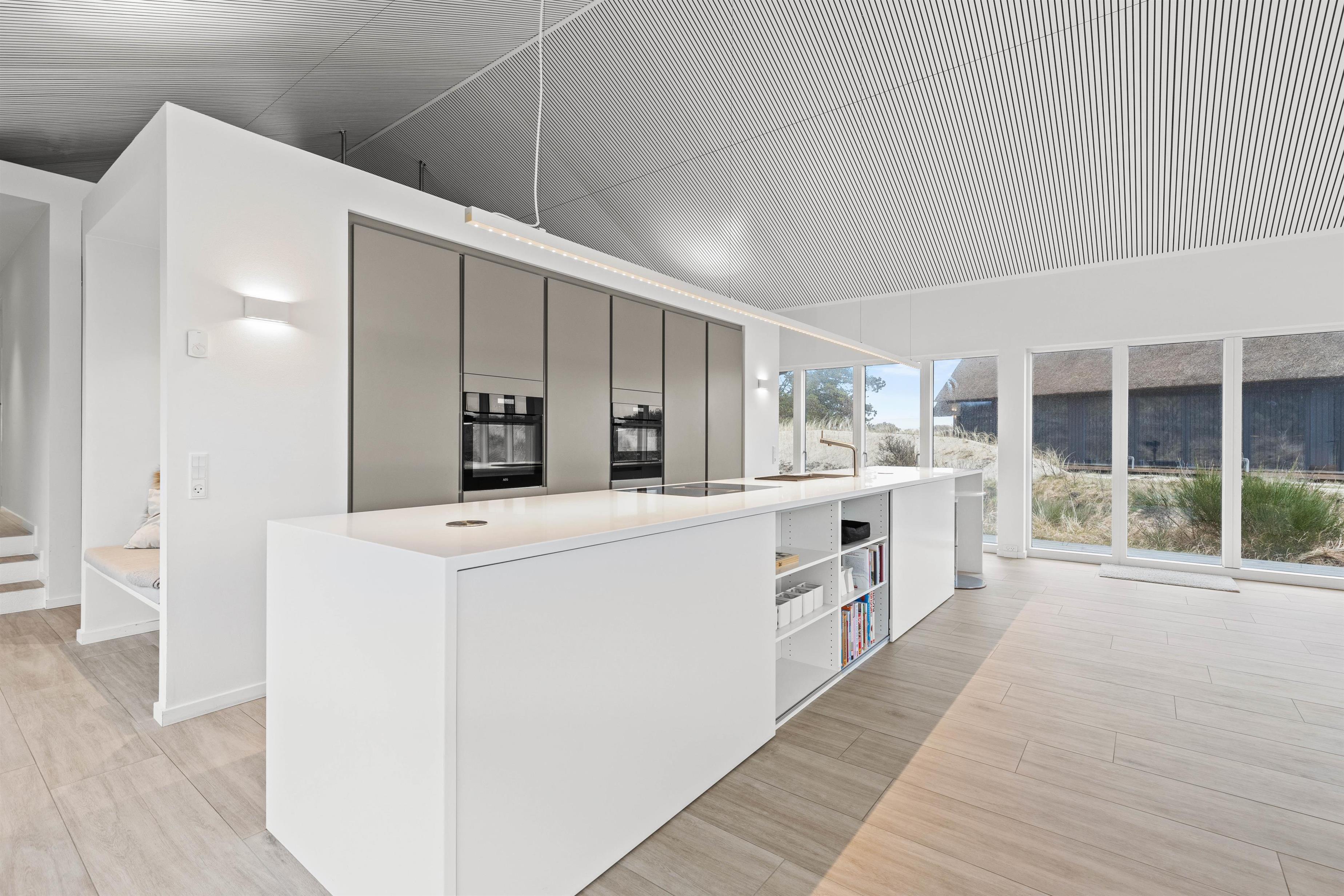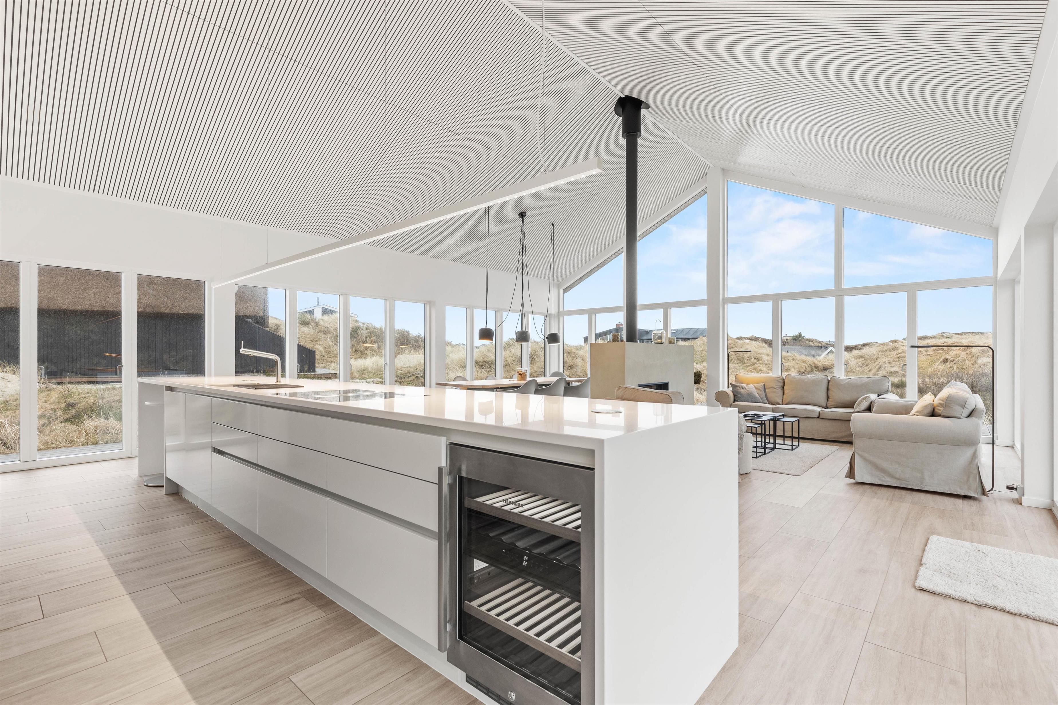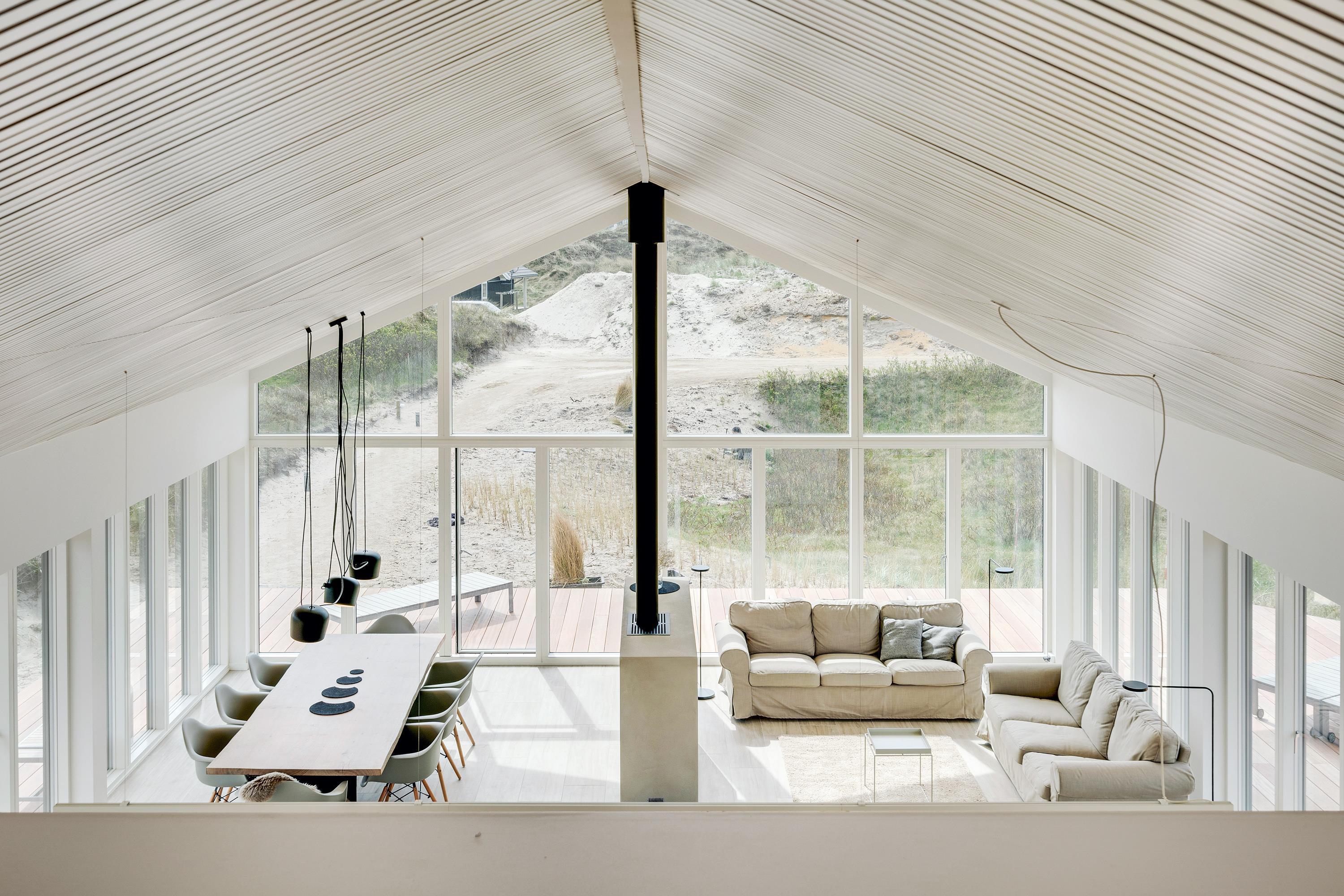 Gennem de store panoramavinduer, som kan åbnes til alle sider, strømmer det særlige lys, du kun finder direkte ved Vesterhavet. Sæt jer til rette i de smukke, enkle og moderne indrettede rum og nyd den lækre kombination af lys, hygge og varme gennem energibesparende luft-til-vand varmesystem og udsigten til den smukke natur. Om aftenen sørger feriehusets kamin, der er åben til 2 sider, for en ekstra hyggelig stemning, når ilden knitrer og kaster et varmt orange skær ud i hele rummet.