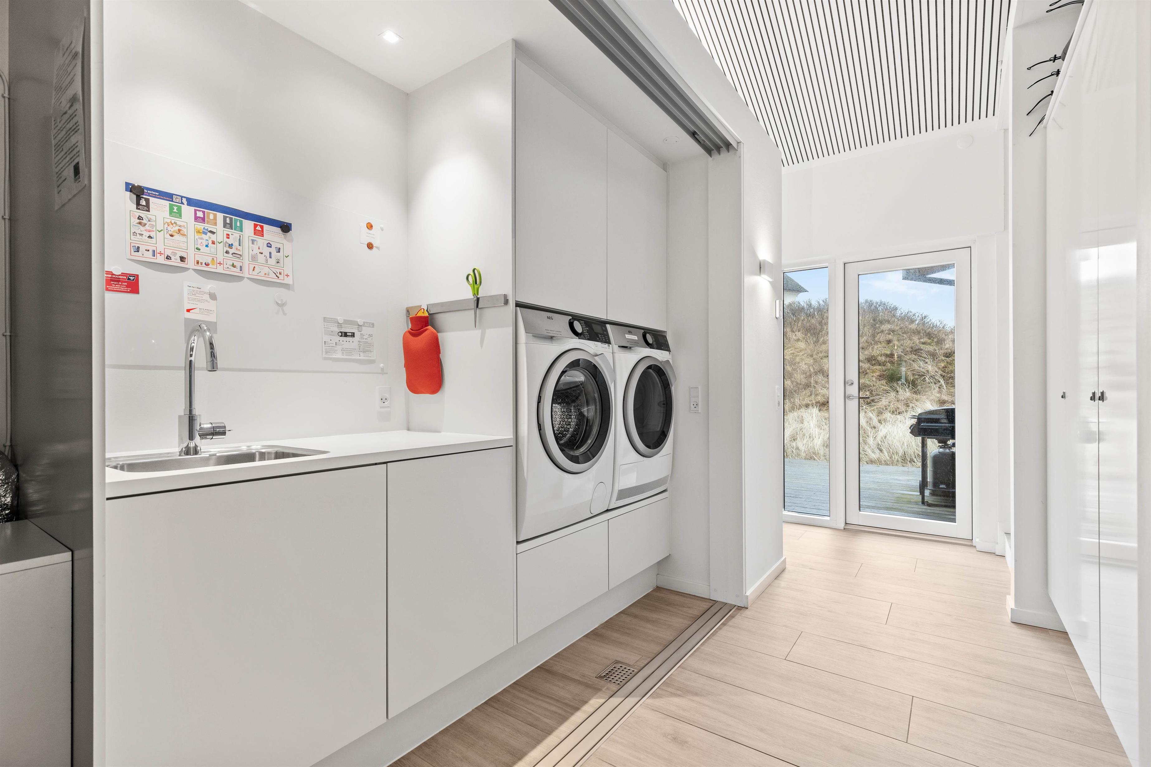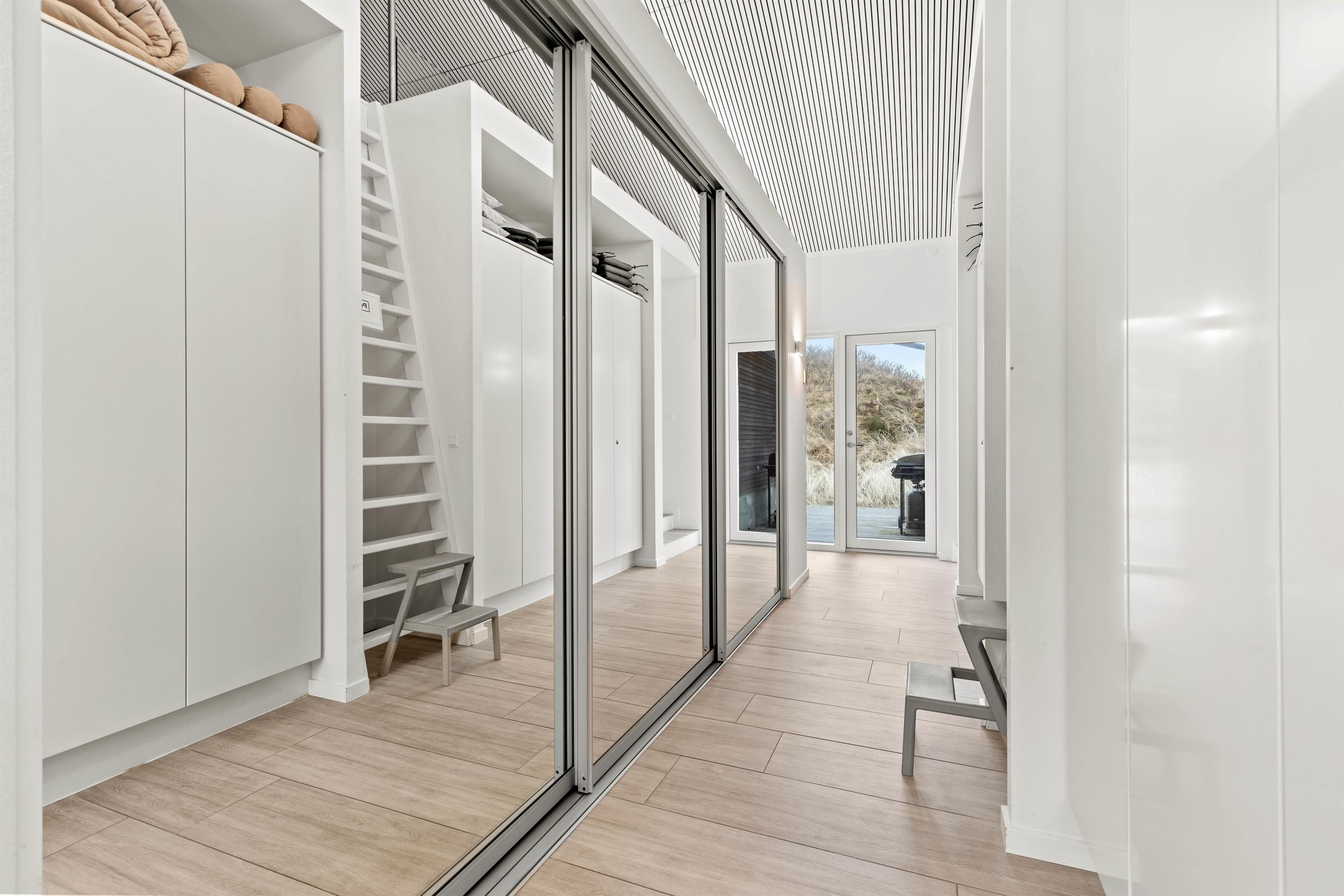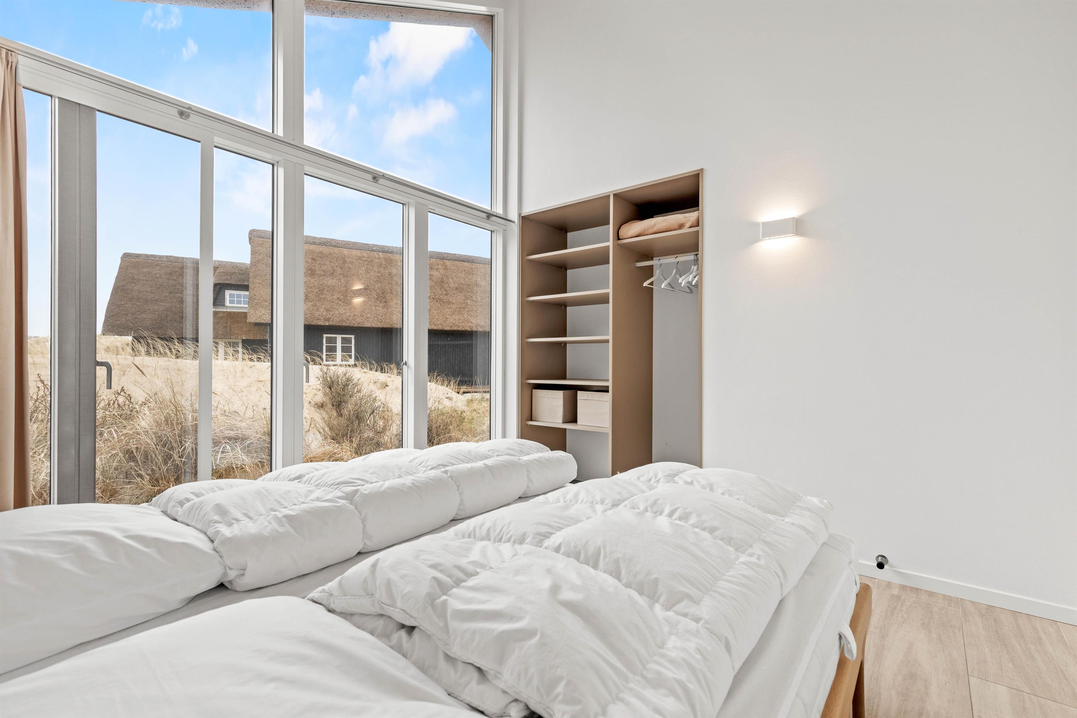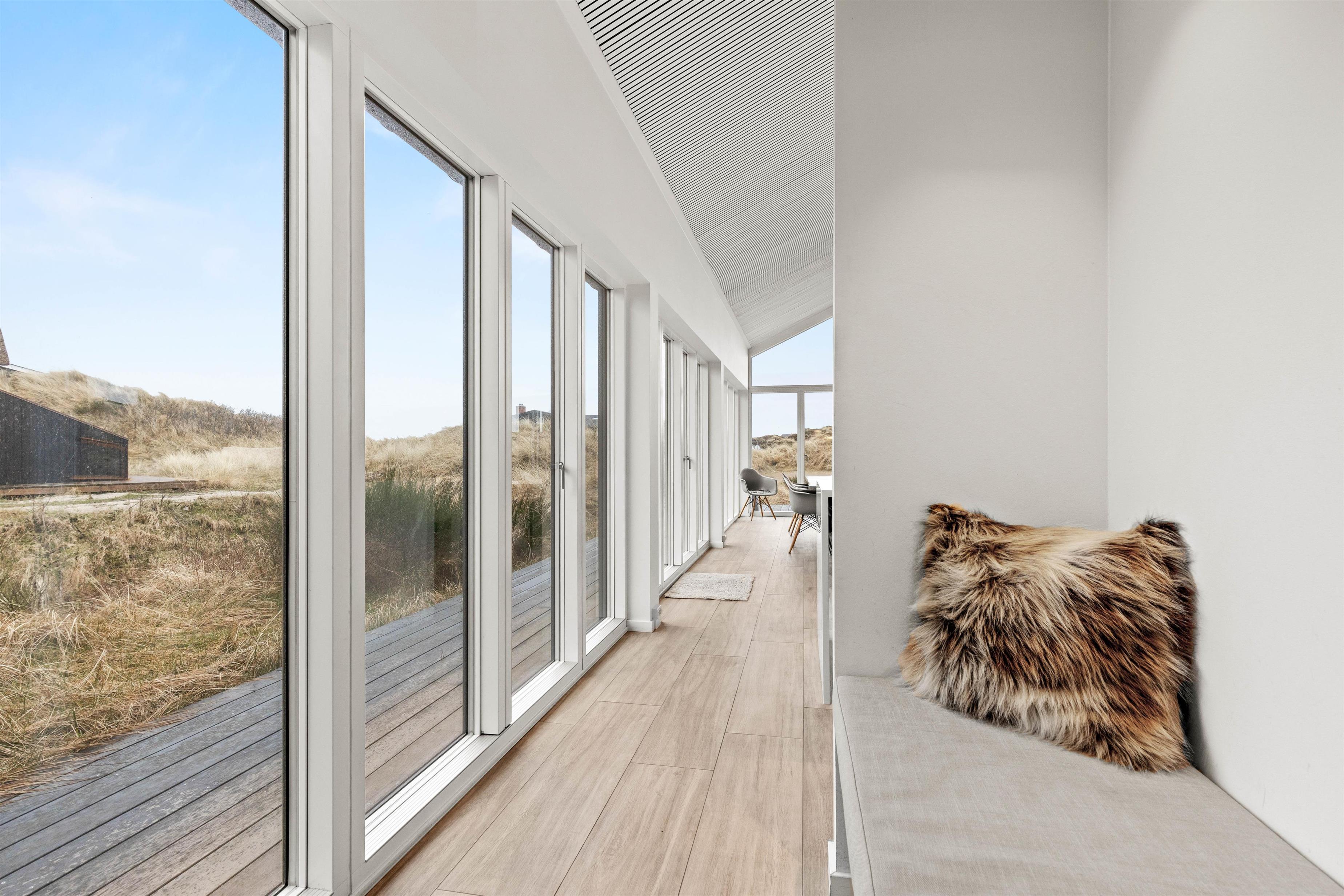 Gennem de store panoramavinduer, som kan åbnes til alle sider, strømmer det særlige lys, du kun finder direkte ved Vesterhavet. Sæt jer til rette i de smukke, enkle og moderne indrettede rum og nyd den lækre kombination af lys, hygge og varme gennem energibesparende luft-til-vand varmesystem og udsigten til den smukke natur. Om aftenen sørger feriehusets kamin, der er åben til 2 sider, for en ekstra hyggelig stemning, når ilden knitrer og kaster et varmt orange skær ud i hele rummet.