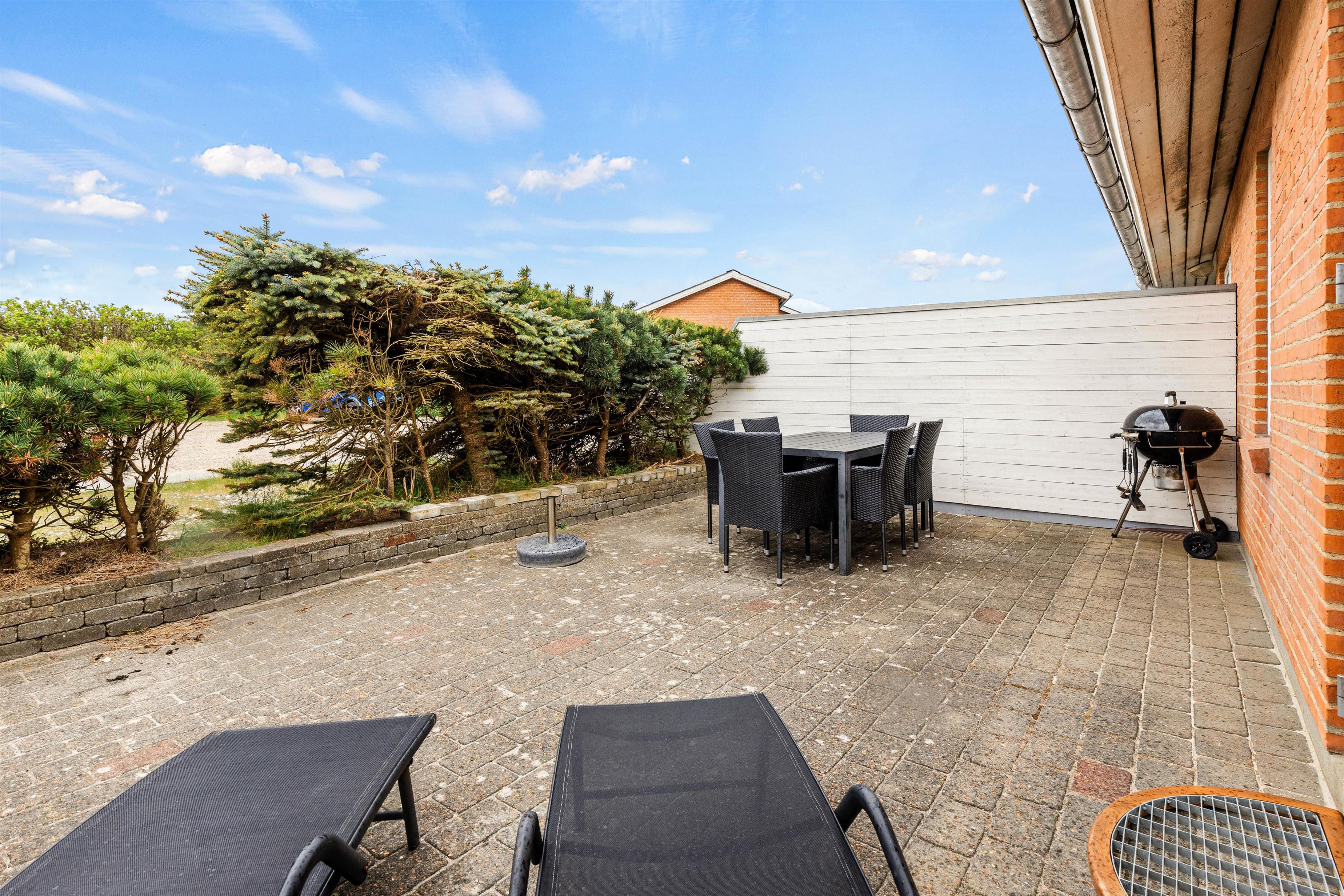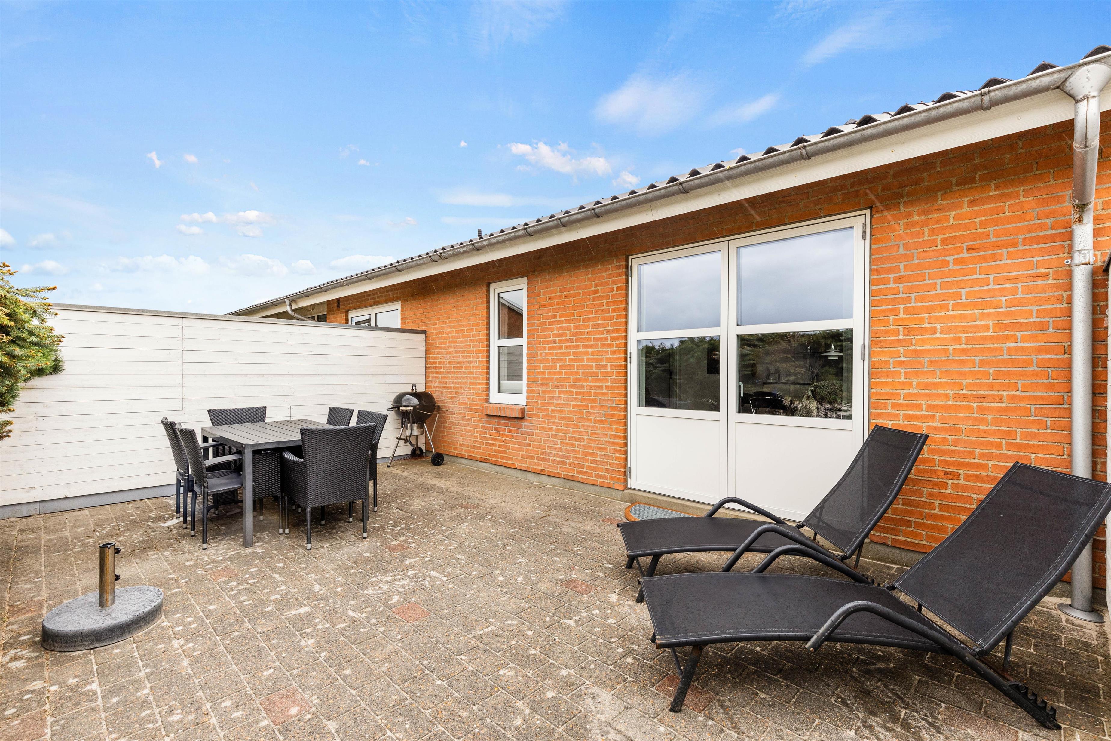 Fra stuen har I udgang til en afskærmet terrasse, hvor I kan sidde og nyde det gode vejr. Om aftenen kan I tænde op i grillen og tilberede en lækker feriemiddag i den lune aftensol.