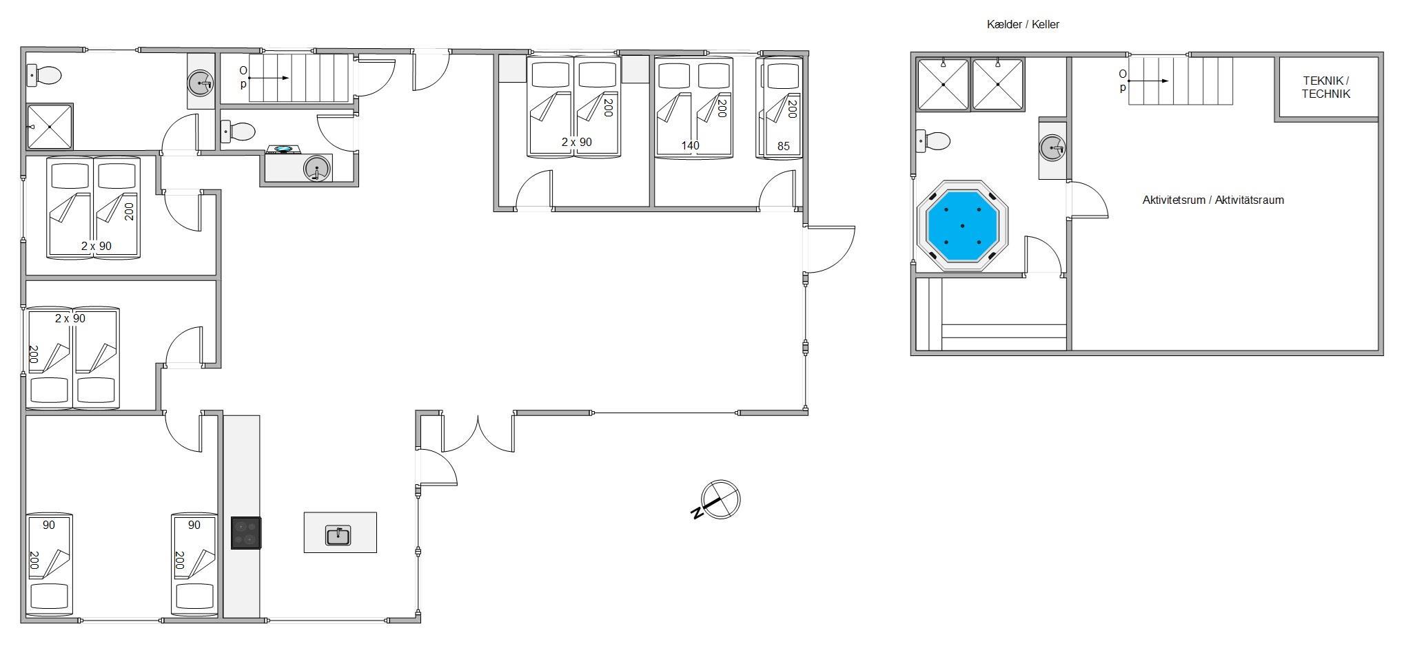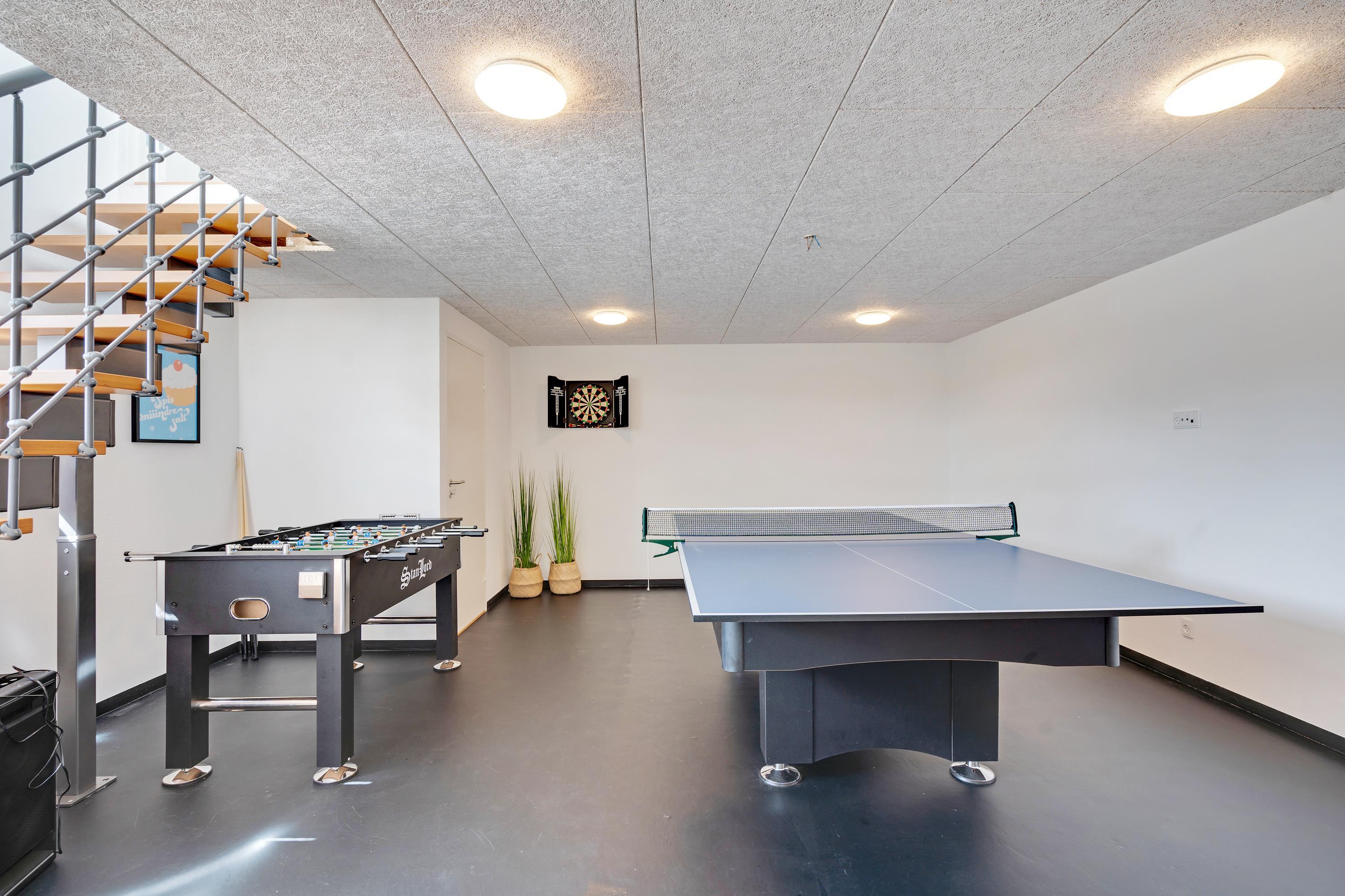 Feriehusets kælder er et skatkammer af muligheder for leg og afslapning med det store aktivitetsrum og det lækre wellness-badeværelse med både spabad og sauna.