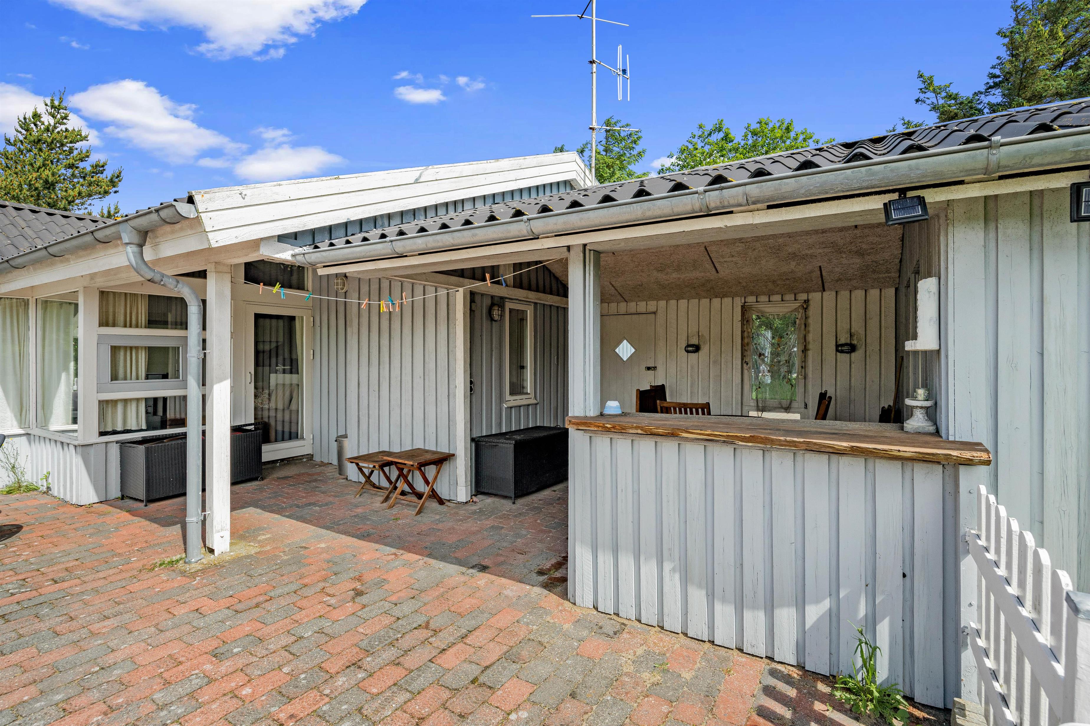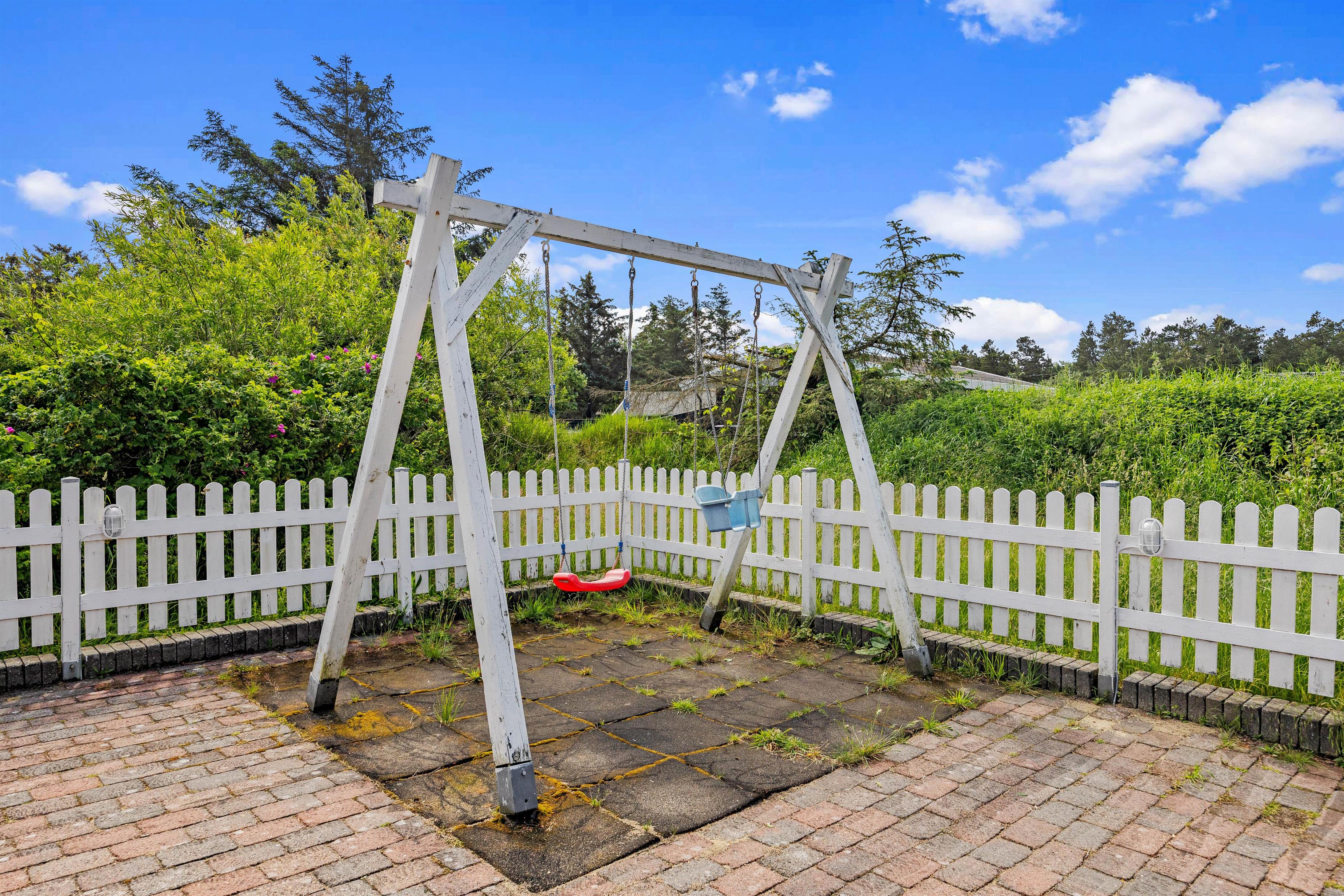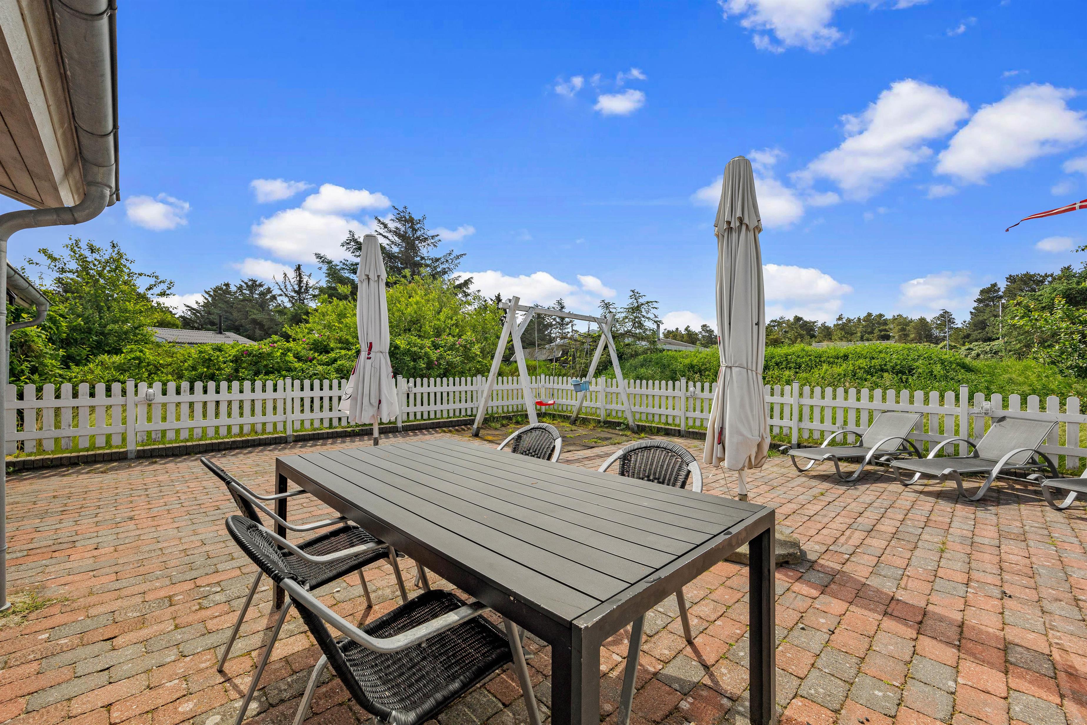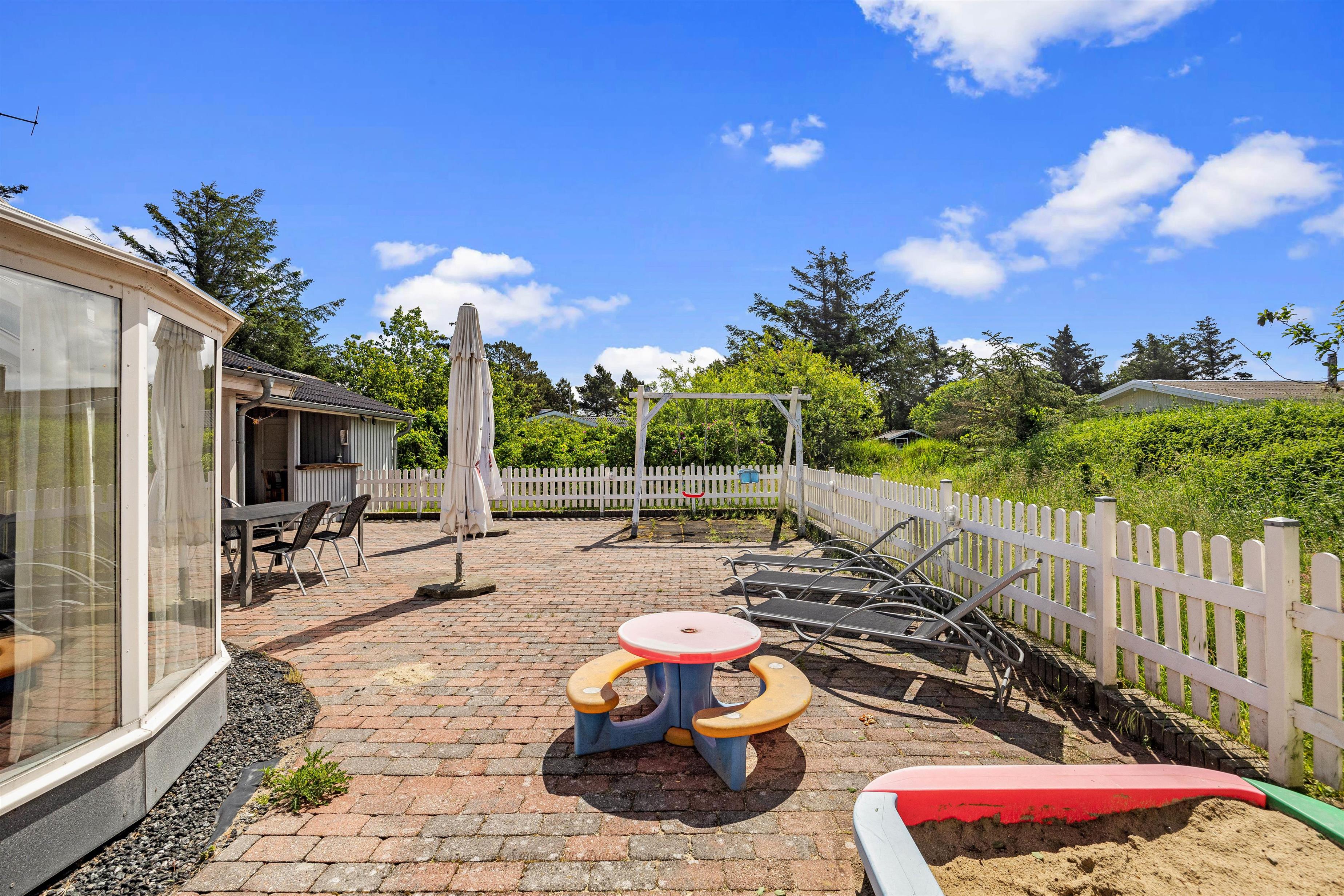 På den store flisebelagte terrasse kan både små og store feriegæster hygge sig med leg og afslapning omkring havebordet og grillen. De små kan trygt sendes ud og lege i sandkassen eller på gyngerne, da hele terrassen er omkranset af et fint hegn. Derudover er der parasoller, så I kan danne skygge til dem, der foretrækker det, ligesom det overdækkede afsnit kan give læ for en eventuel regnbyge.