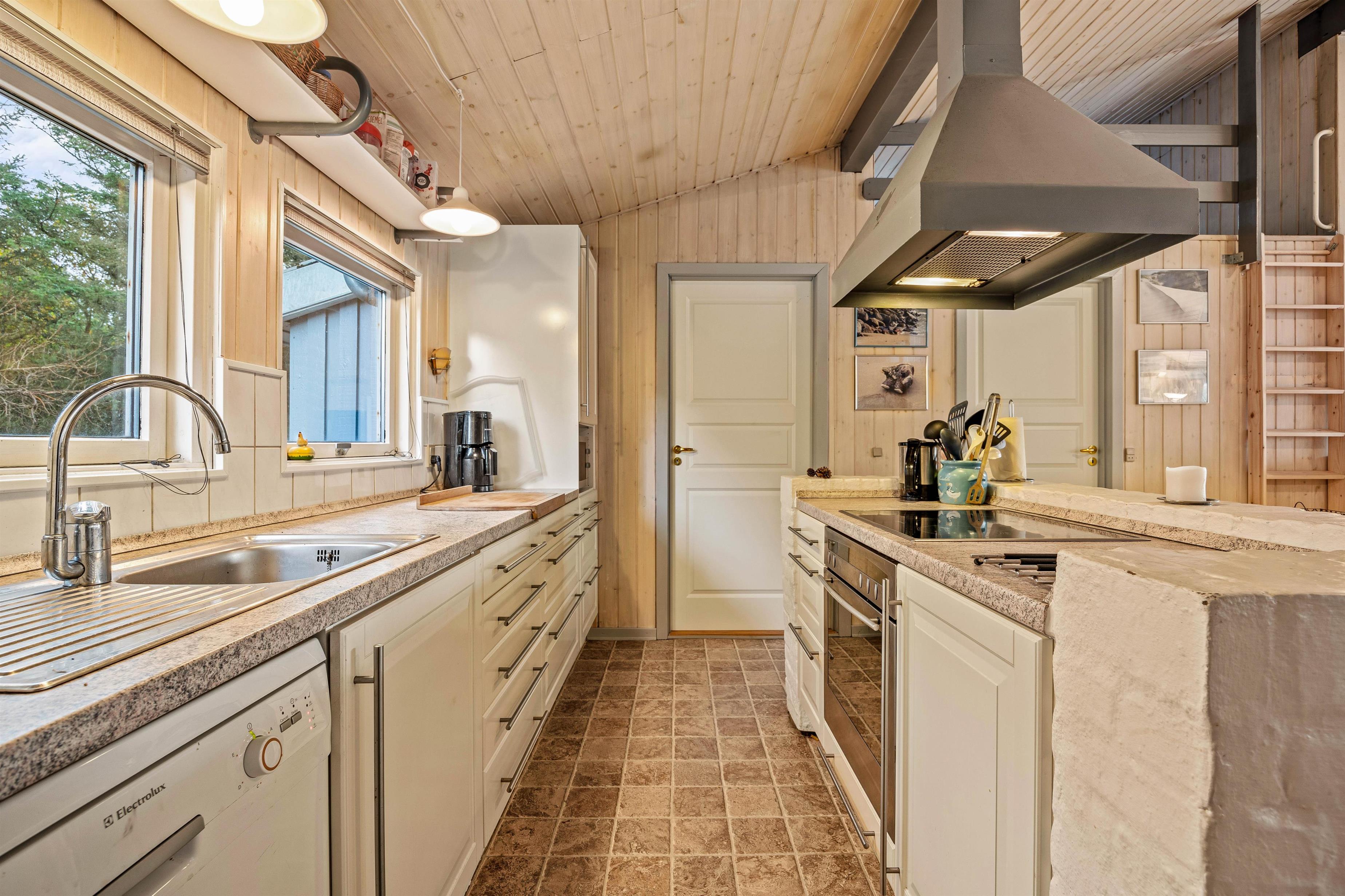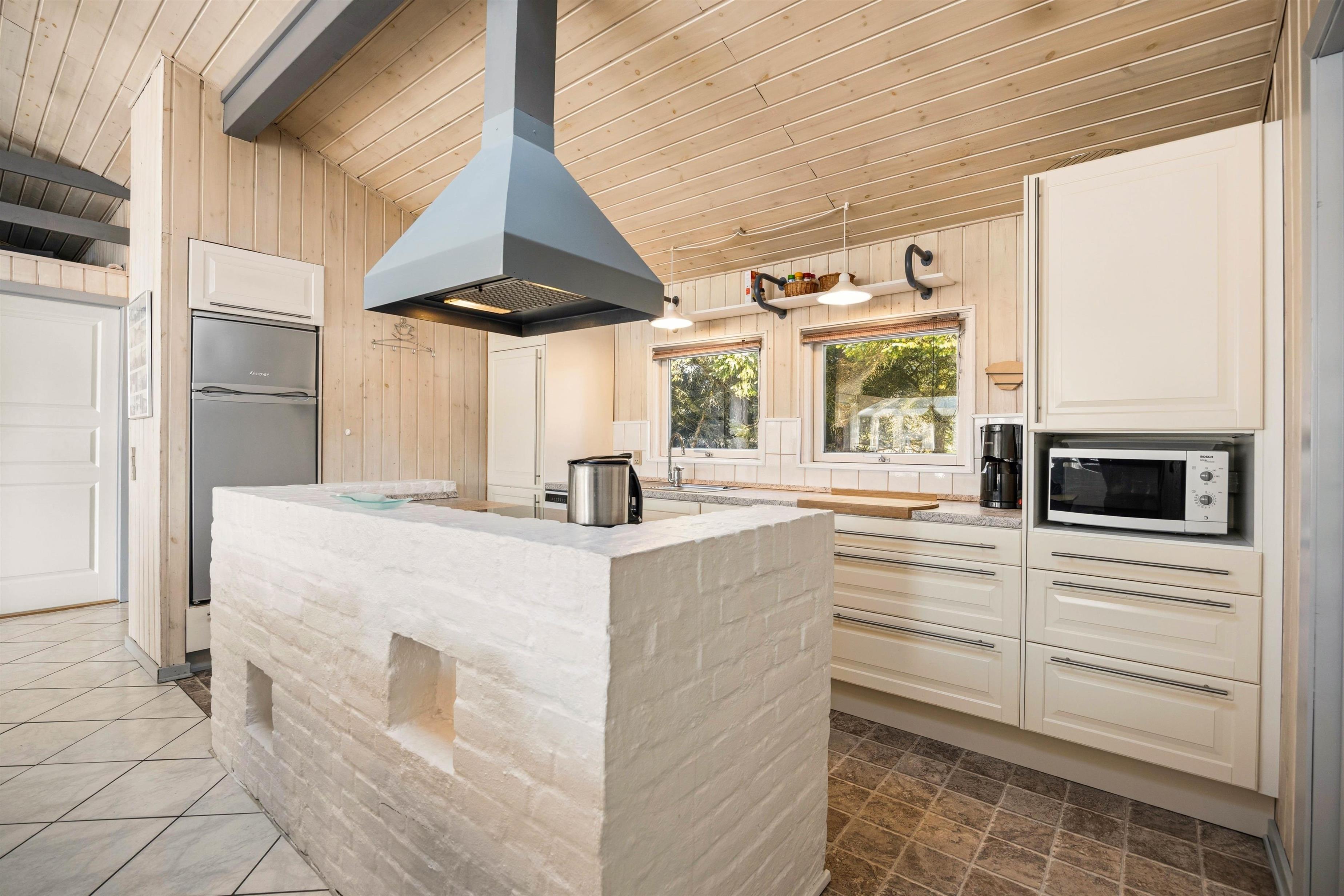 Det store opholdsrum indeholder også et dejligt lyst køkken med god bordplads, med både opvaskemaskine og mikroovn samt en kogeø med kogeplade og ovn. Der er naturligvis også en god spiseplads, hvor der er plads til kreativitet, spil, hyggesnak og fælles hyggemåltider.