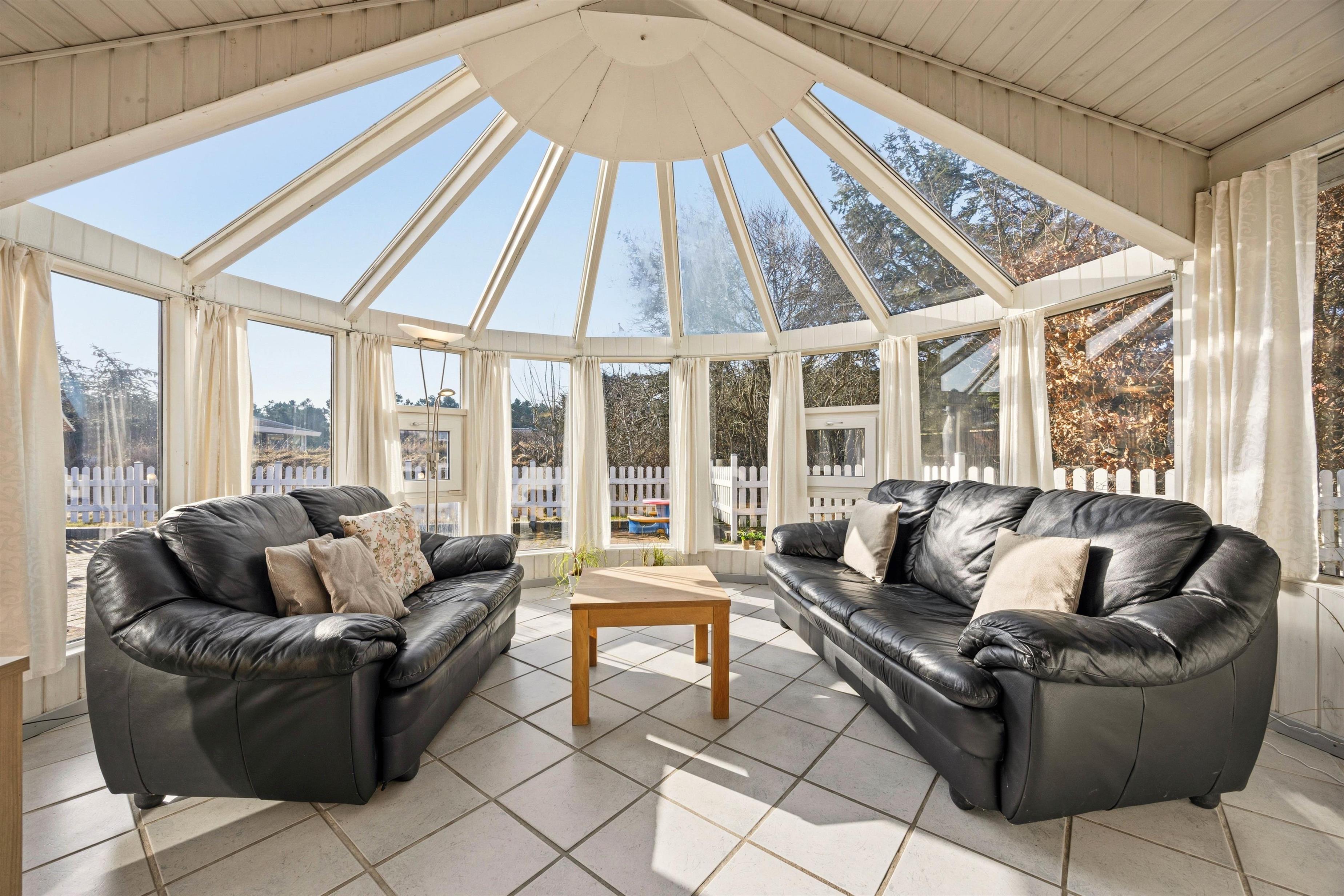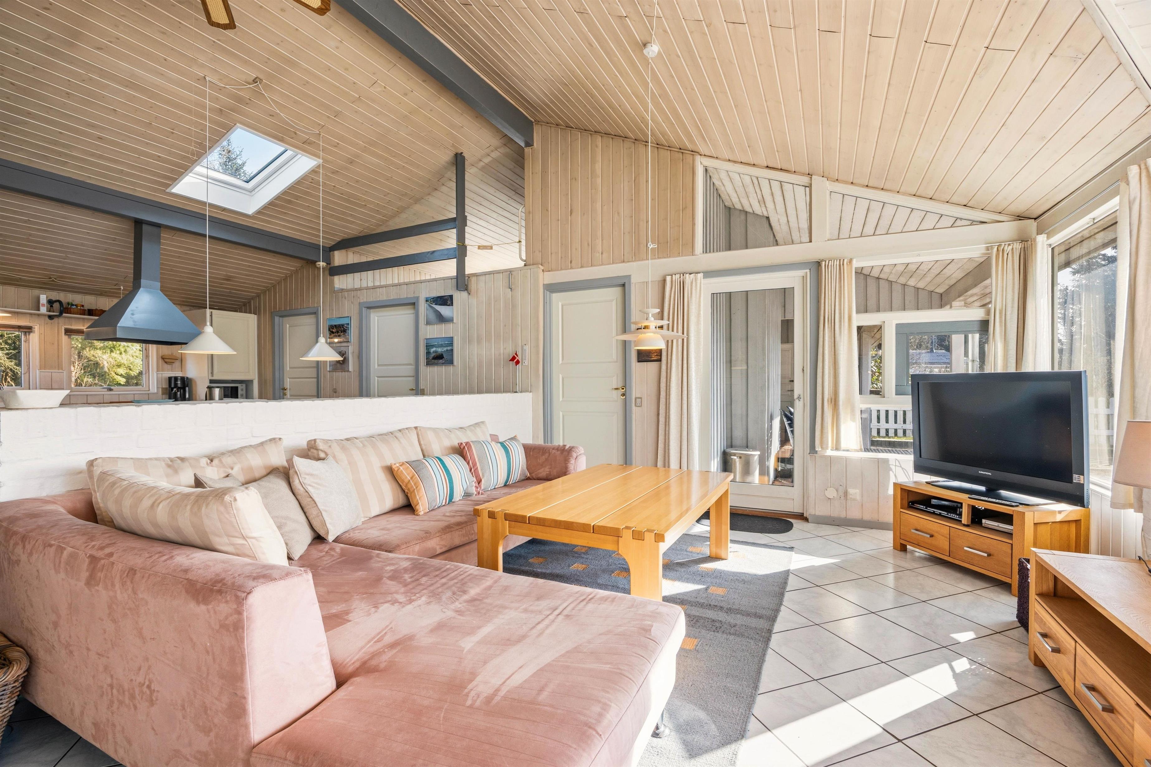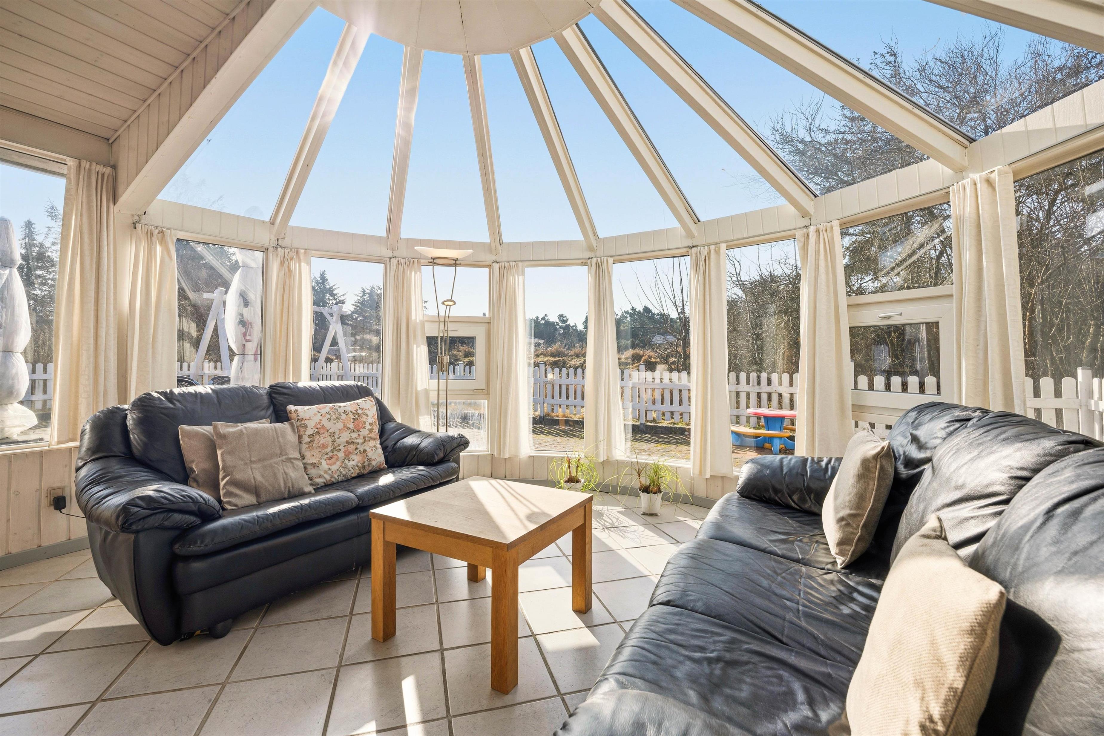 Det flotte lysindfald fra den store pavillonagtige udestue inviterer naturen indenfor, så den kan nydes i de bløde sofaer og loungemøblerne uanset vejr og årstid. Har I mere lyst til en fjernsynsaften, er der en separat afdeling med TV, og sofaen foran brændeovnen inviterer til en stille stund med en god bog.