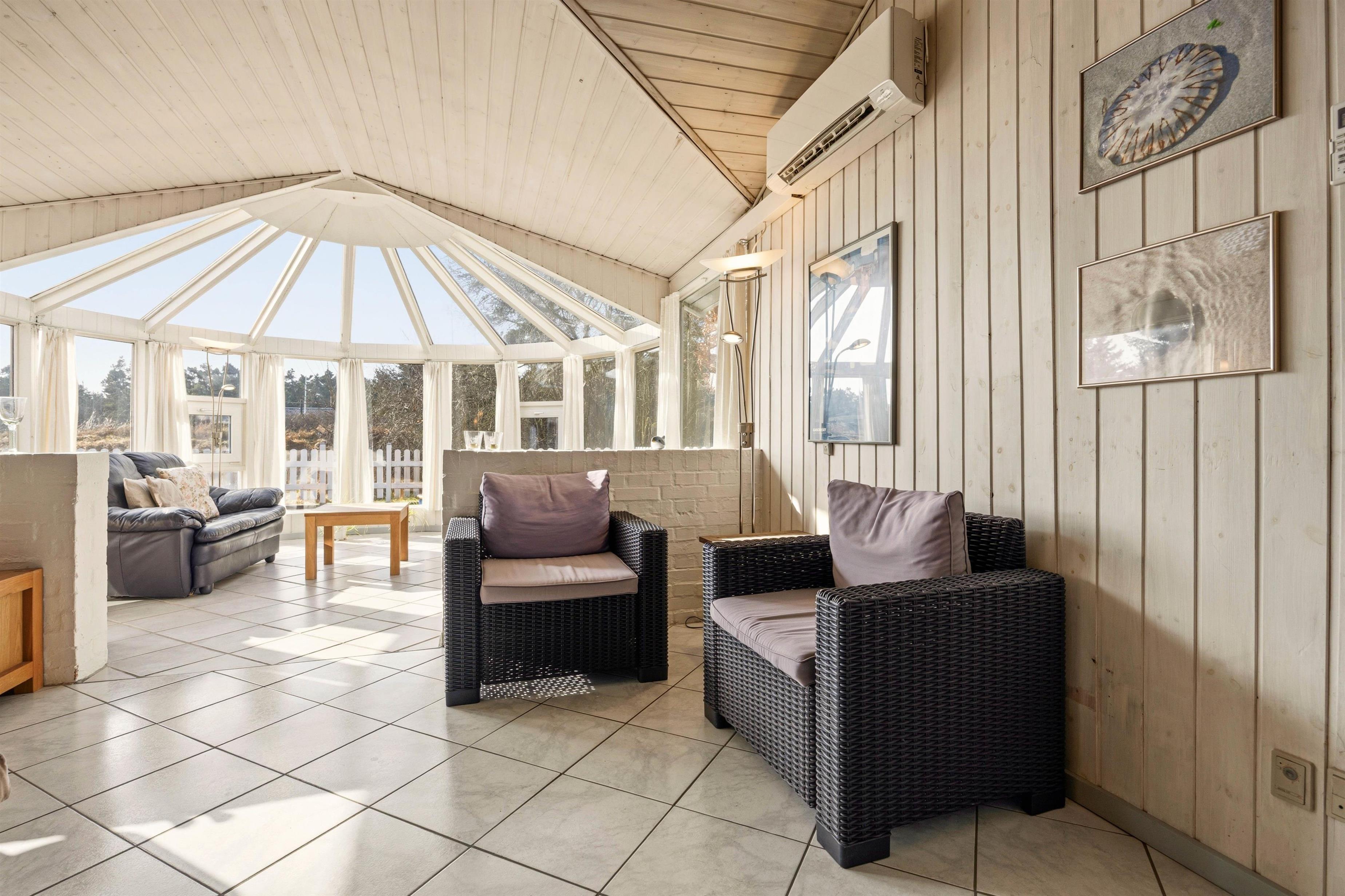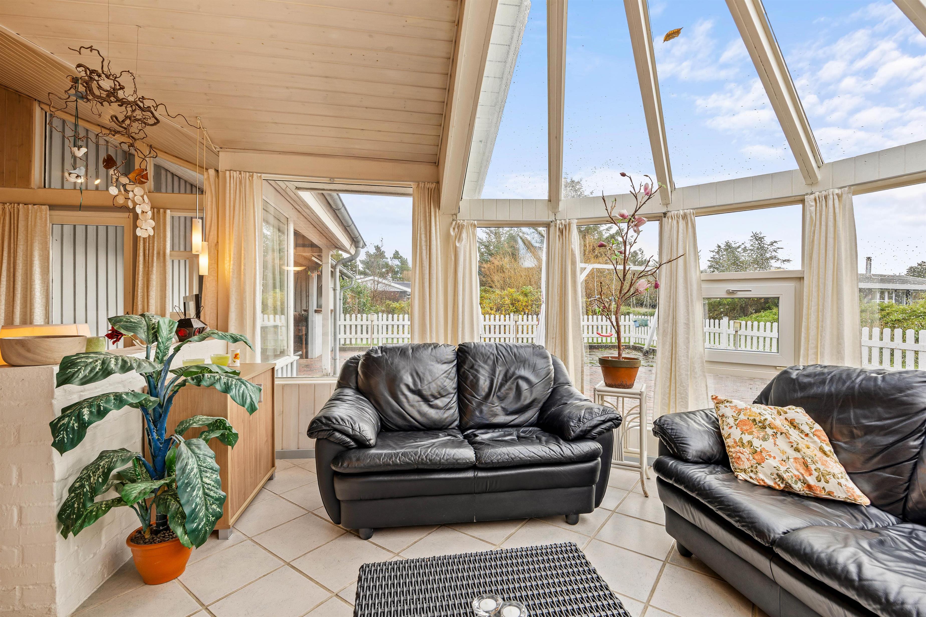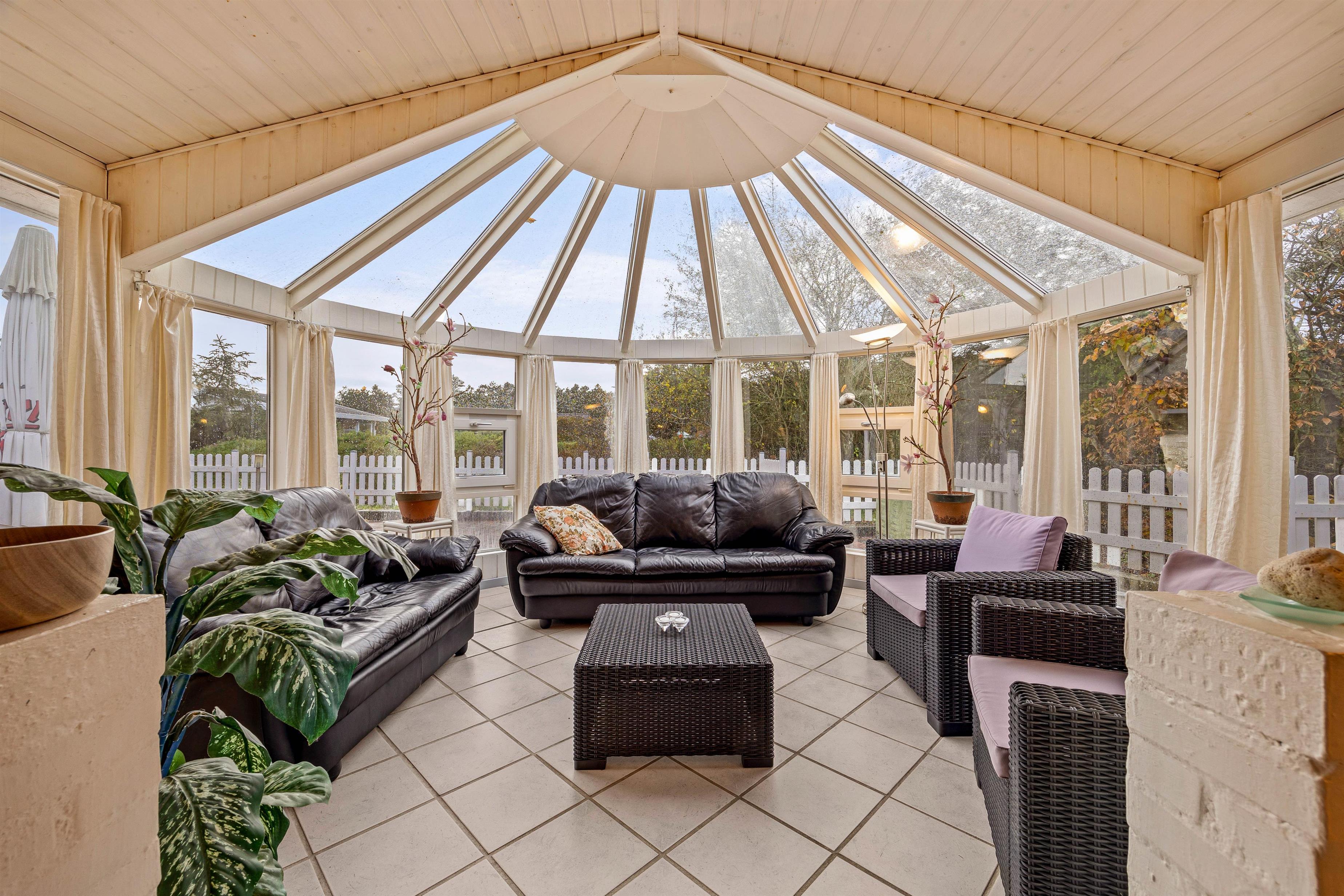 Det flotte lysindfald fra den store pavillonagtige udestue inviterer naturen indenfor, så den kan nydes i de bløde sofaer og loungemøblerne uanset vejr og årstid. Har I mere lyst til en fjernsynsaften, er der en separat afdeling med TV, og sofaen foran brændeovnen inviterer til en stille stund med en god bog.