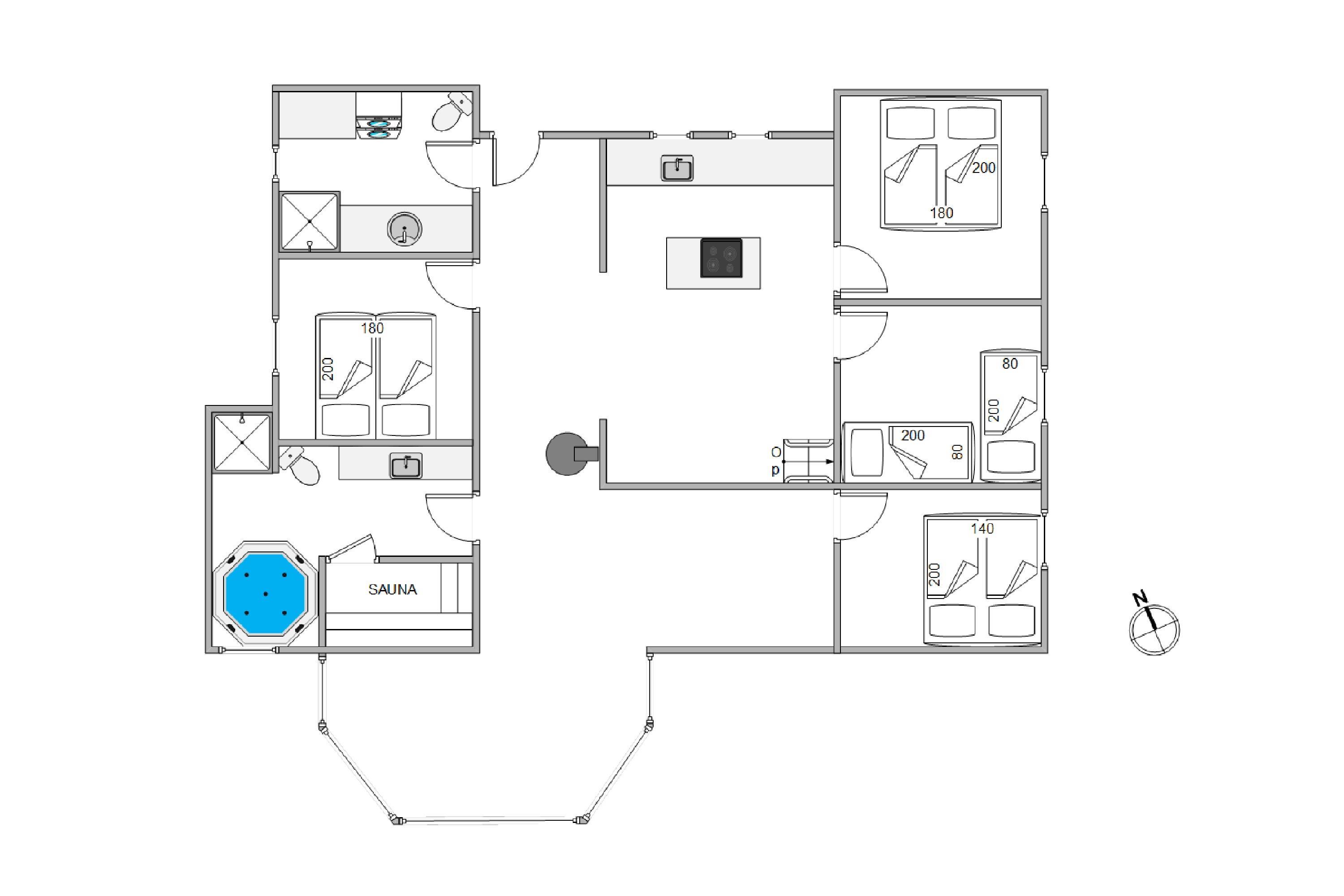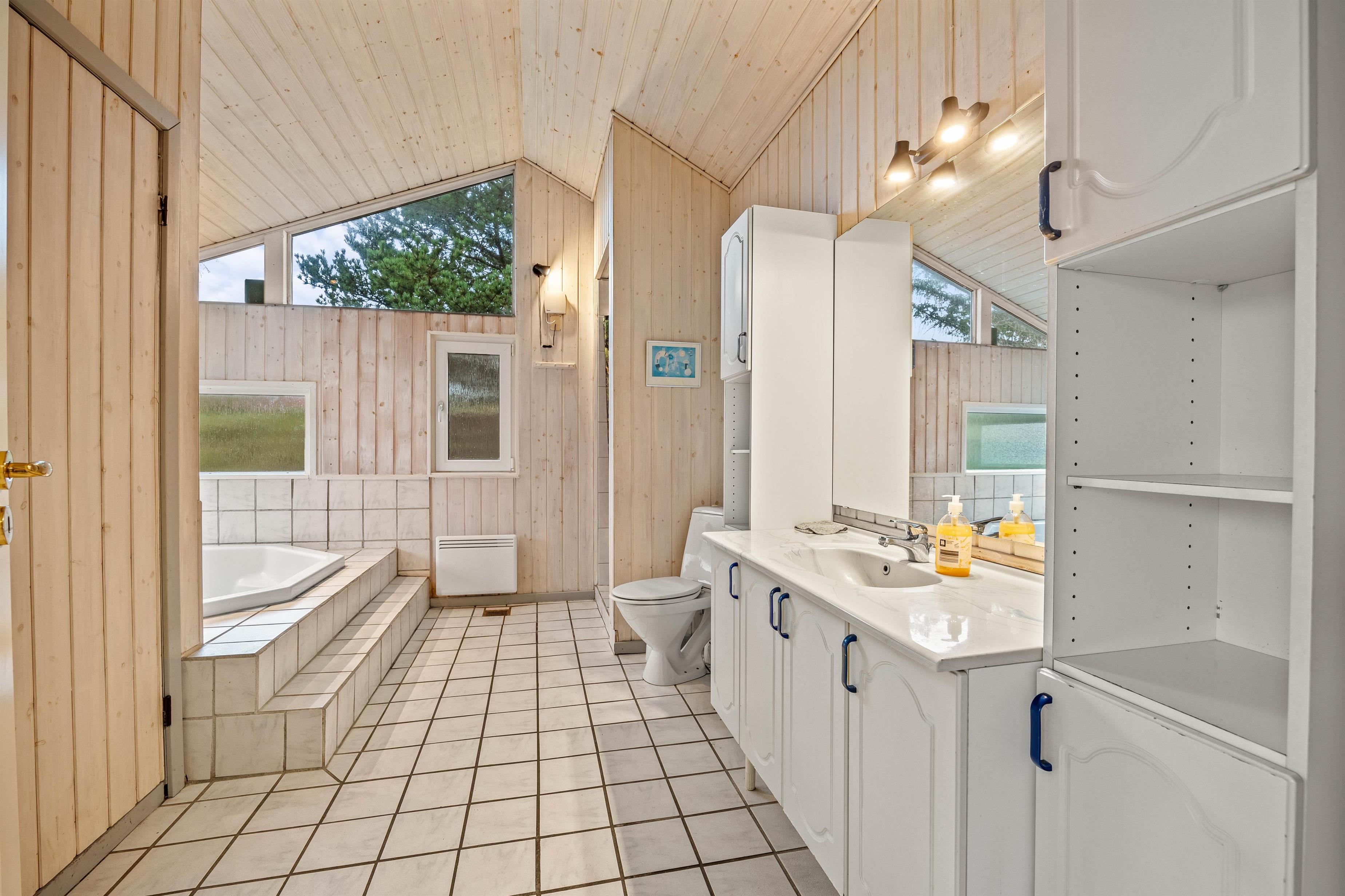 Feriehuset rummer 4 soverum – 3 med dobbeltseng og 1 med 2 enkeltsenge, hvor I kan hvile ud efter dagens aktiviteter og være friske til næste dag. Det ene af de 2 badeværelser, er et stort velværerum med en 5 personers spa og en dejlig sauna, hvor I kan blive plejet og forkælet - måske med et køligt glas vin. Der stilles også vaskemaskine og tørretumbler til jeres rådighed.