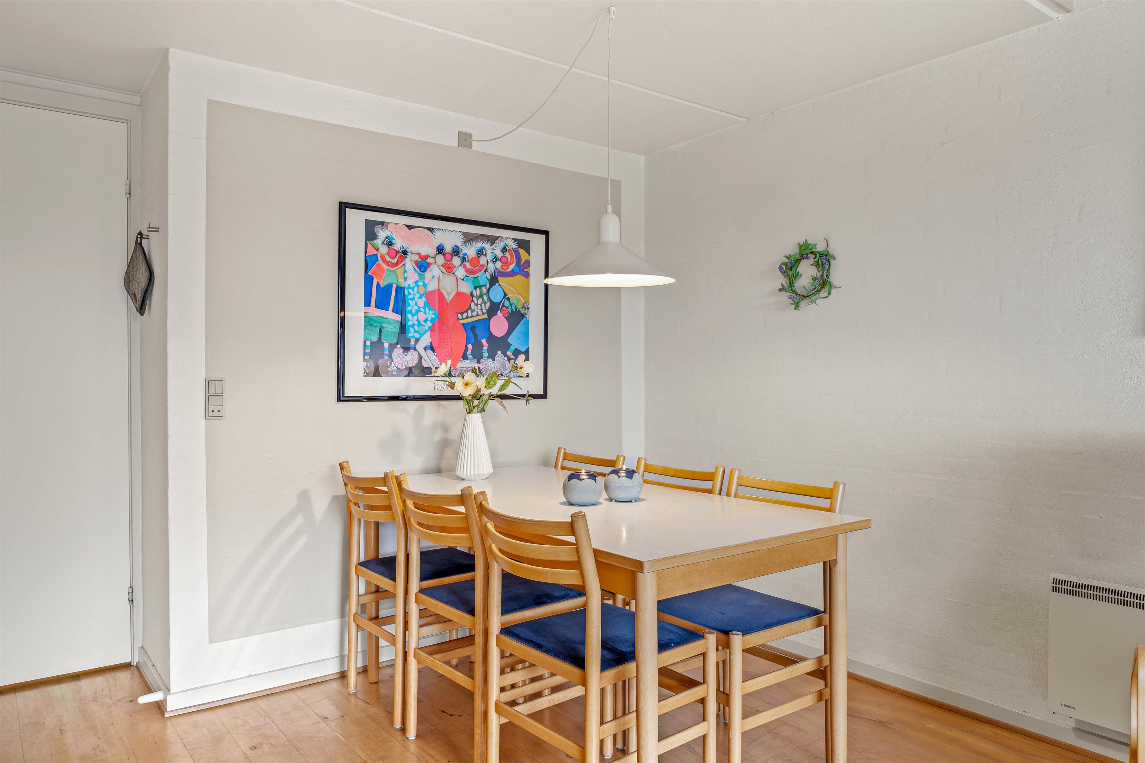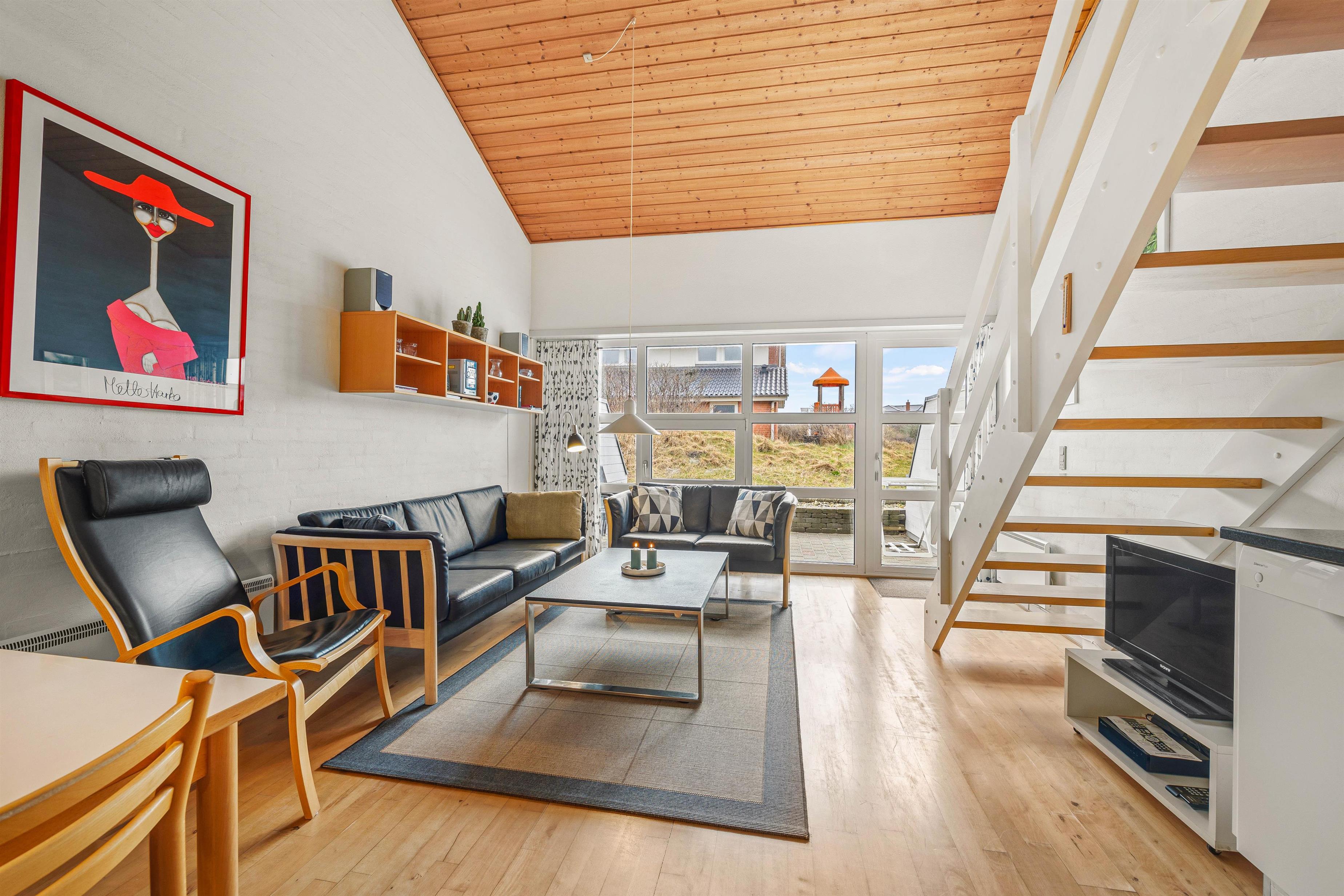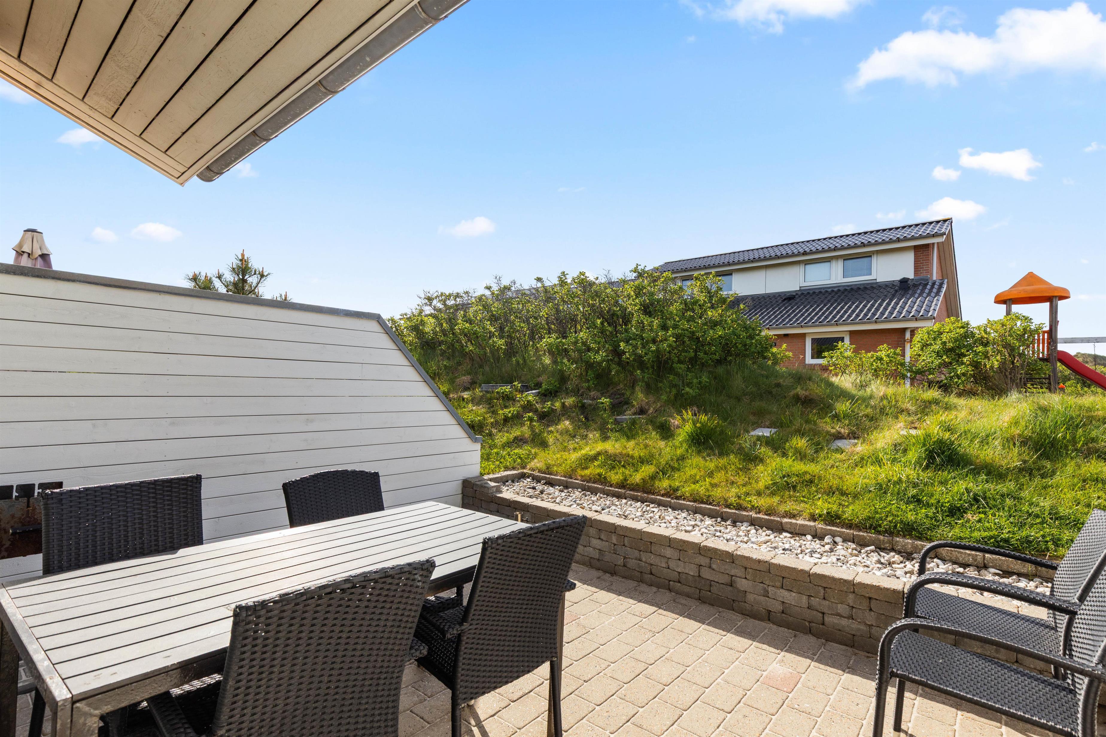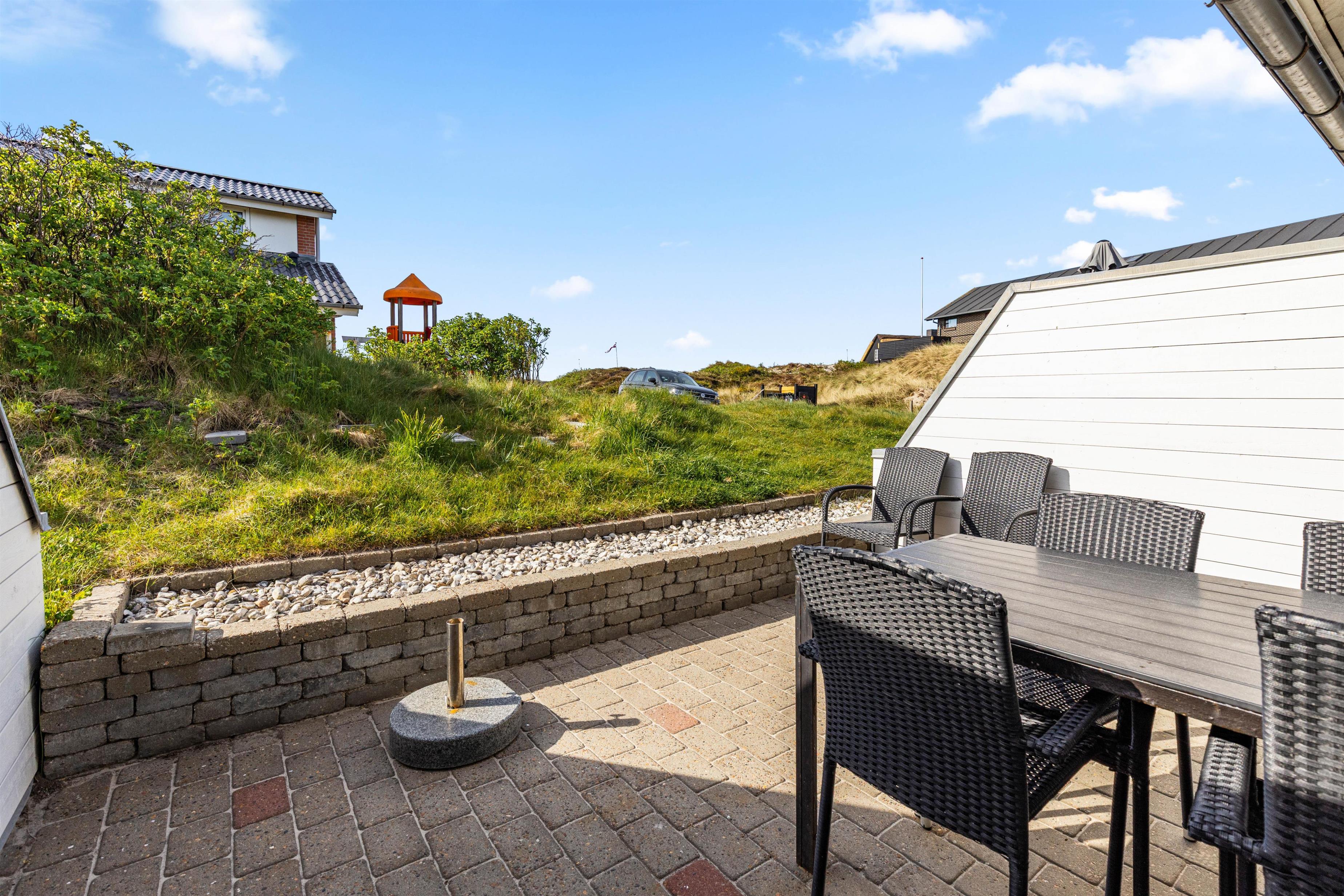 Direkte fra stuen kommer I ud på den sydvestvendte terrasse. Her står havemøblerne klar, og afskærmningen sørger for, at I kan nyde solen helt uforstyrret. På solskinsdage er en tur til stranden naturligvis også oplagt - kun 100 meter fra lejligheden.