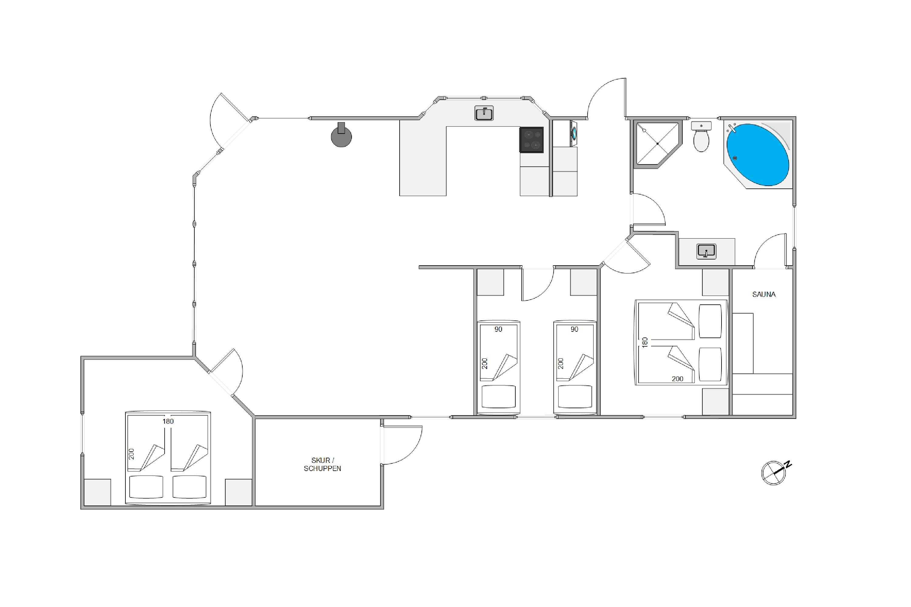 På sommerhusets badeværelse venter jer et lille wellnessområde, hvor I kan nyde skønne, afslappende stunder. Her står spaen klar til, at I kan slappe af i det varme, boblende vand, og derudover er der en sauna, hvor I kan nyde afslapning i den dejlige varme.