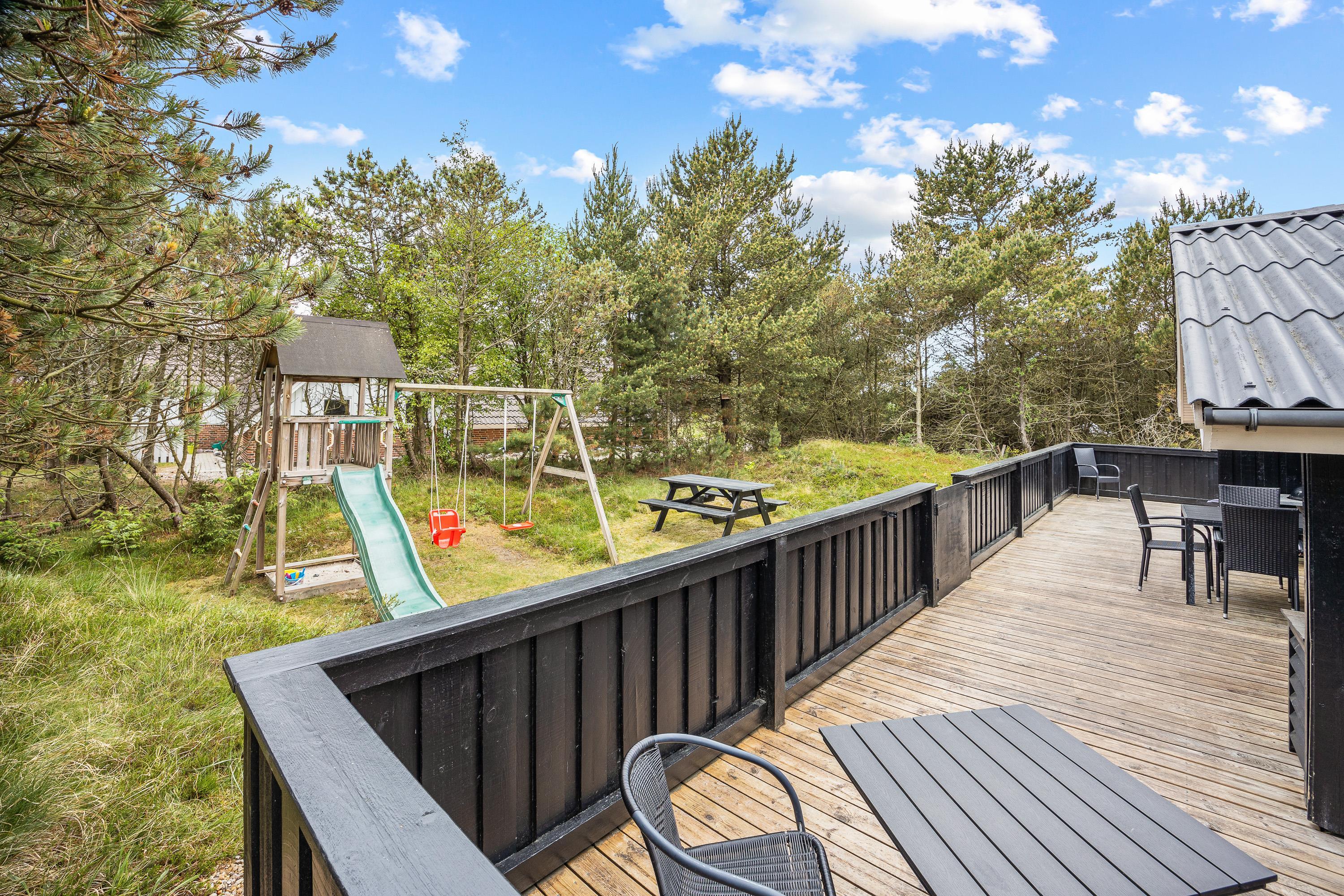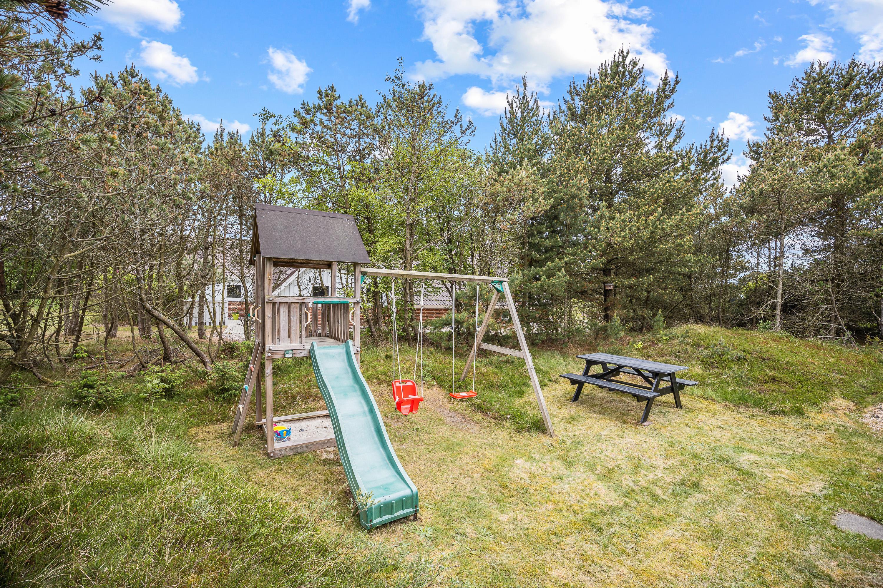 Den grønne græsplæne er et paradis for børnene og hundene, og der står et legetårn med rutsjebane og gyngestativ til de små feriegæster.