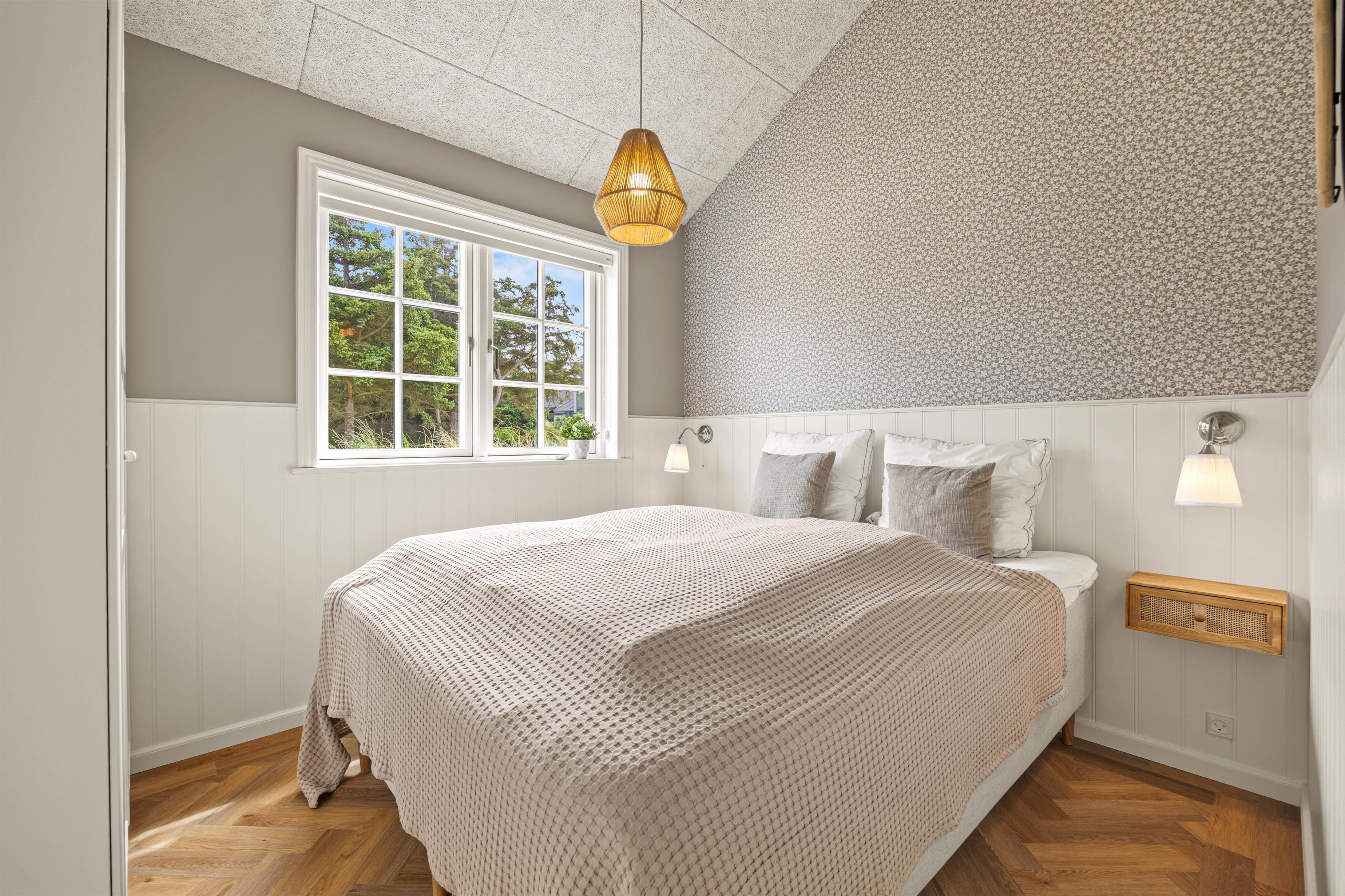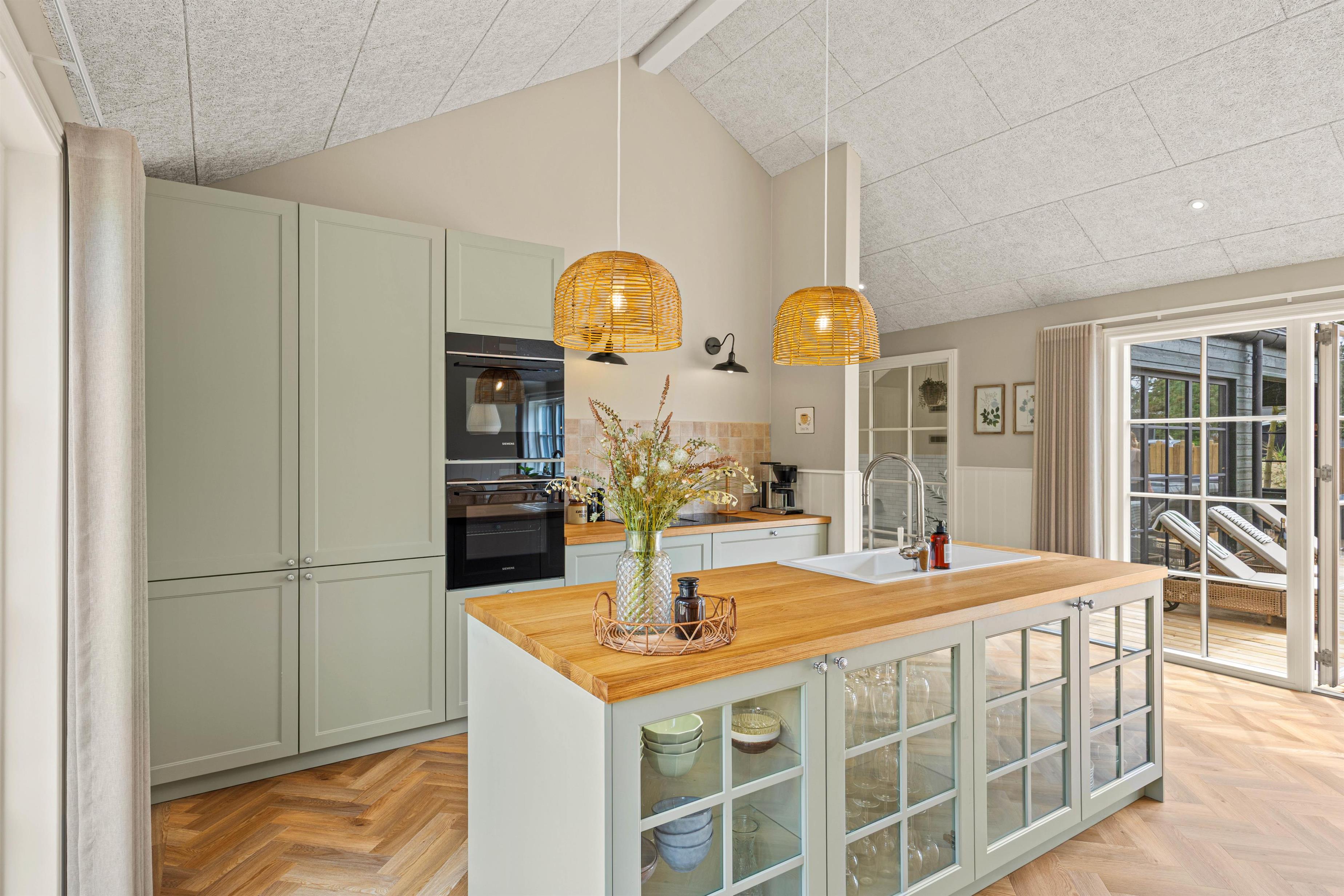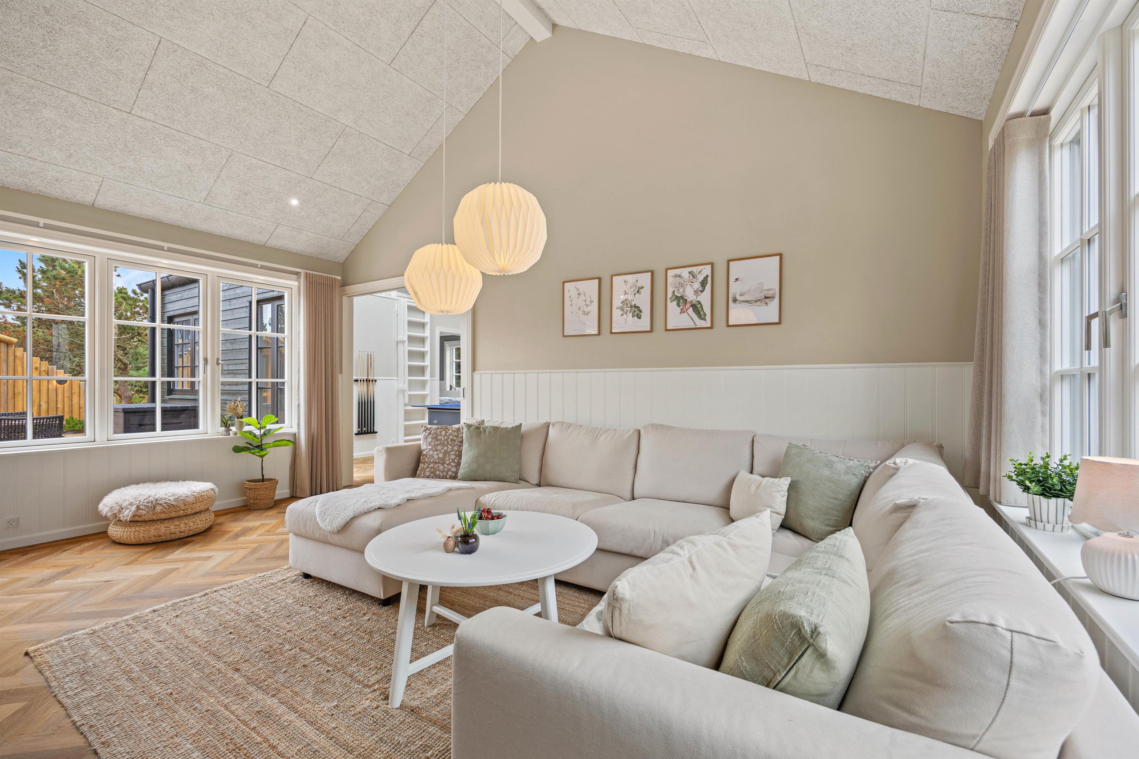 Hjerterummet er det lyse alrum, der forener stue og køkken. Her er en varm og rar atmosfære, og dagslyset strømmer gennem de mange vinduer. Her er plads til familielivet; uanset om I skal lave mad, holde spilleaften eller se en god film i fjernsynet. Med den hyggelige brændeovn er der lagt op til rigtig feriehygge – tænd op i brændeovnen efter en dejlig vandretur i den skønne natur eller smid jer i sofaen med en god krimi og et glas vin. Endvidere byder sommerhuset på en energibesparende varmepumpe samt alle hverdagens hjælpere herunder vaskemaskine og tørretumbler.