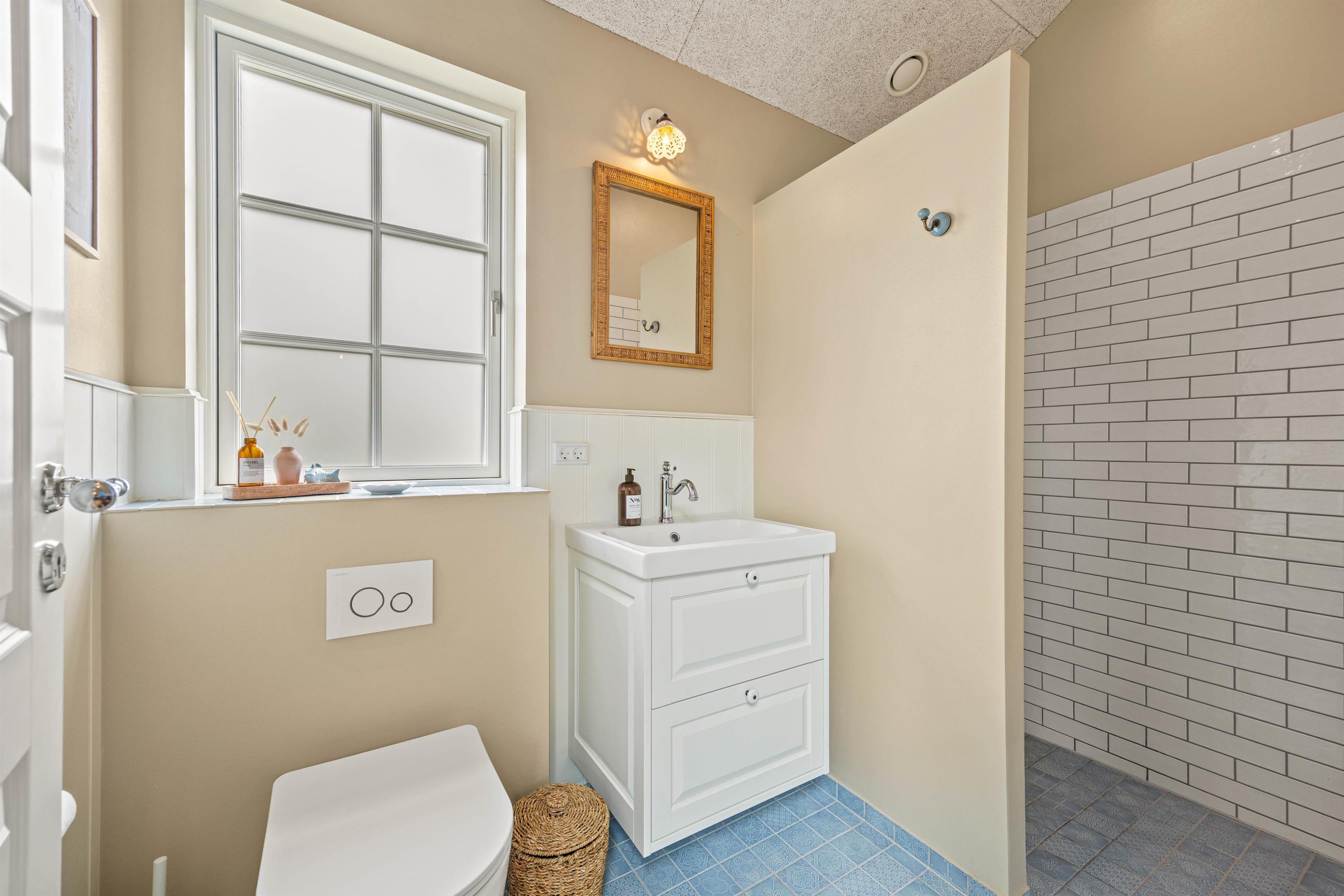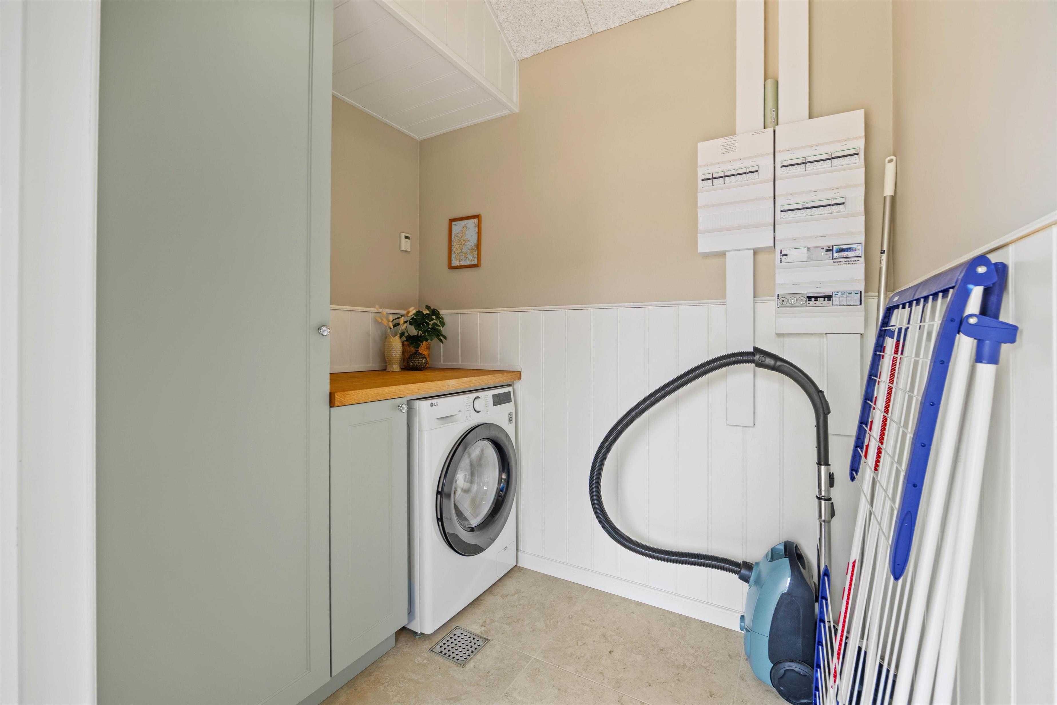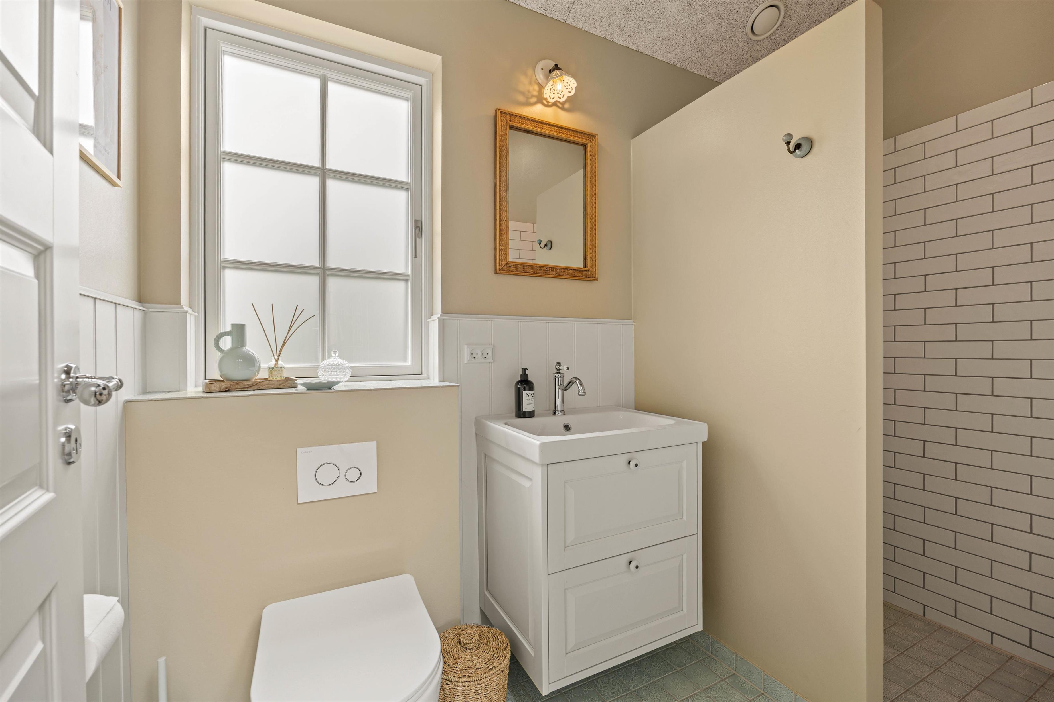 Hjerterummet er det lyse alrum, der forener stue og køkken. Her er en varm og rar atmosfære, og dagslyset strømmer gennem de mange vinduer. Her er plads til familielivet; uanset om I skal lave mad, holde spilleaften eller se en god film i fjernsynet. Med den hyggelige brændeovn er der lagt op til rigtig feriehygge – tænd op i brændeovnen efter en dejlig vandretur i den skønne natur eller smid jer i sofaen med en god krimi og et glas vin. Endvidere byder sommerhuset på en energibesparende varmepumpe samt alle hverdagens hjælpere herunder vaskemaskine og tørretumbler.