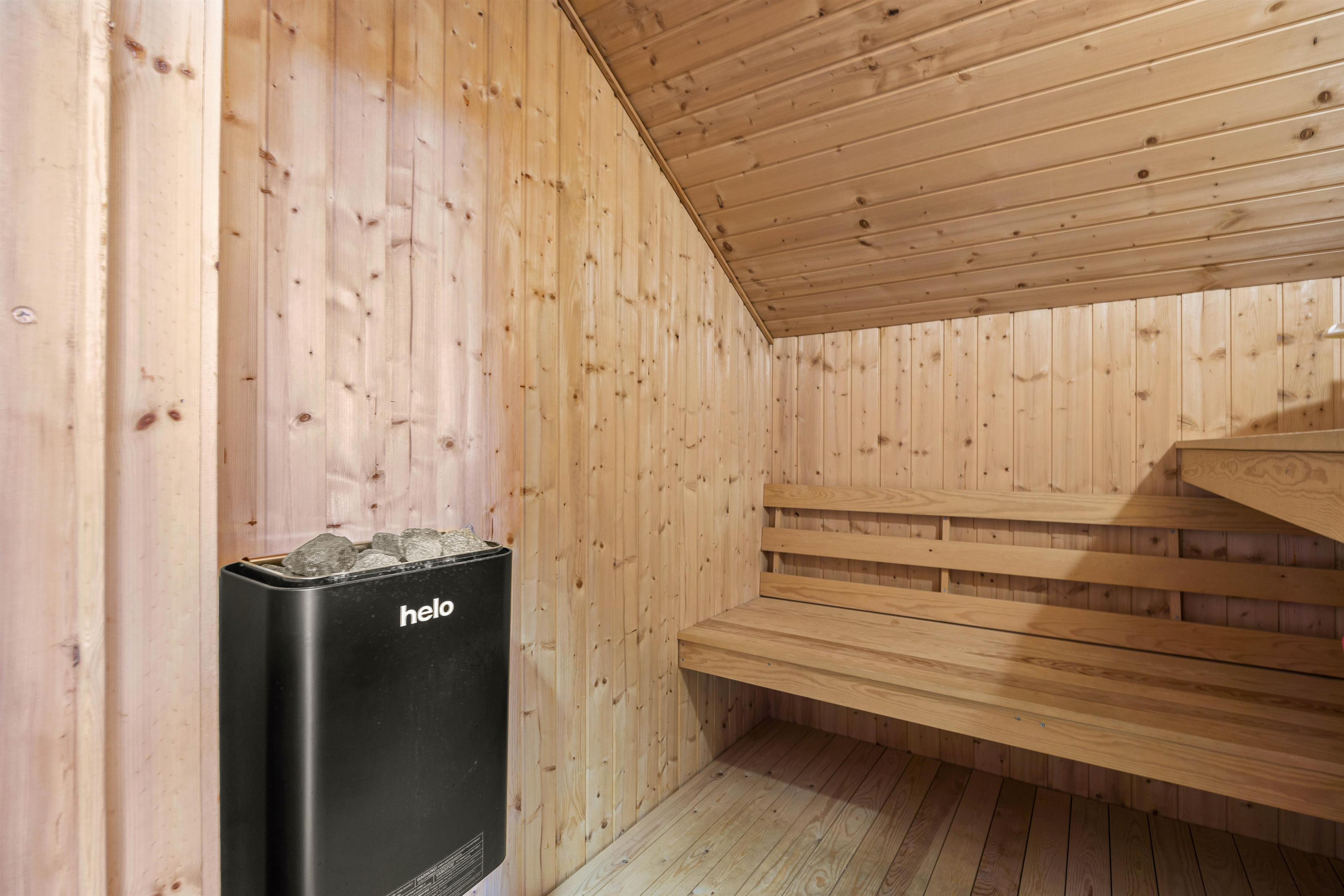 Sommerhusets rummelige badeværelse er udstyret med gulvvarme, vaskemaskine og tørretumbler. Her finder I også et af feriehusets highlights – nemlig saunaen. Her kan I nyde varmen og slappe af efter en lang gåtur ved vandet på en blæsende efterårsdag.