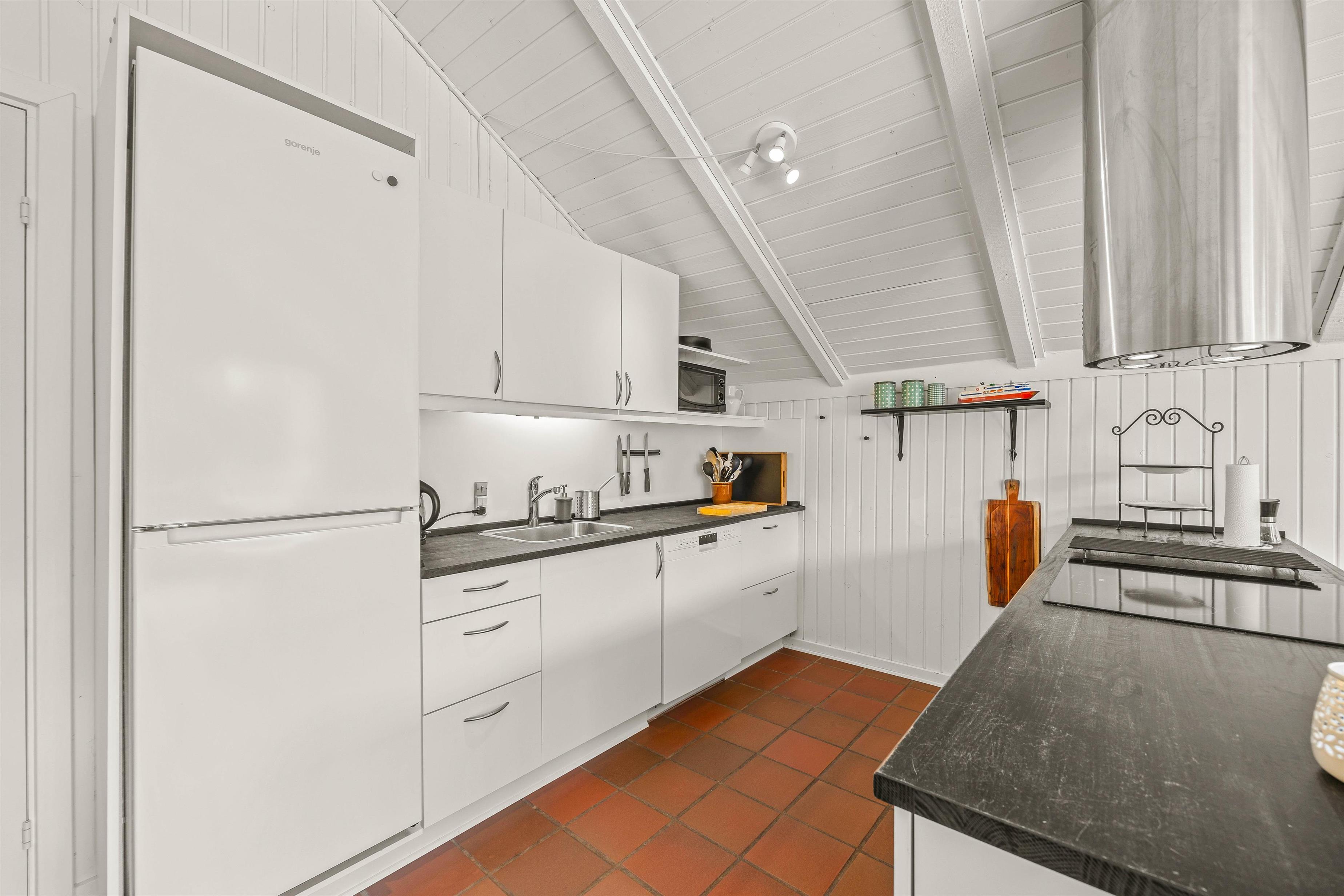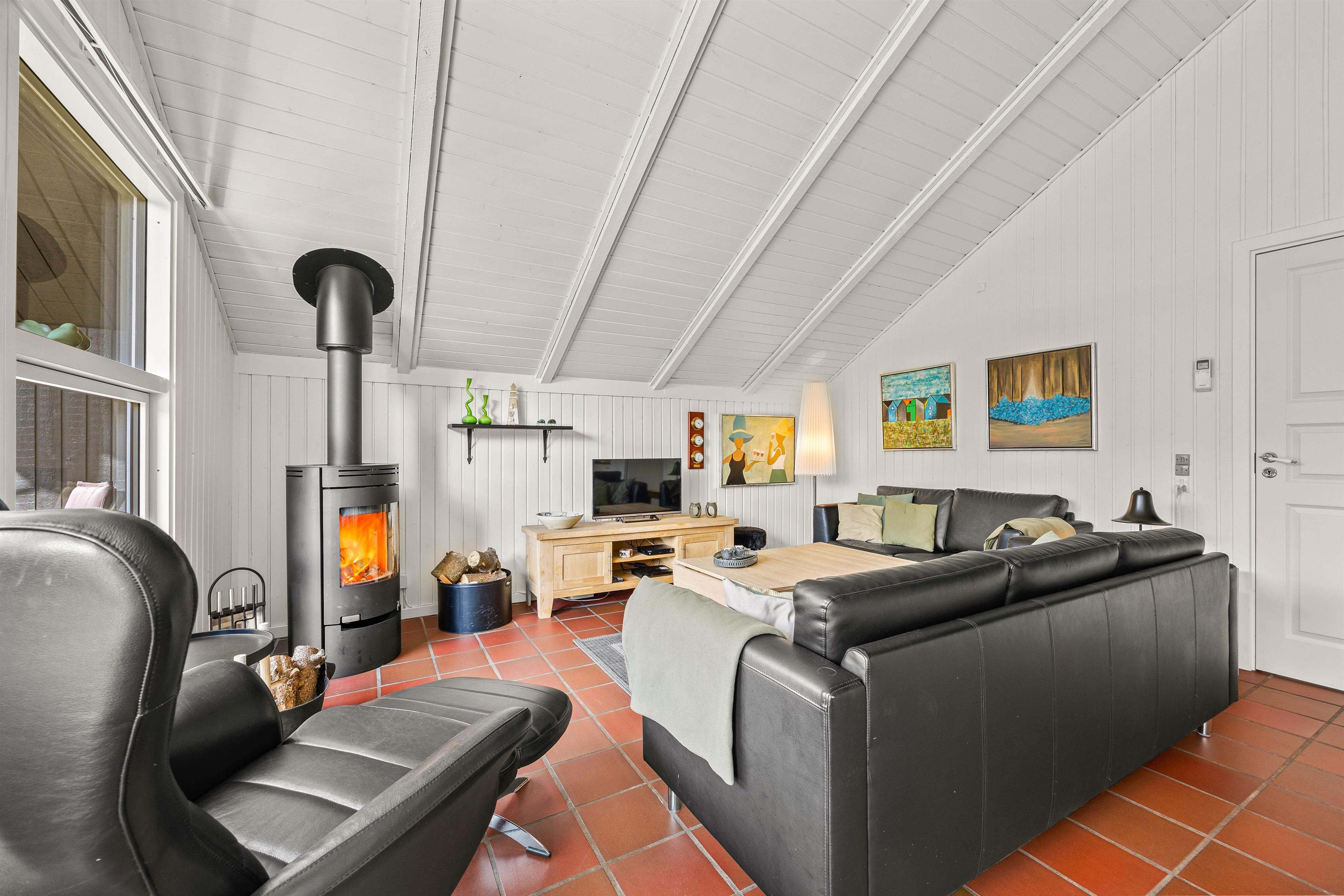 Sommerhusets hjerterum er alrummet, hvor køkken, spiseplads og stue ligger samlet i ét. Køkkenet og stuen er kun adskilt af en køkken-ø. Her kan du altså stå og kokkerere samtidig med, at du kan have kontakt til resten af familien, der slapper af foran brændeovnen i sofaen med en god film. I sommerhuset er der enkelte danske tv-kanaler. Som et ekstra plus er der også en varmepumpe, som I kan bruge til at holde et godt indeklima.