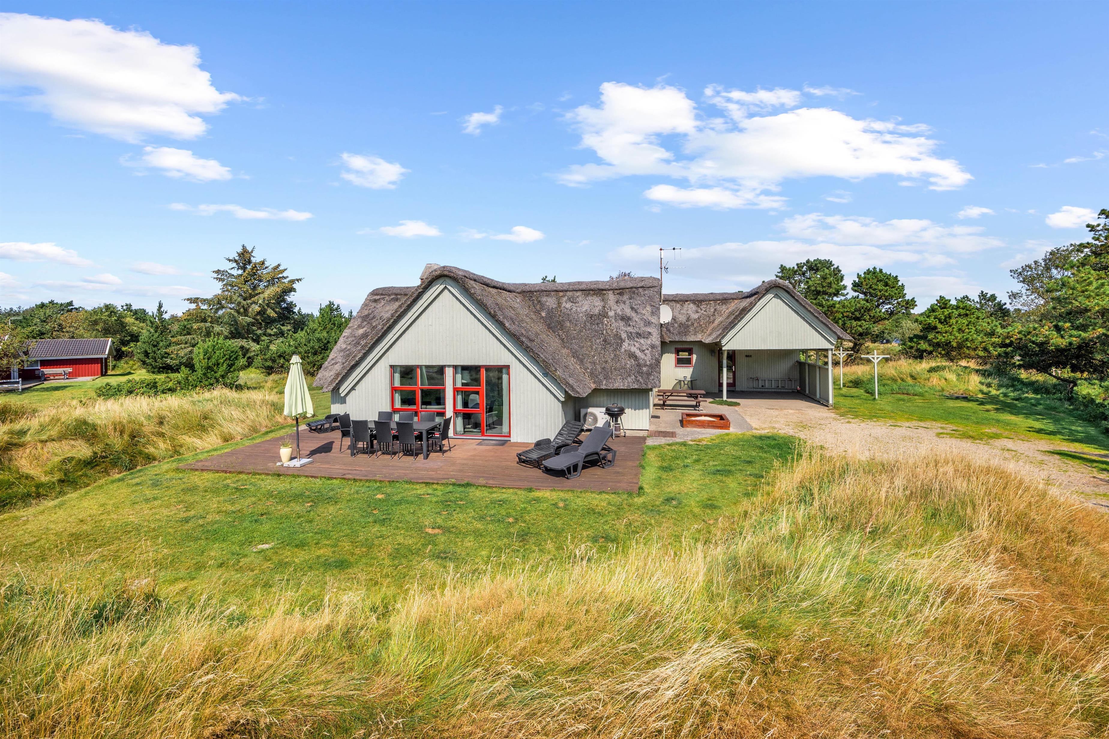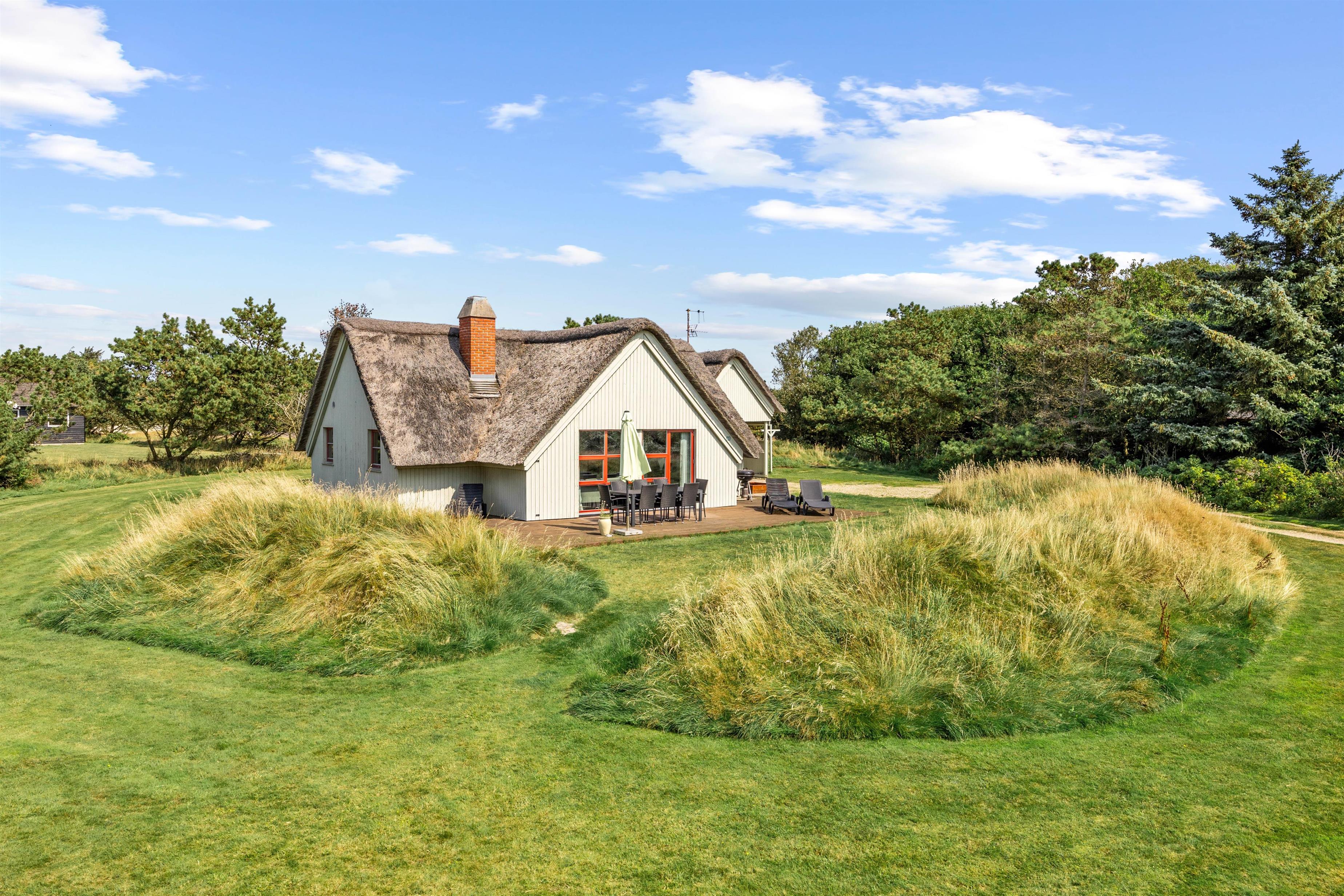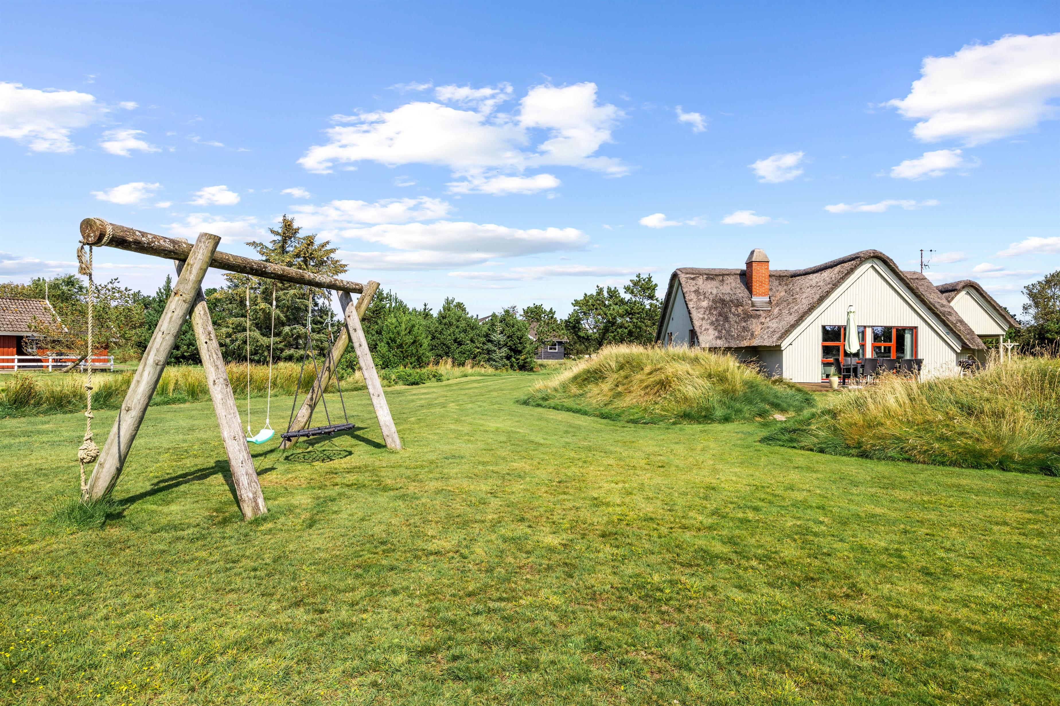 Det flotte stråtækte hus ligger på en stor grund, der er omkranset af lyng og træer. Det naturskønne område skaber en flot kulisse om huset, som både du og børnene kan få glæde af. Området giver børnene masser af mulighed for leg og underholdning – og du kan nyde den grønne udsigt fra husets store terrasse, mens du f.eks. slapper af med en god bog.