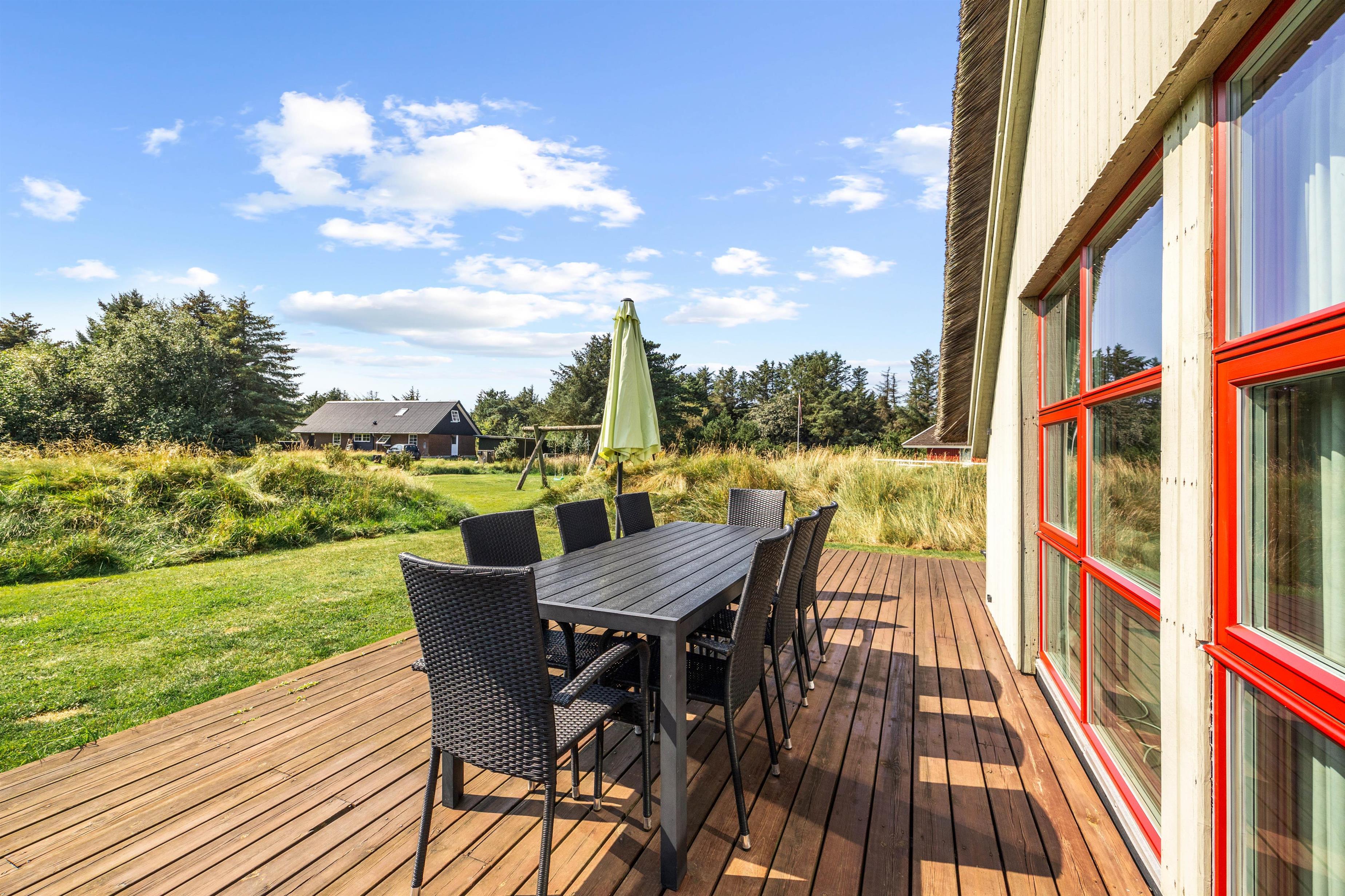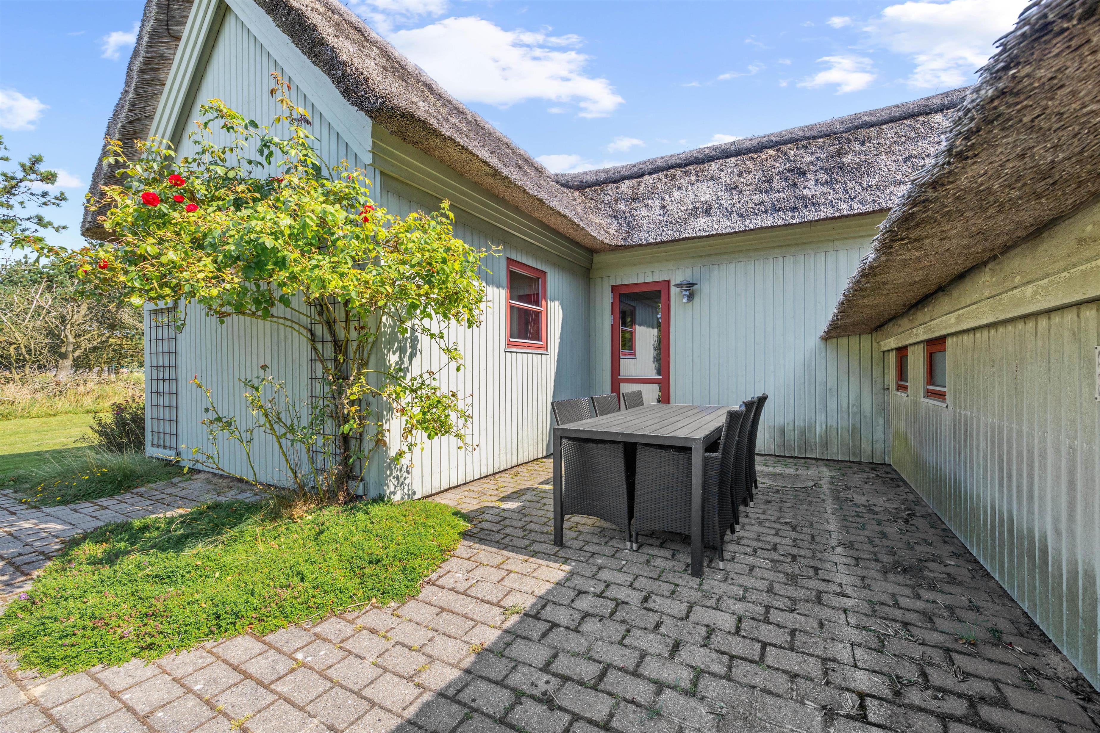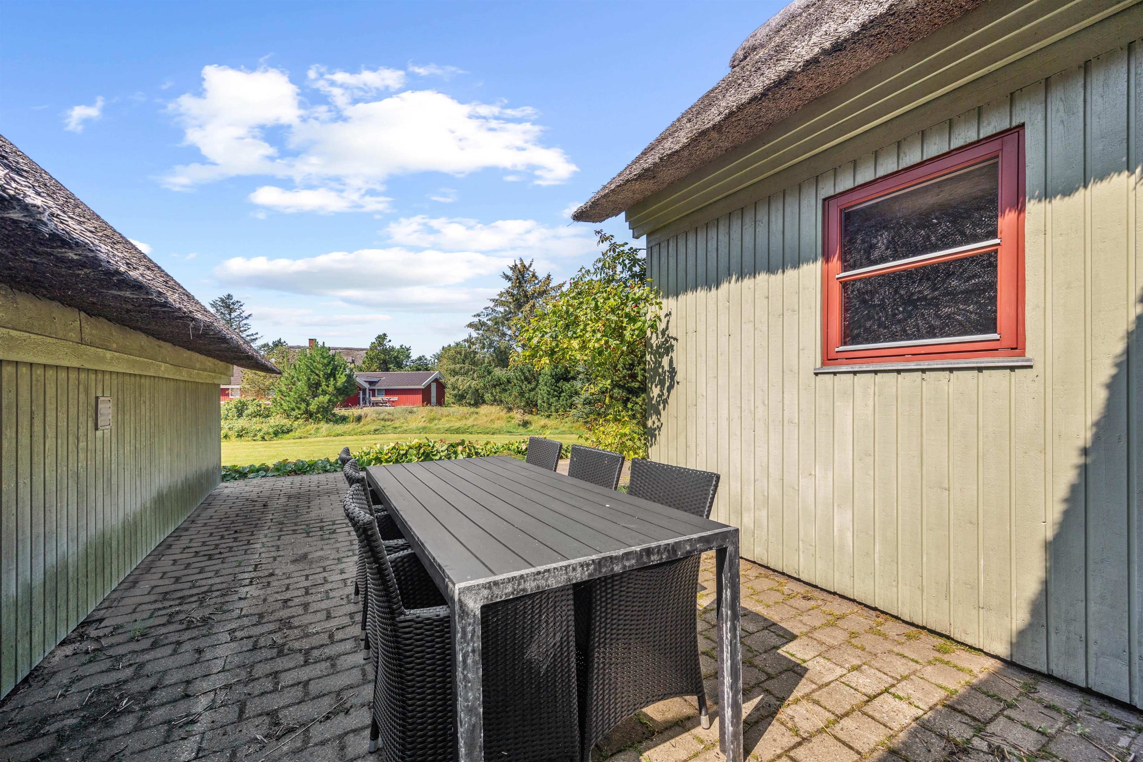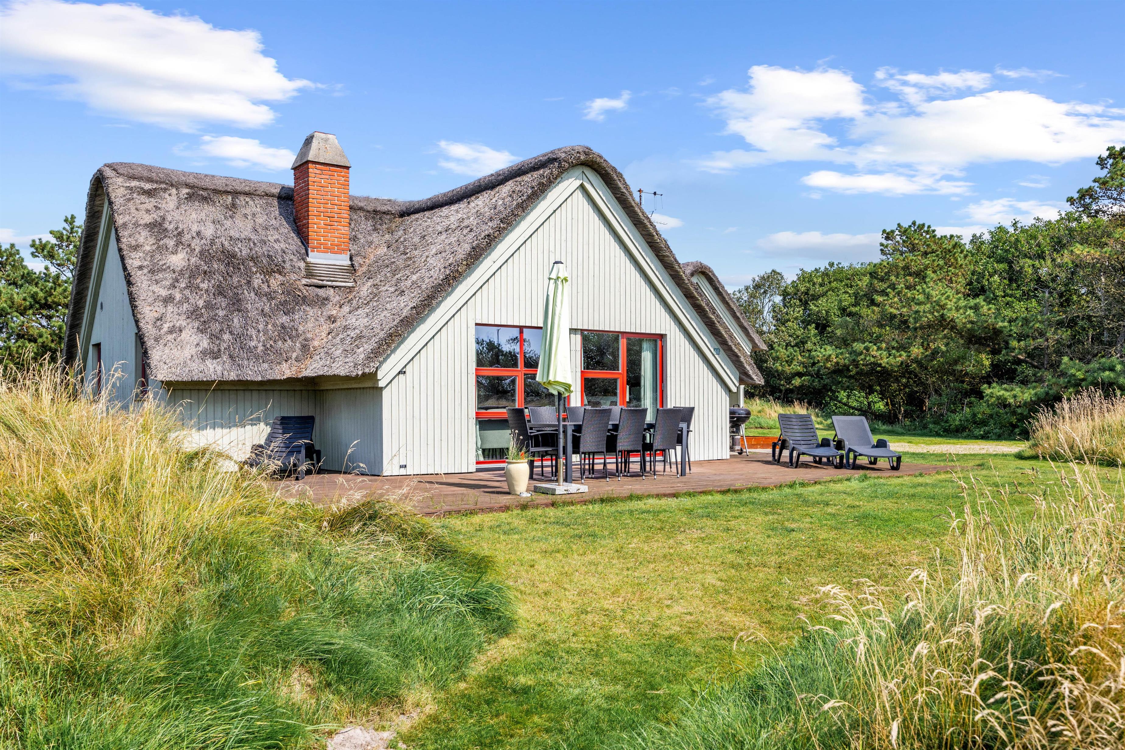 Det flotte stråtækte hus ligger på en stor grund, der er omkranset af lyng og træer. Det naturskønne område skaber en flot kulisse om huset, som både du og børnene kan få glæde af. Området giver børnene masser af mulighed for leg og underholdning – og du kan nyde den grønne udsigt fra husets store terrasse, mens du f.eks. slapper af med en god bog.