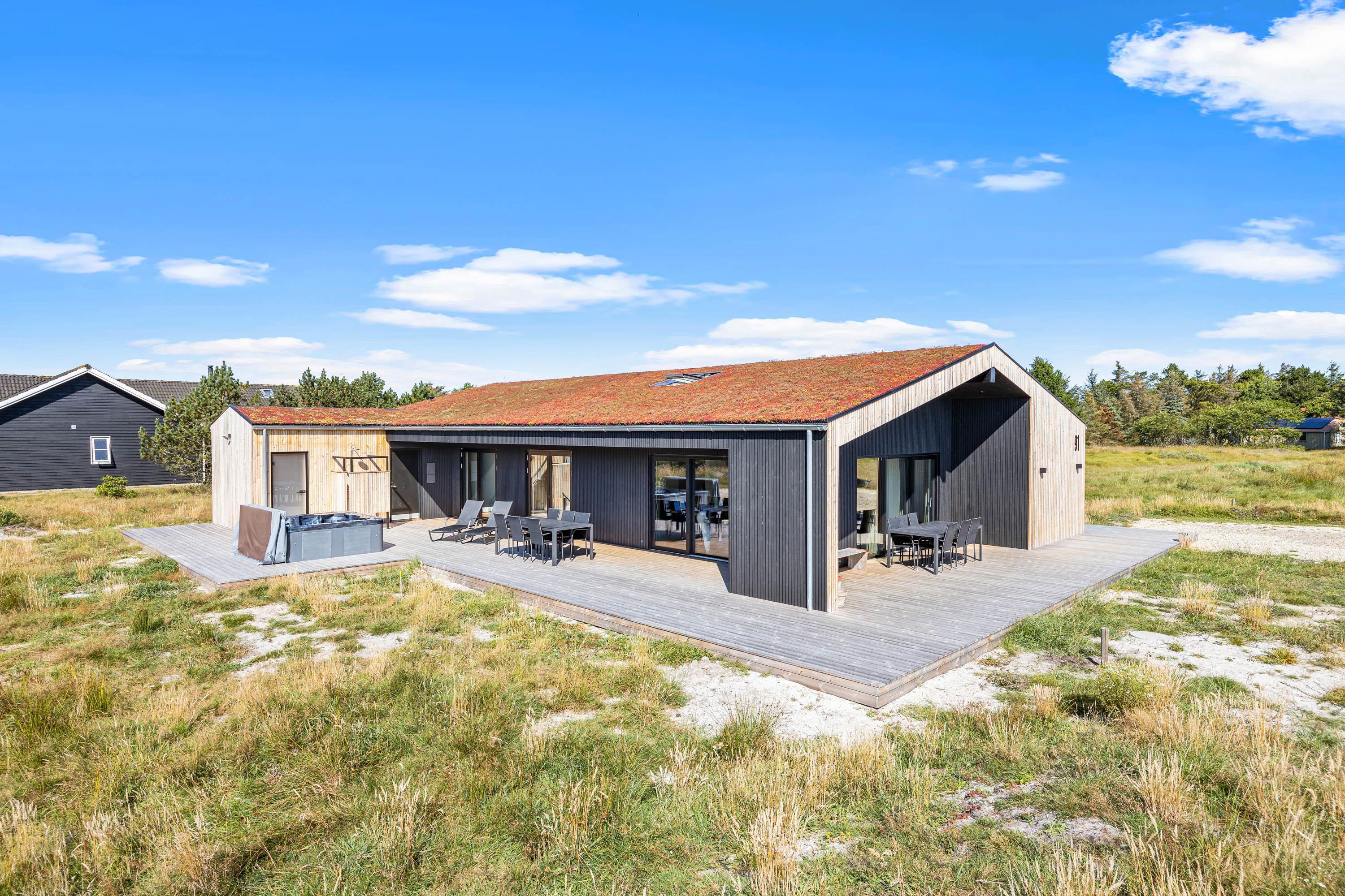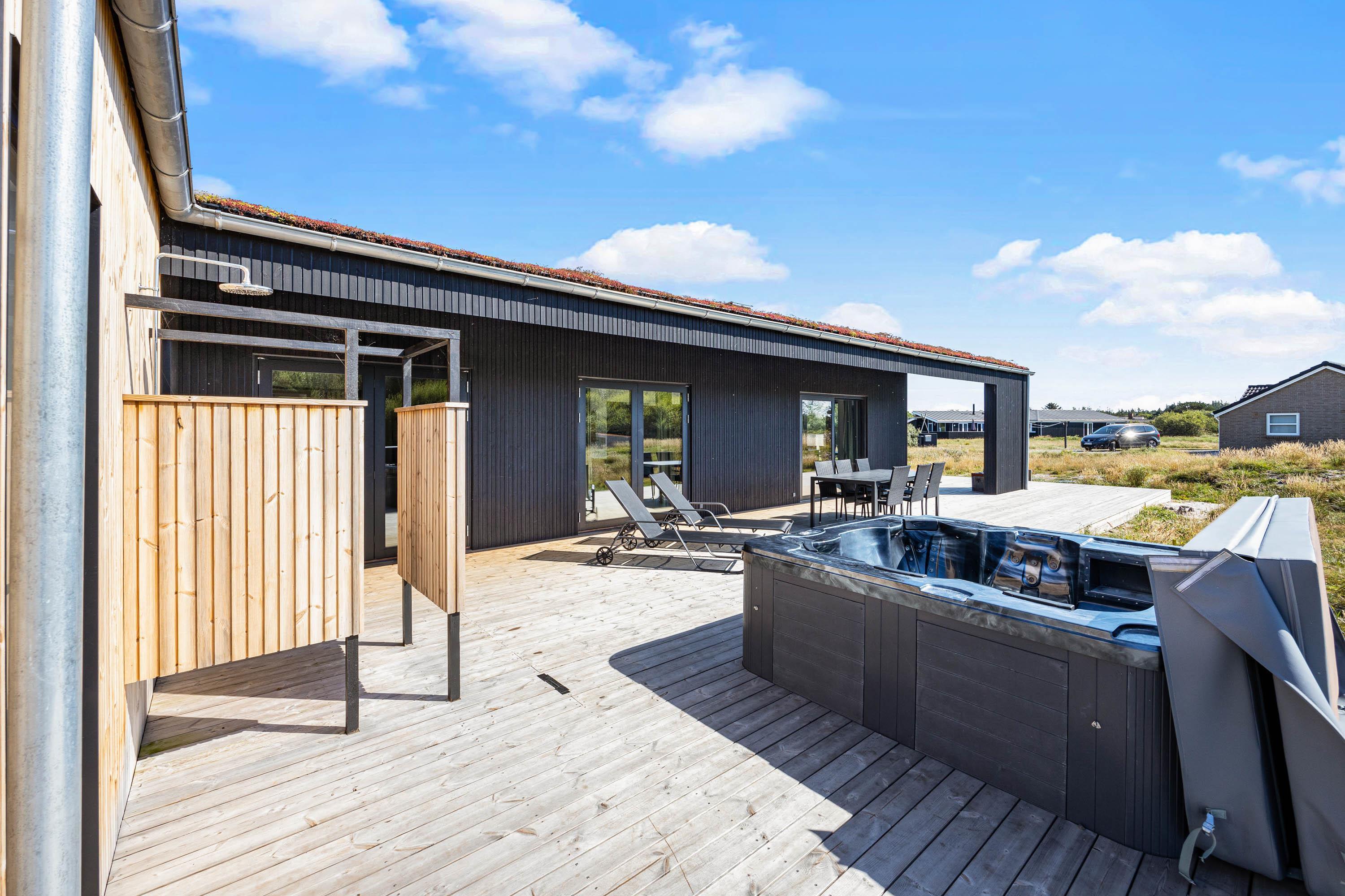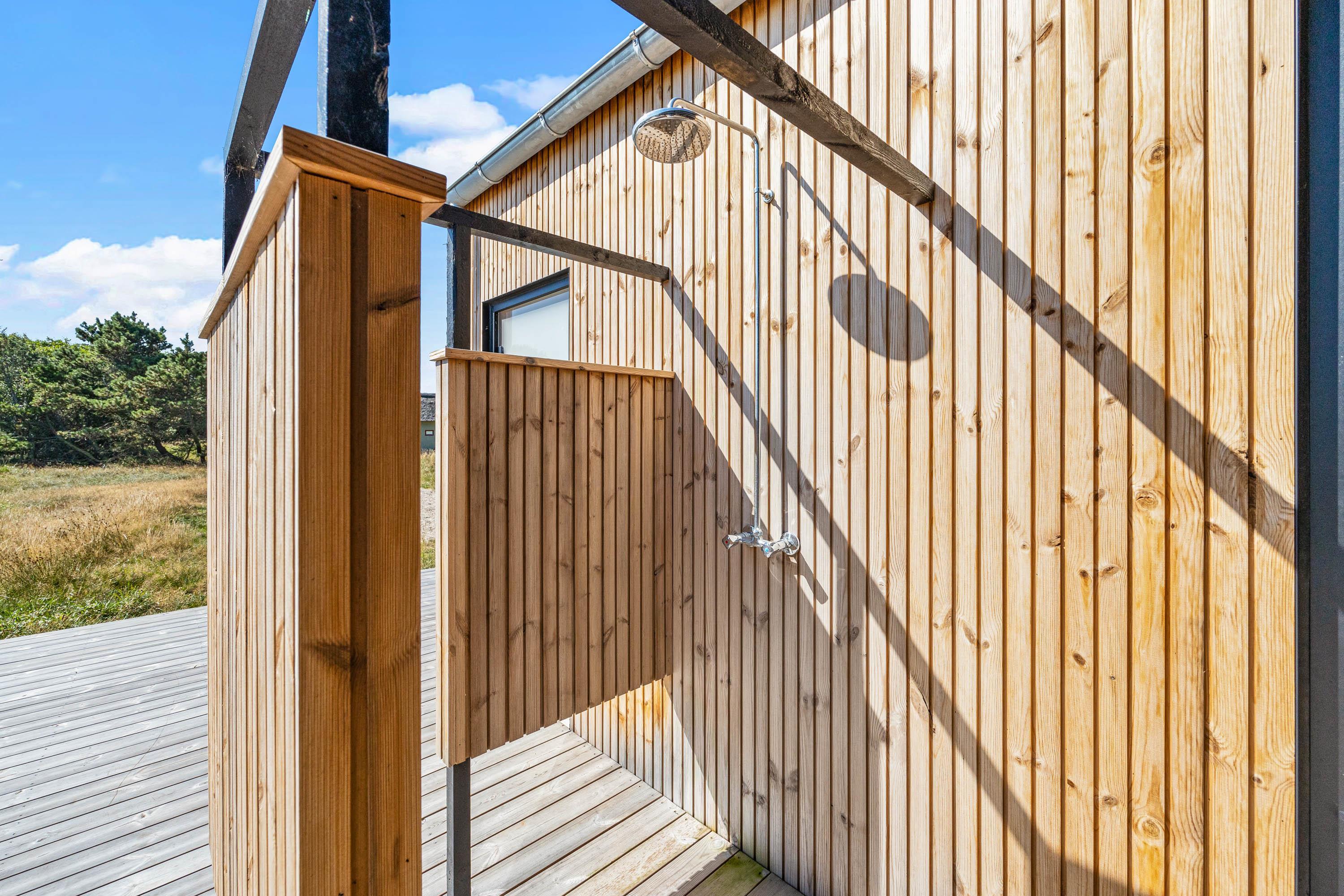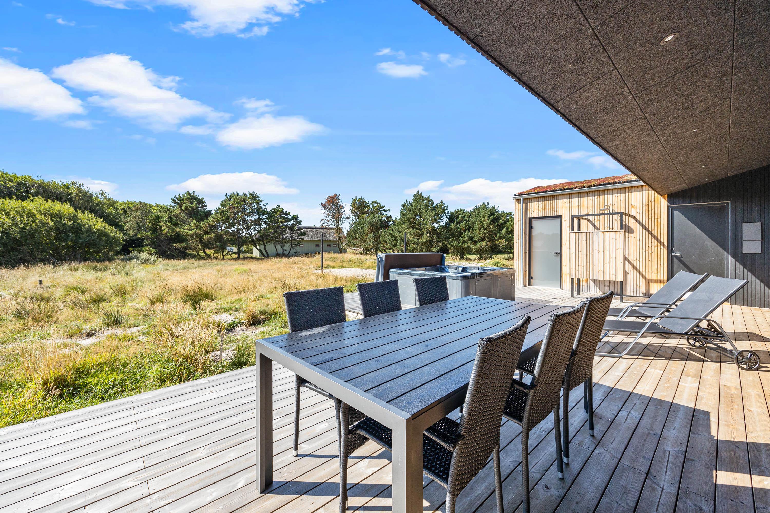 Med både overdækkede og åbne terrasser kan man nyde sommeren i alt slags vejr, og er man til en hyggelig grillaften kan sommerhuset grill benyttes til formålet. Vil man hellere nyde dagen med noget wellness, er sommerhuset udespa og udesauna oplagt. Og efter en gåtur i de bløde sandstrande, kan sandet vaskes af ved sommerhusets udebruser. Udebruser er lukket fra 1. november til 1. april på grund af frostsikring. Sommerhuset ligger desuden på en smuk naturgrund, hvor man kan følge med i årstidernes skiftende skønhed.