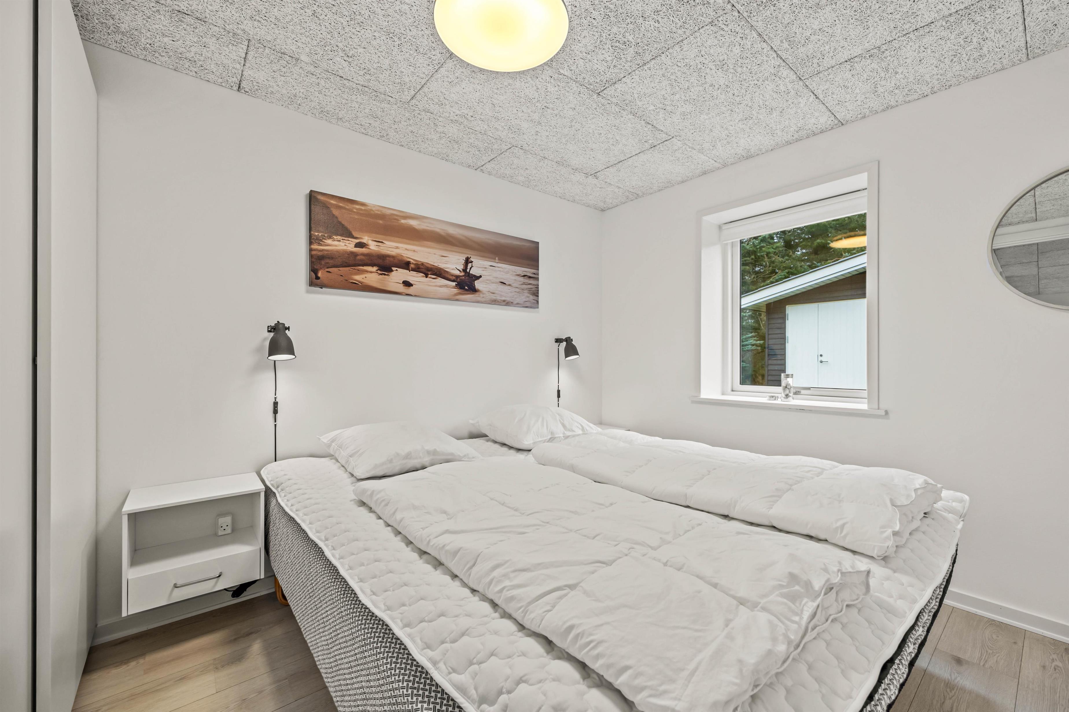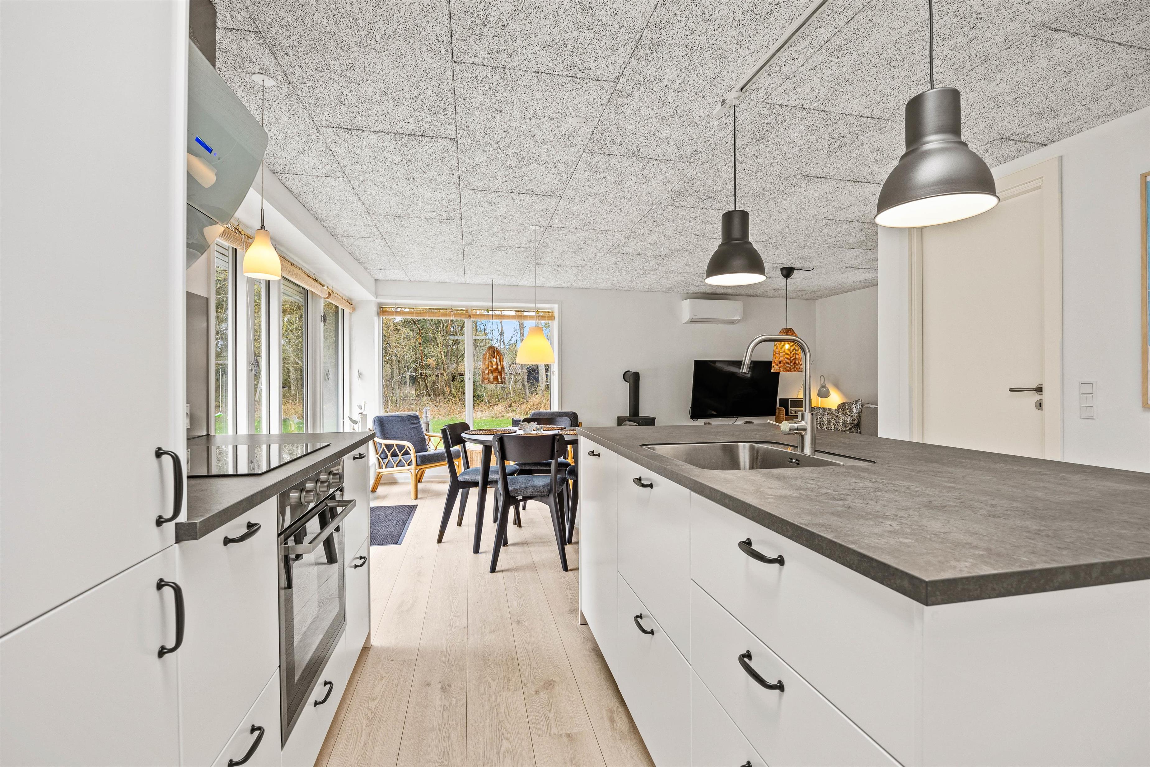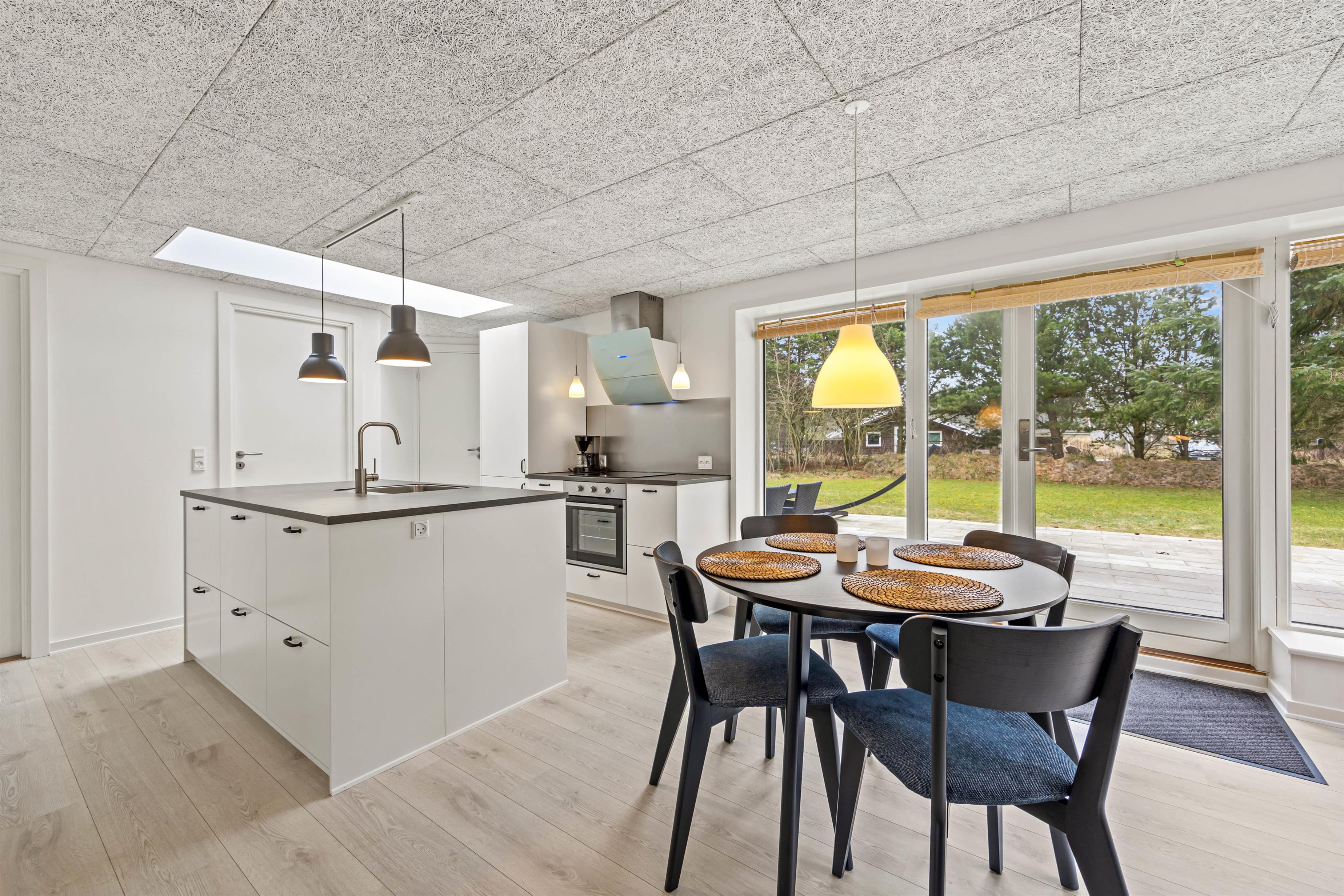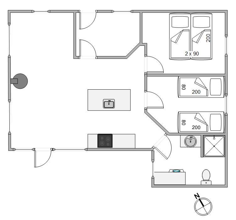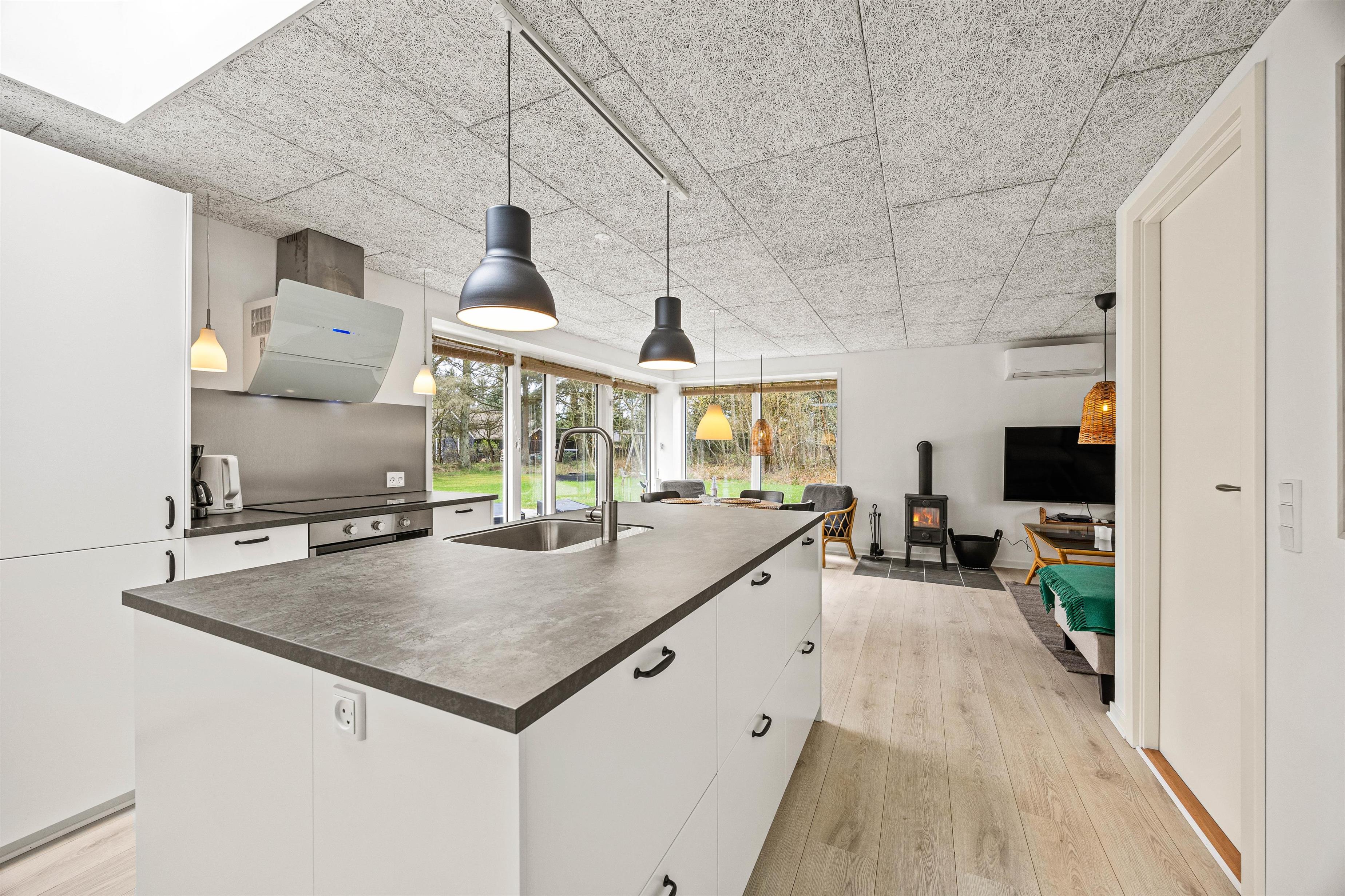 Sommerhuset har en klassisk indretning, der sætter rammerne om en hyggelig ferie for jeres familie. Feriehuset har 2 soveværelser, 1 badeværelse med gulvvarme samt et stort opholdsrum, hvor køkken, stue og spisestue hænger sammen. Her kan I samles til skønne måltider omkring spisebordet og hyggelige aftener i sofaerne med lyden af brændeovnens knitren i baggrunden, der understreger den hyggelige stemning.