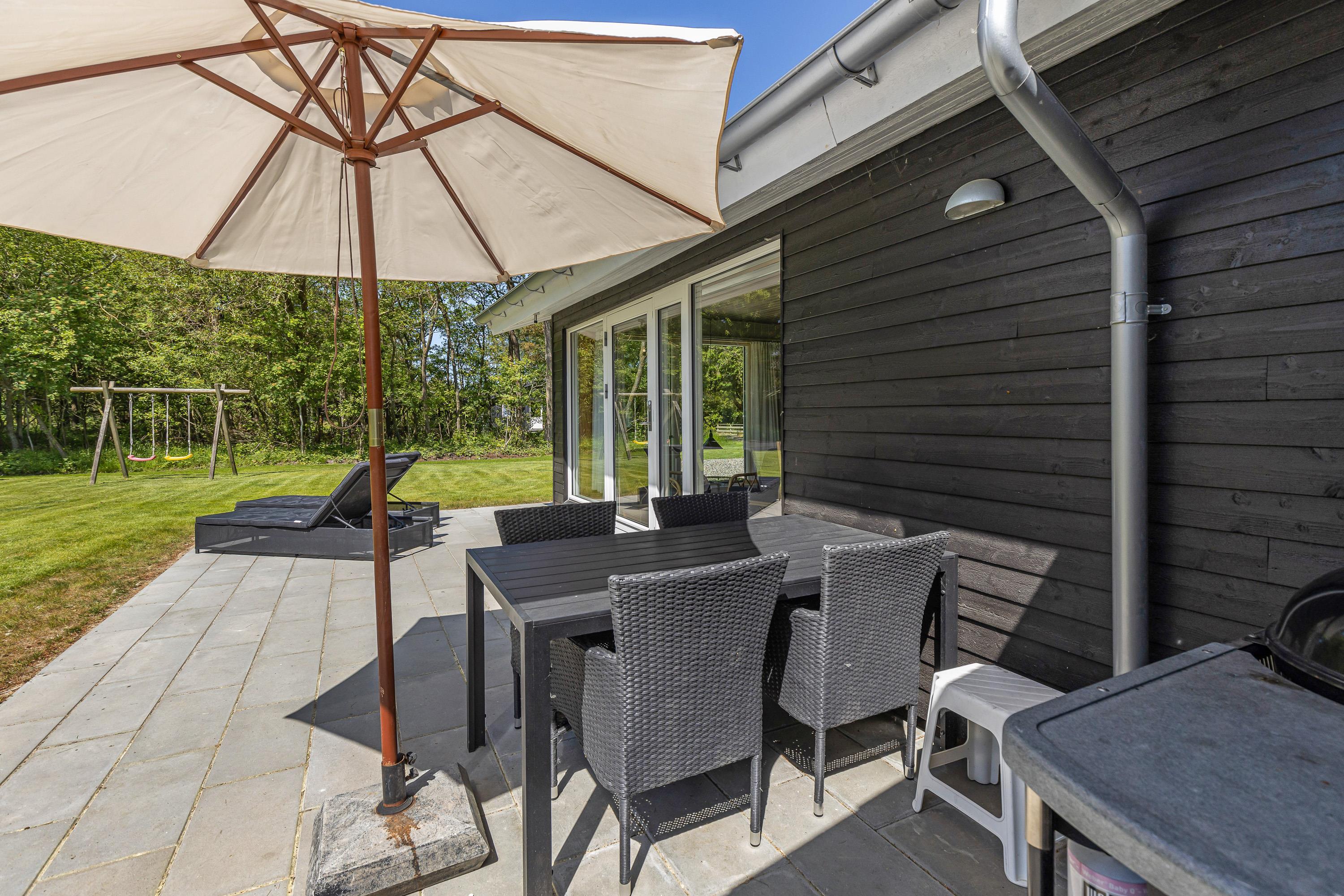 Mens børnene leger rundt i haven, kan forældrene passende slappe af på terrassen, hvor der er liggestole og havemøbler. Herfra kan I nyde udsigten til naturen og lyden af jeres børn, der leger på livet løs. Om aftenen kan I gøre klar til en lækker aftensmad på grillen, mens børnene bruger den sidste energi i haven.