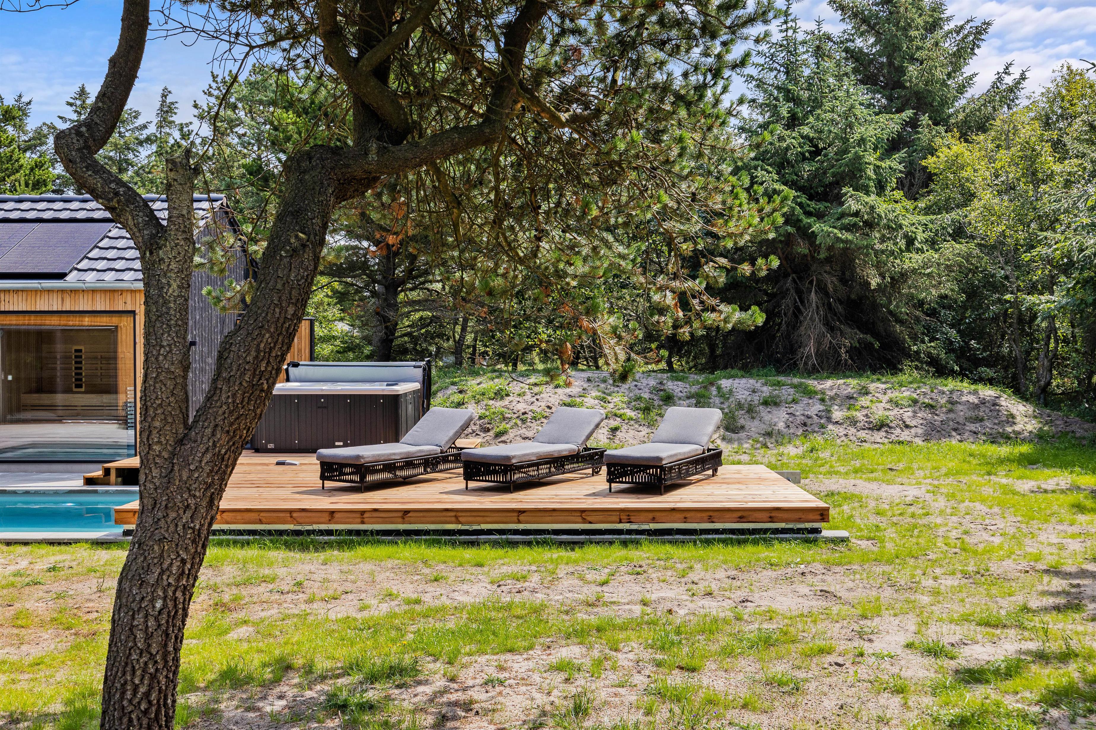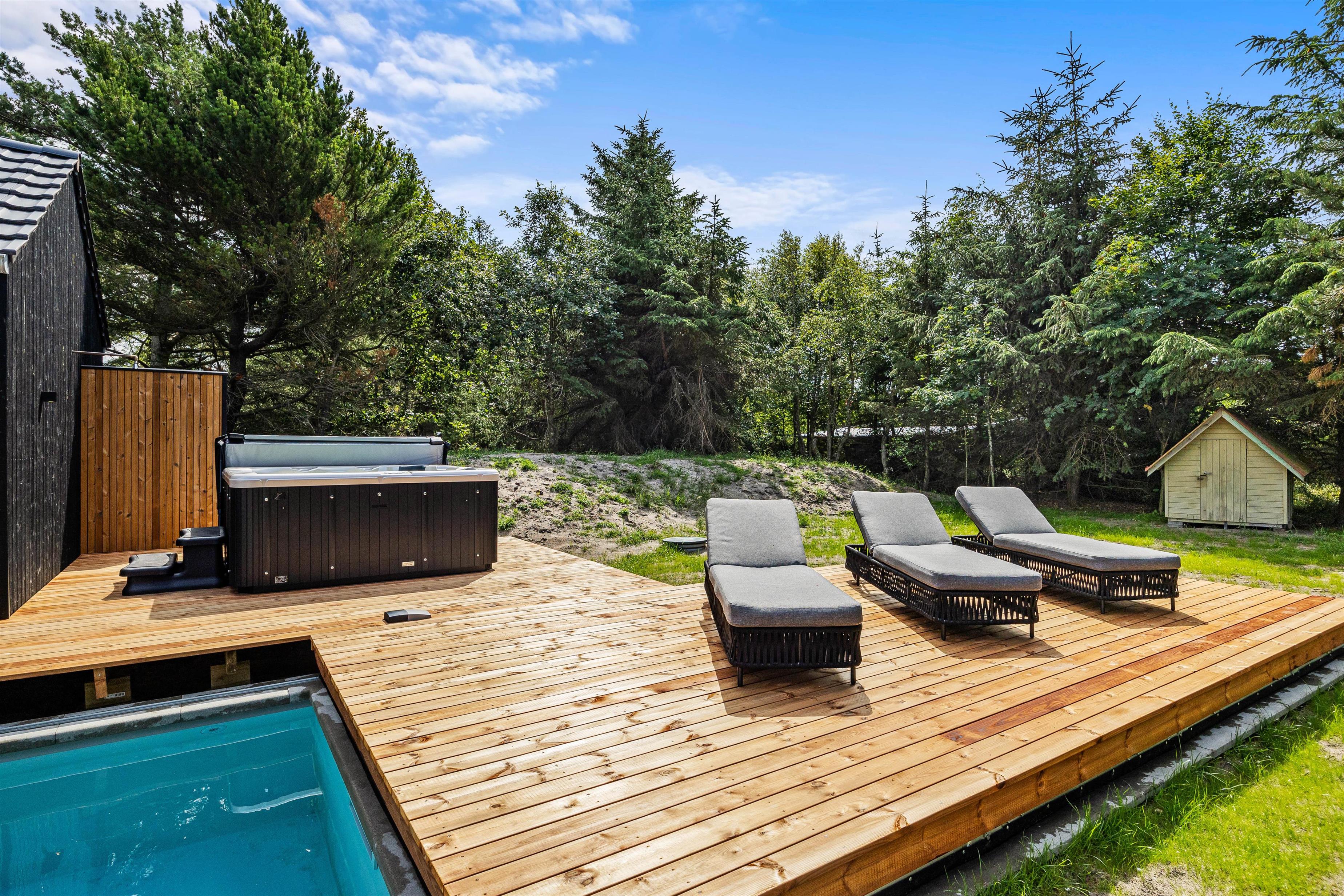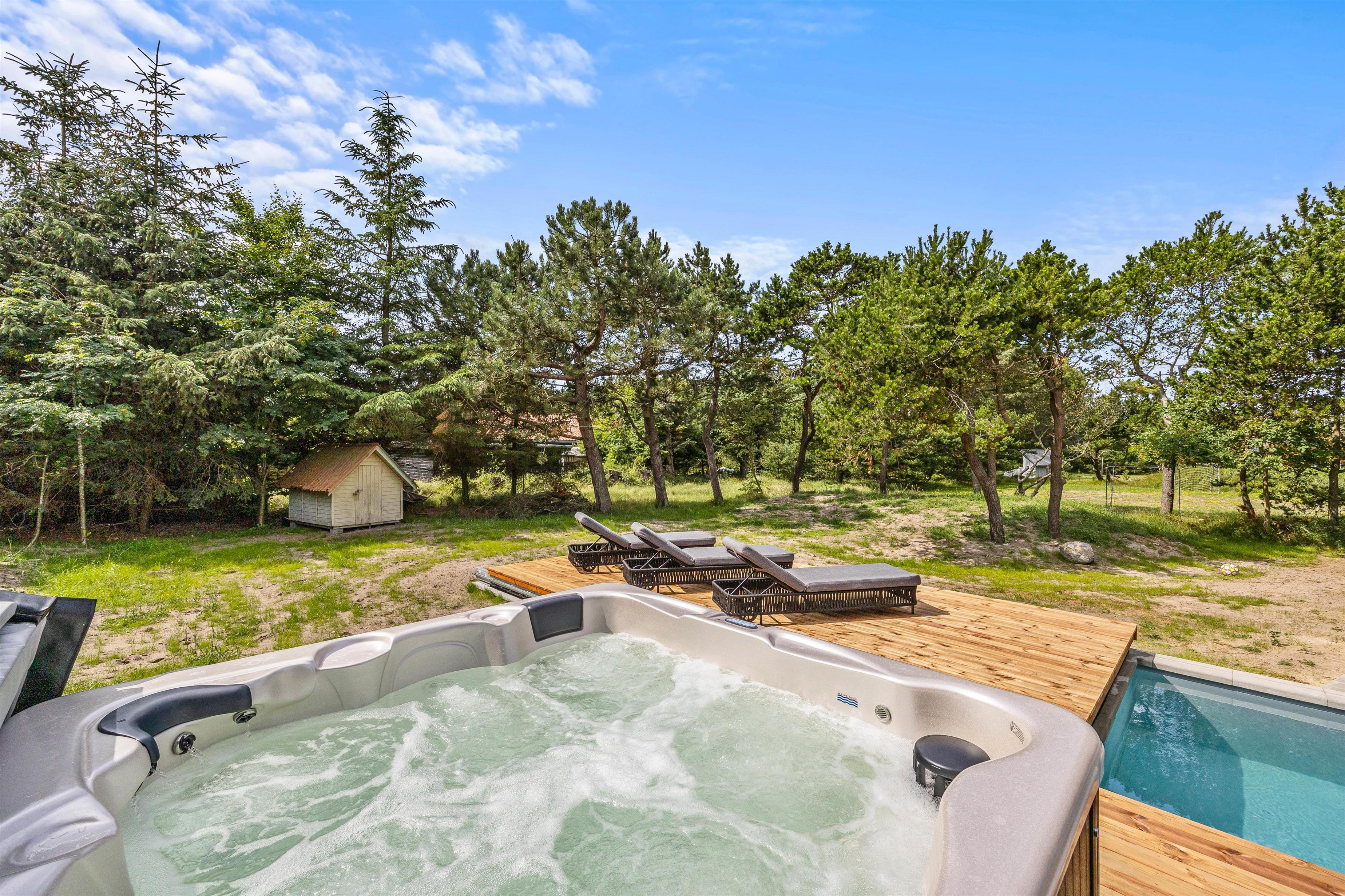 På feriehusets udeområde kan I også hoppe en tur i den 18 kvadratmeter store udepool, som helt sikkert bliver et hit blandt feriens vandhunde, der kan se frem til mange sjove stunder her. Derudover er der også en udebruser, som I kan skylle jer under efter en svømmetur. Udebruser er lukket fra 1. november til 1. april på grund af frostsikring.