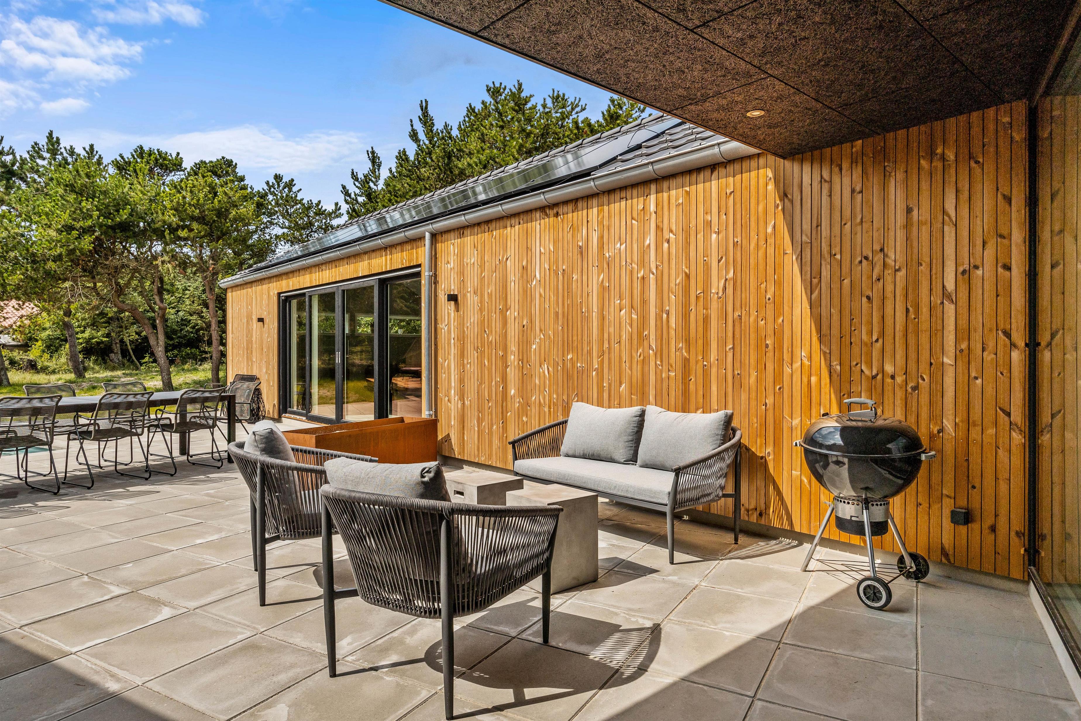 Feriehuset har en skøn, stor terrasse, som I kan tilbringe de lange sommerdage på. Her står komfortable havemøbler og liggestole klar til jer, så I kan finde jer godt til rette og slappe af i solen med en god bog eller køligt glas vin, mens børnene leger i haven, hvor der er en gynge til dem.