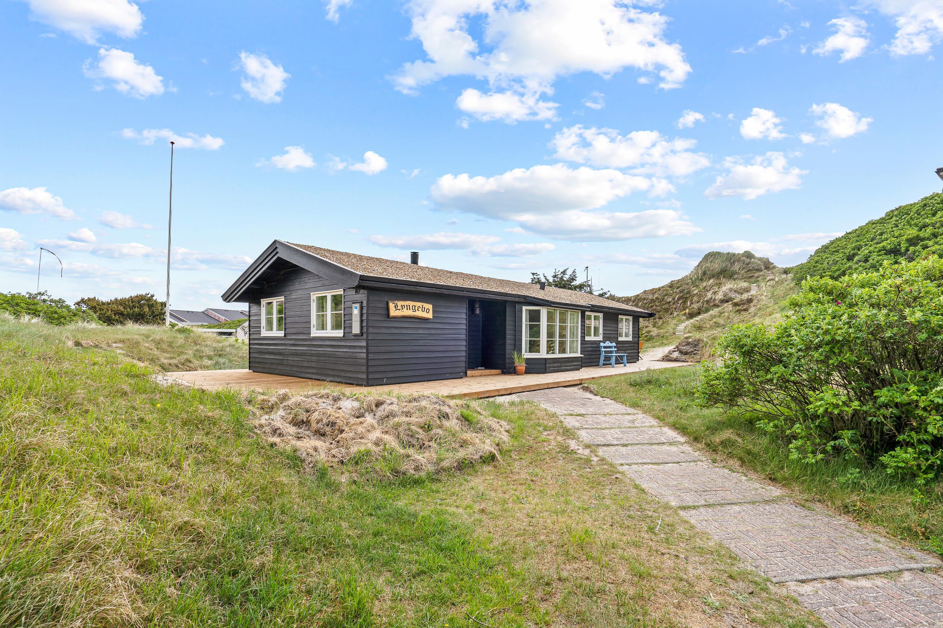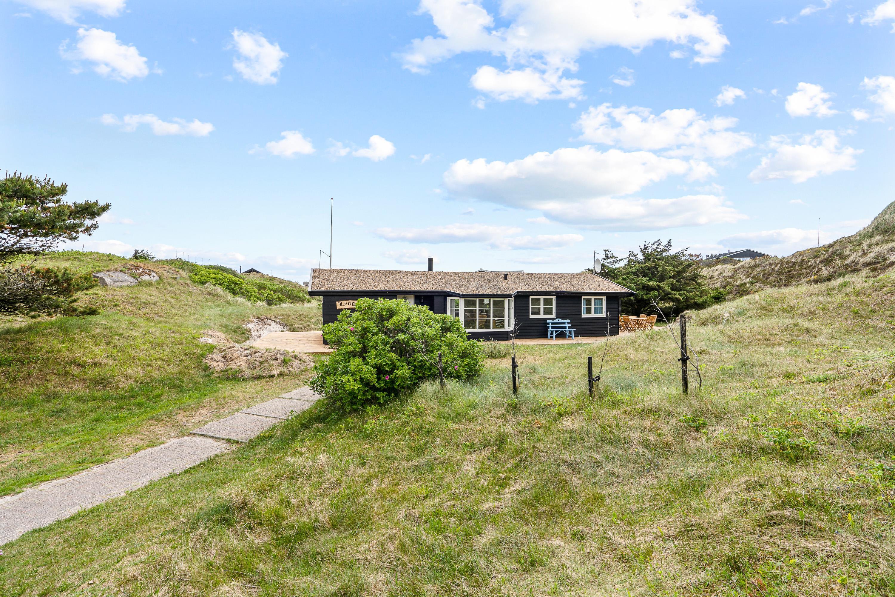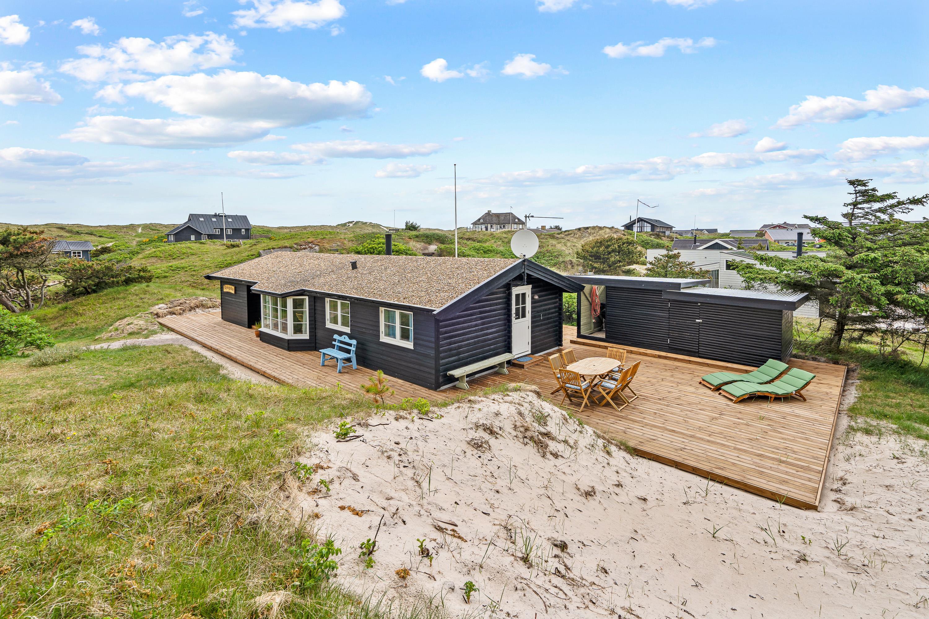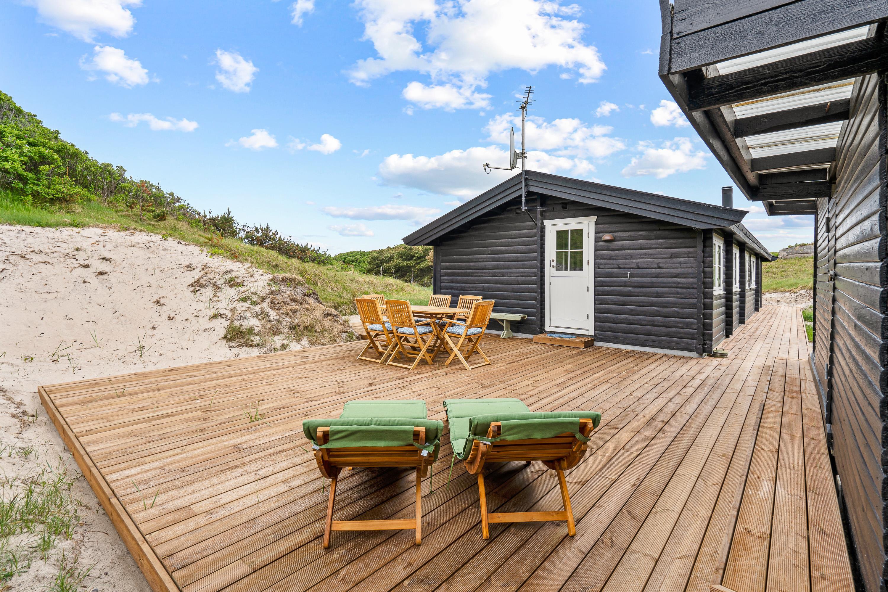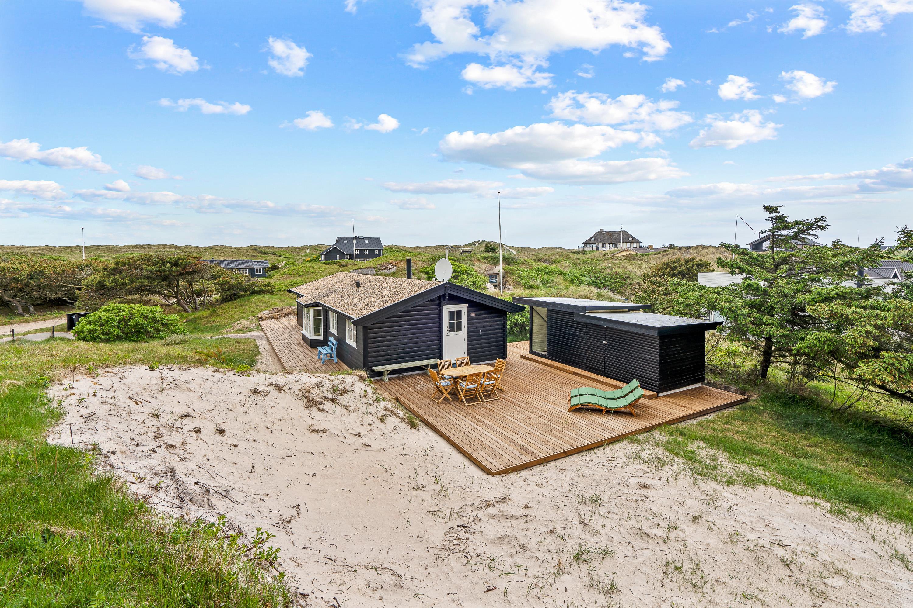 Der er dømt klassisk sommerhusidyl på Rosenvej 12 i Vejers Strand. Det charmerende træhus er placeret midt i det bakkede klitlandskab, og rundt om sommerhuset er der flere terrasser, hvorfra I kan nyde de fantastiske omgivelser og følge solens gang dagen rundt.