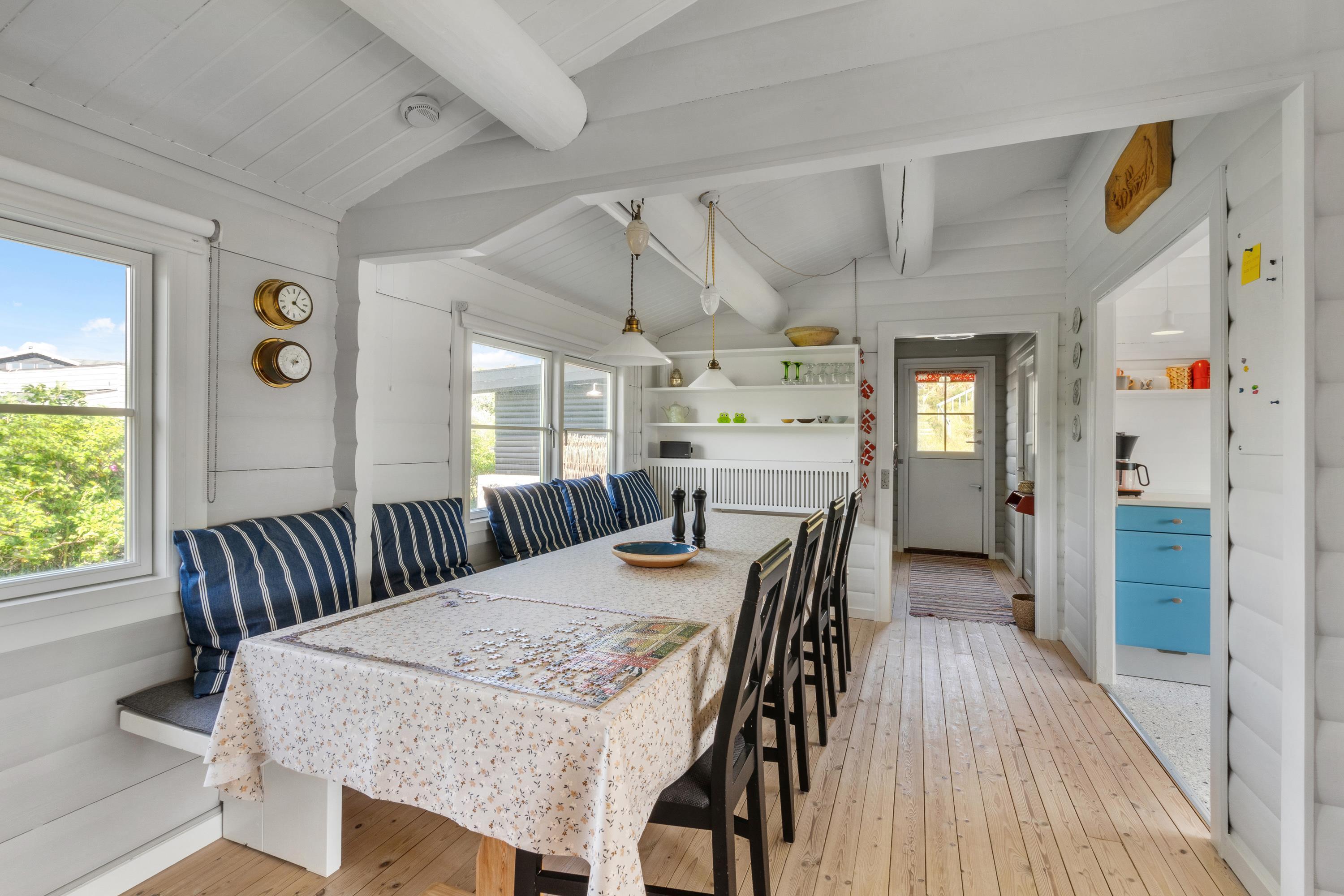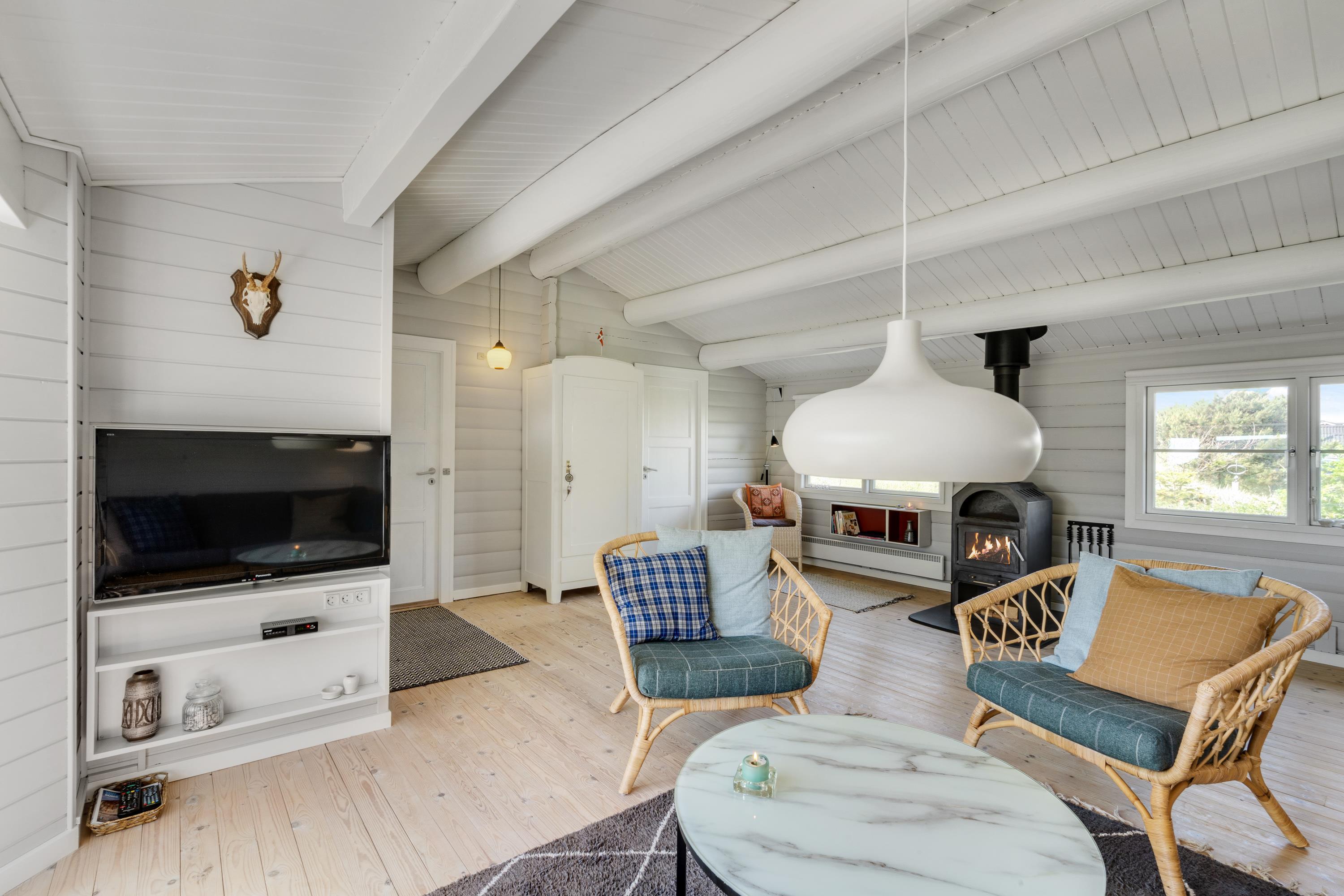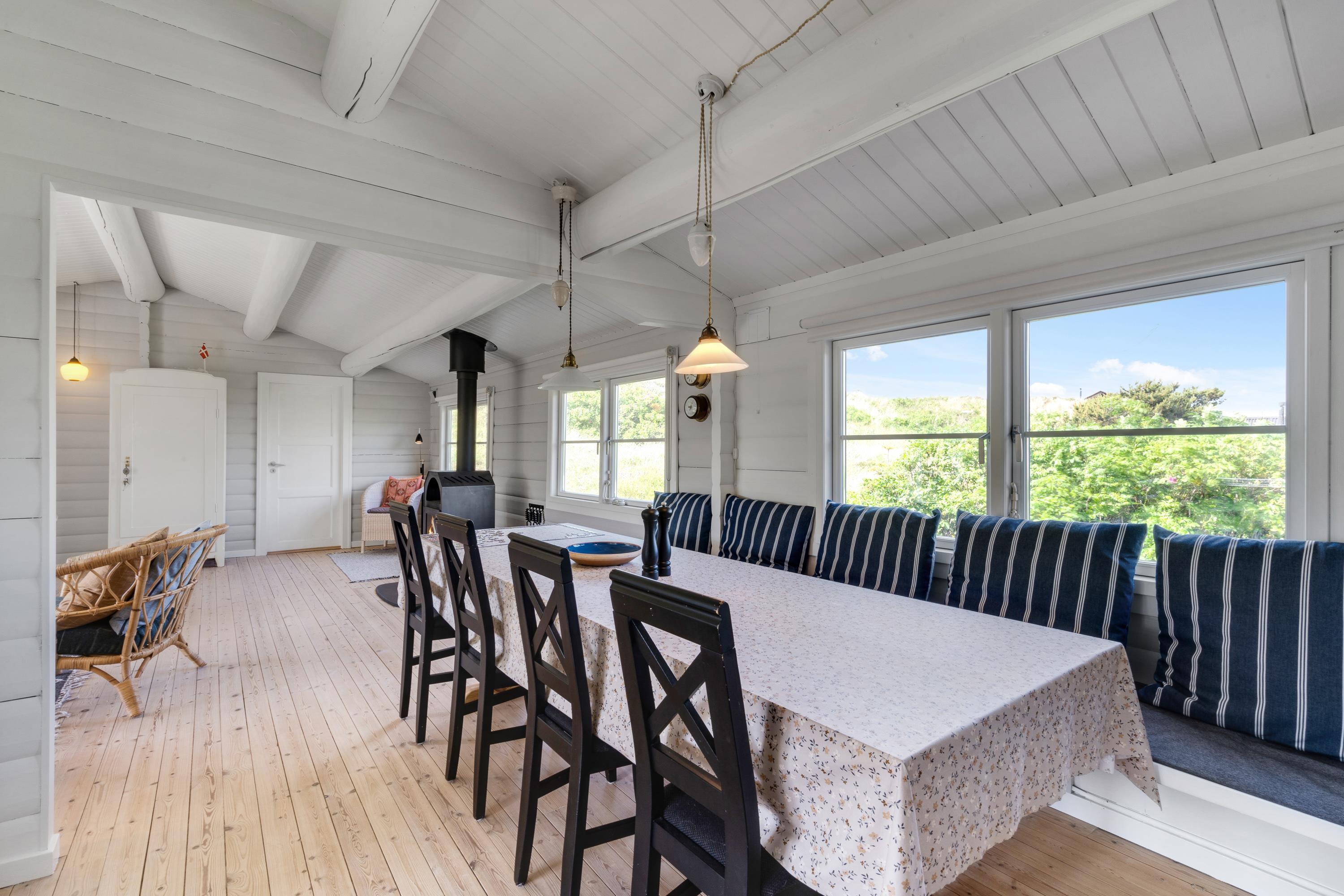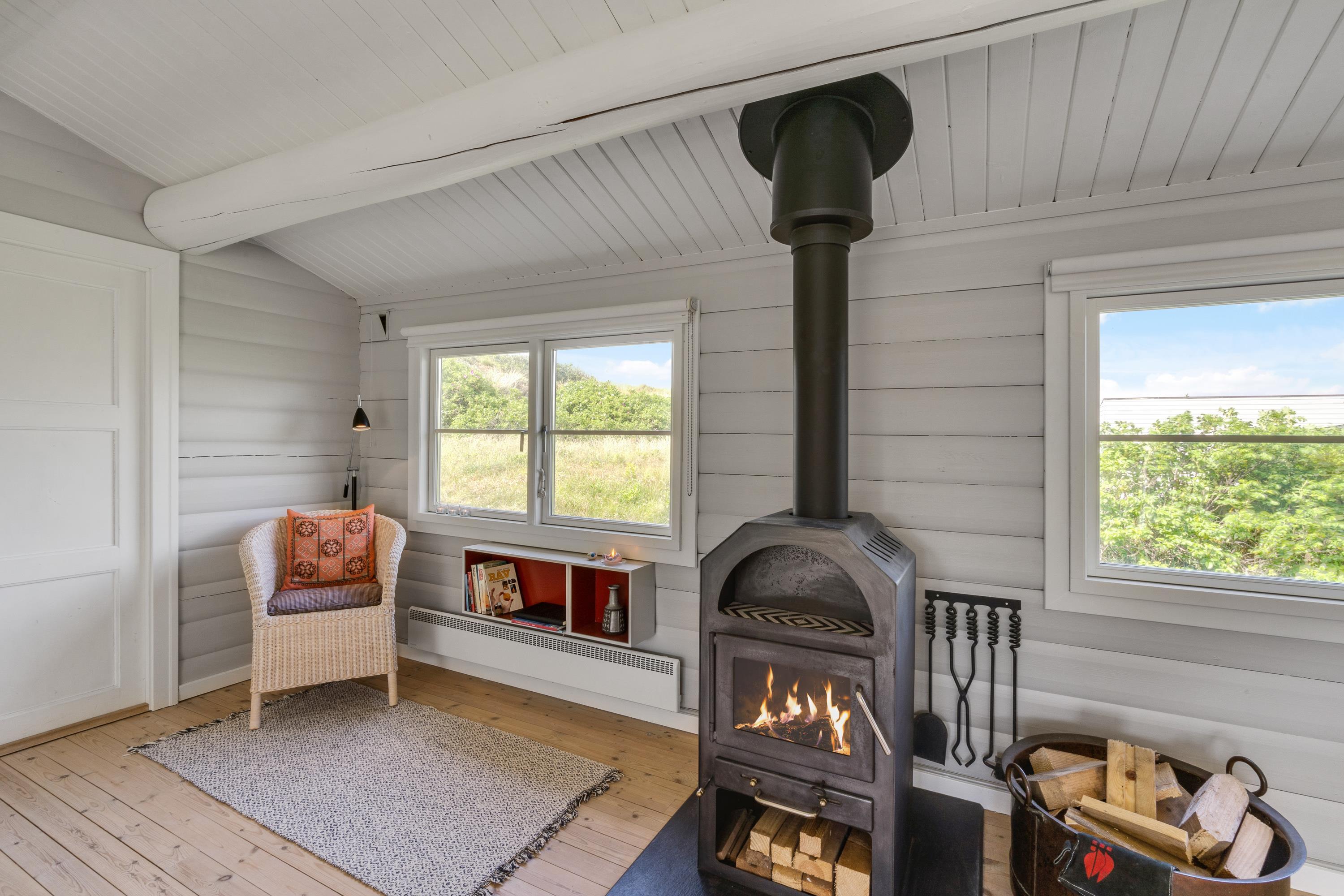 Det er ikke kun beliggenheden, der sætter stemningen. Sommerhusets indre byder på en både personlig og romantisk indretning med masser af fine detaljer, som straks leder tankerne hen på den klassiske sommerhusferie; med flotte retromøbler, synlige loftsbjælker og brændeovn.