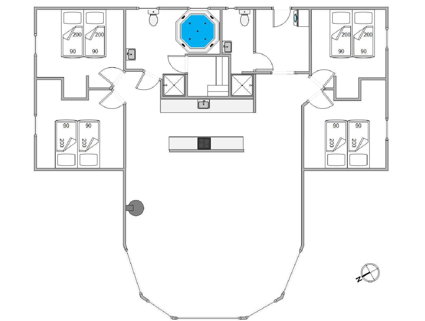 Praktisk er her 2 fine badeværelse, begge med gulvvarme og brus, så I undgår morgenkøen. På det store badeværelse finder I også feriehusets sauna og spabad. Her kan I slappe af i det varme boblende vand. De 8 sovepladser er fordelt på 4 fine værelser, som alle er udstyret med behagelige dobbeltsenge.