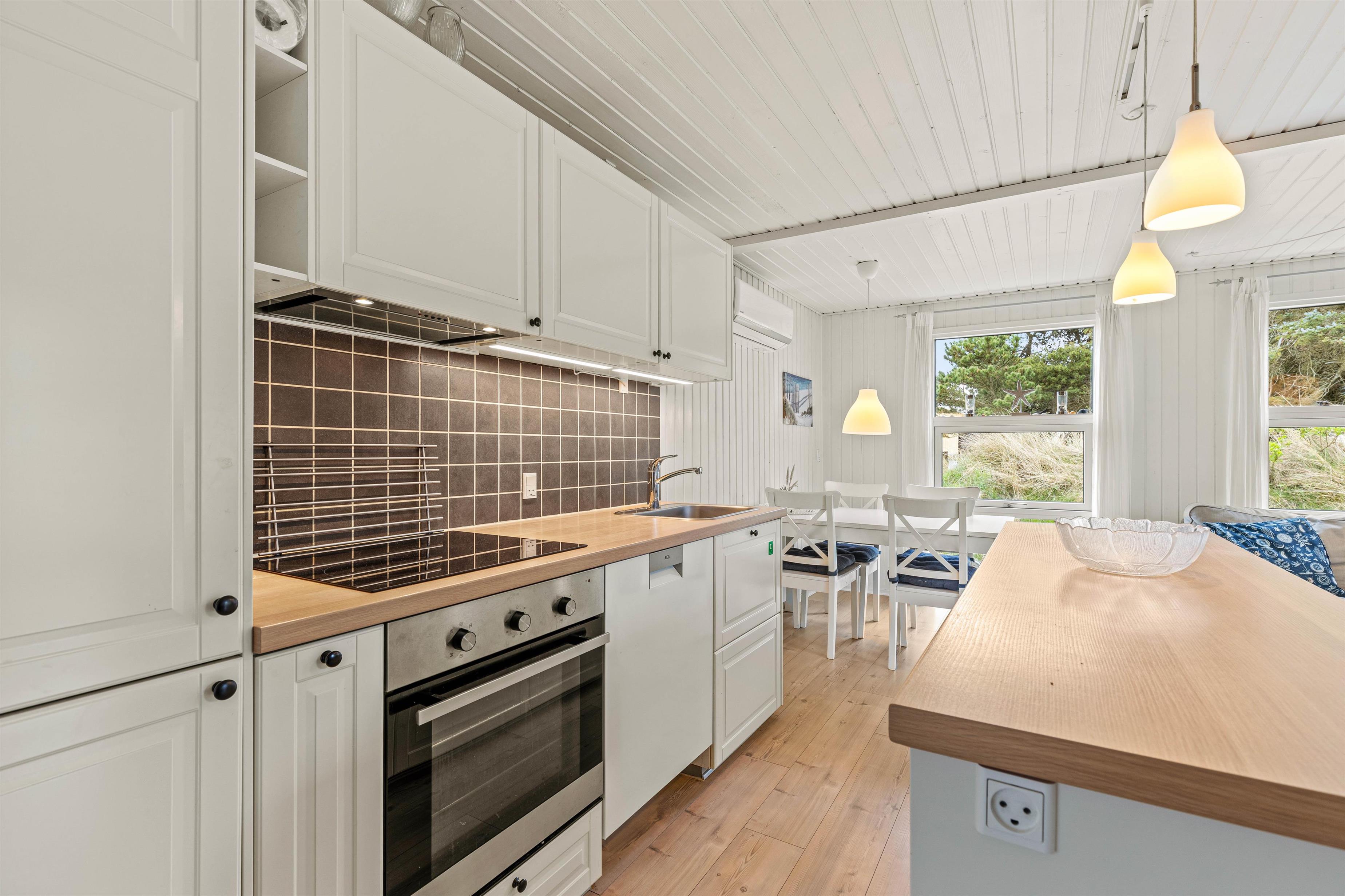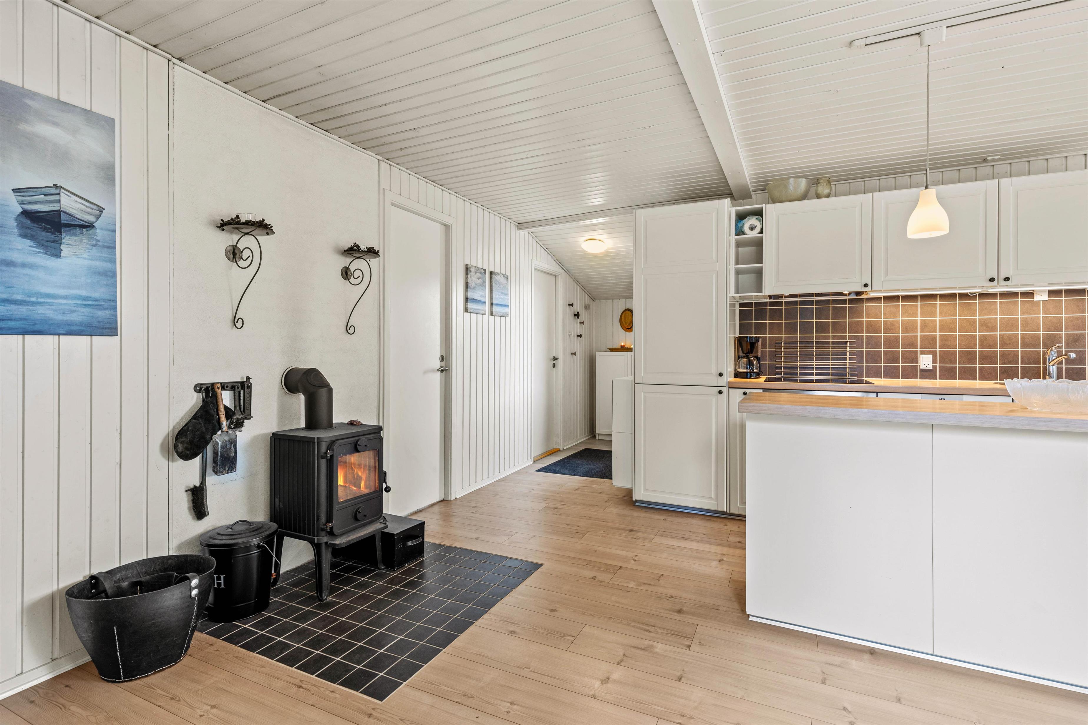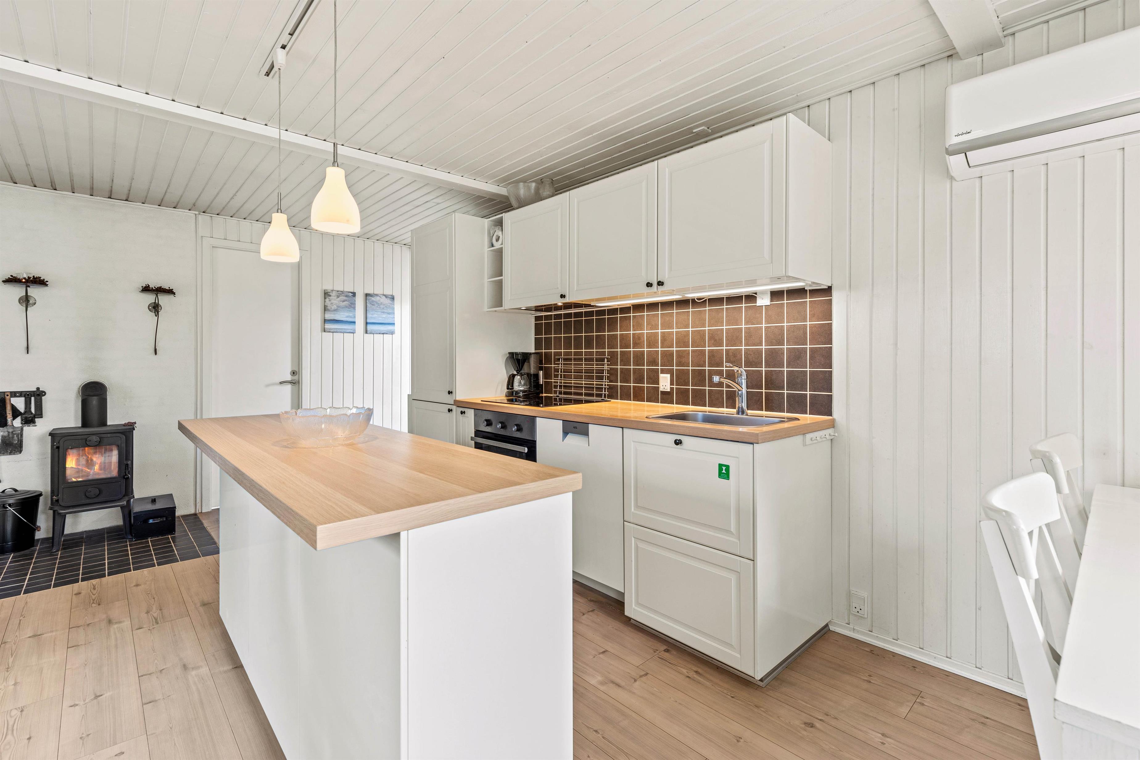 Dette lille hyggelige sommerhus ligger centralt afskærmet at klitter på Risvej 12 i Vejers. På i alt 68 m2 finder du alt hvad der er nødvendigt for en ferie ved havet. Den hyggelige stue og spisestue med integreret køkken er familiens mødested. Her kan alle slappe af på samme tid, tilberede mad eller kontakte vennerne. Brændeovnen sørger for den ægte feriestemning, der spreder et strejf af romantik og hyggelig atmosfære, især på køligere aftener.