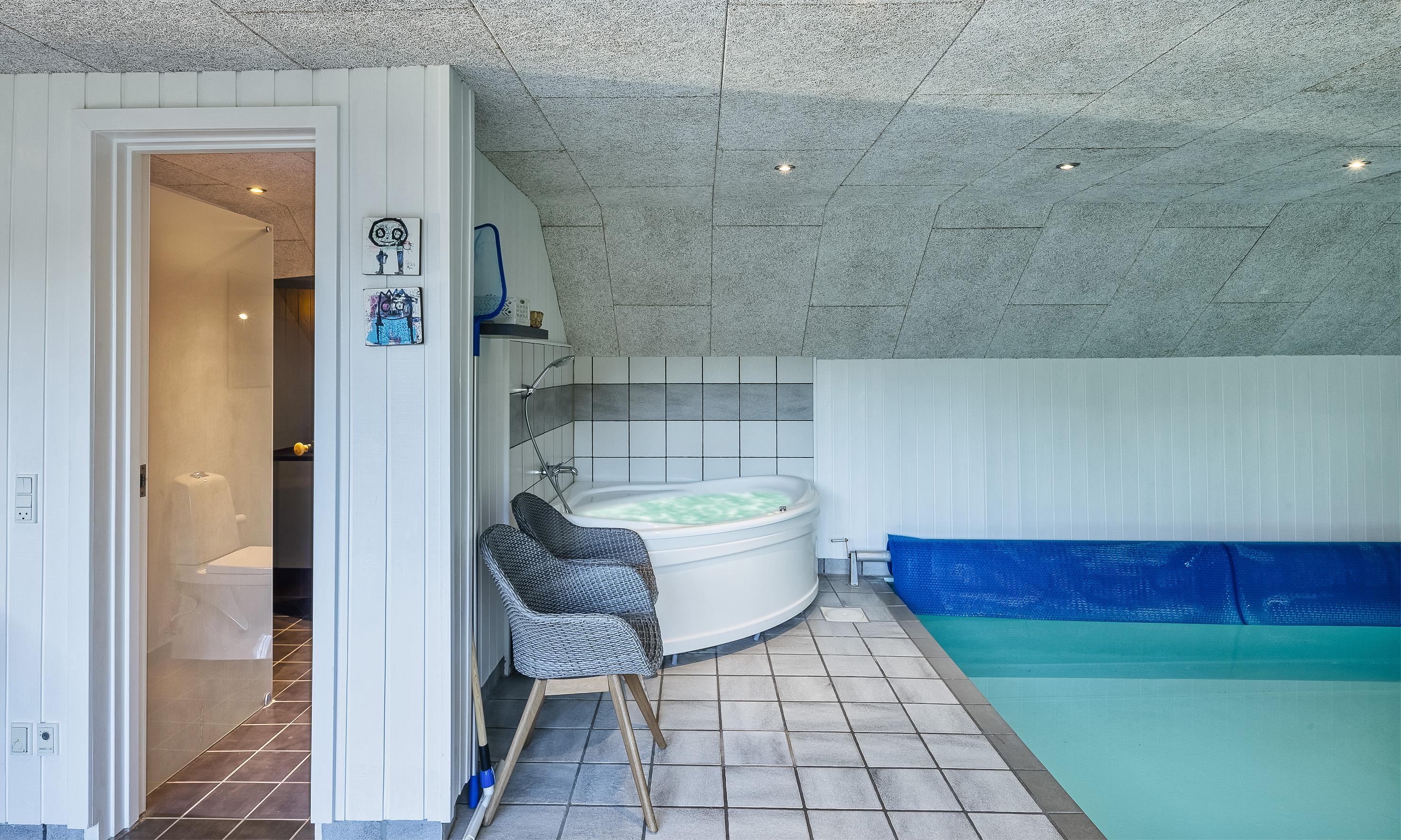 Hyggeligt poolhus til 8 personer, beliggende på herlig naturgrund, ca. 2.000 meter fra stranden.