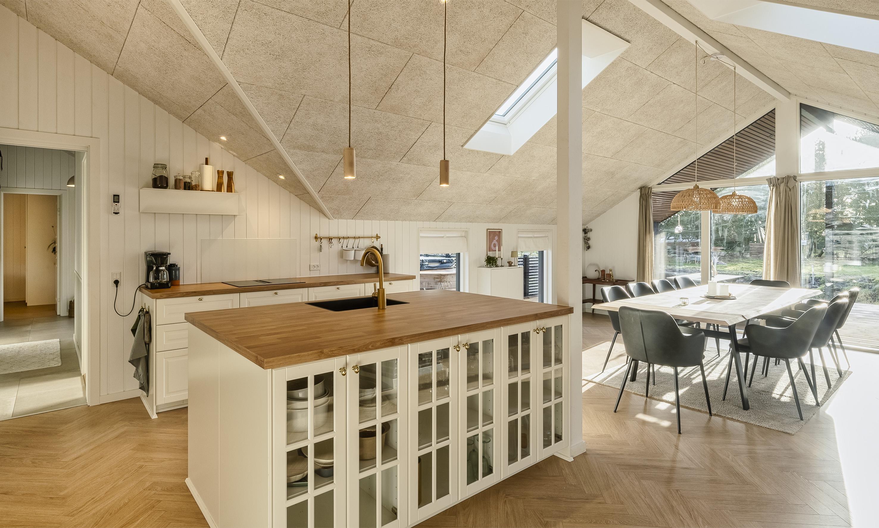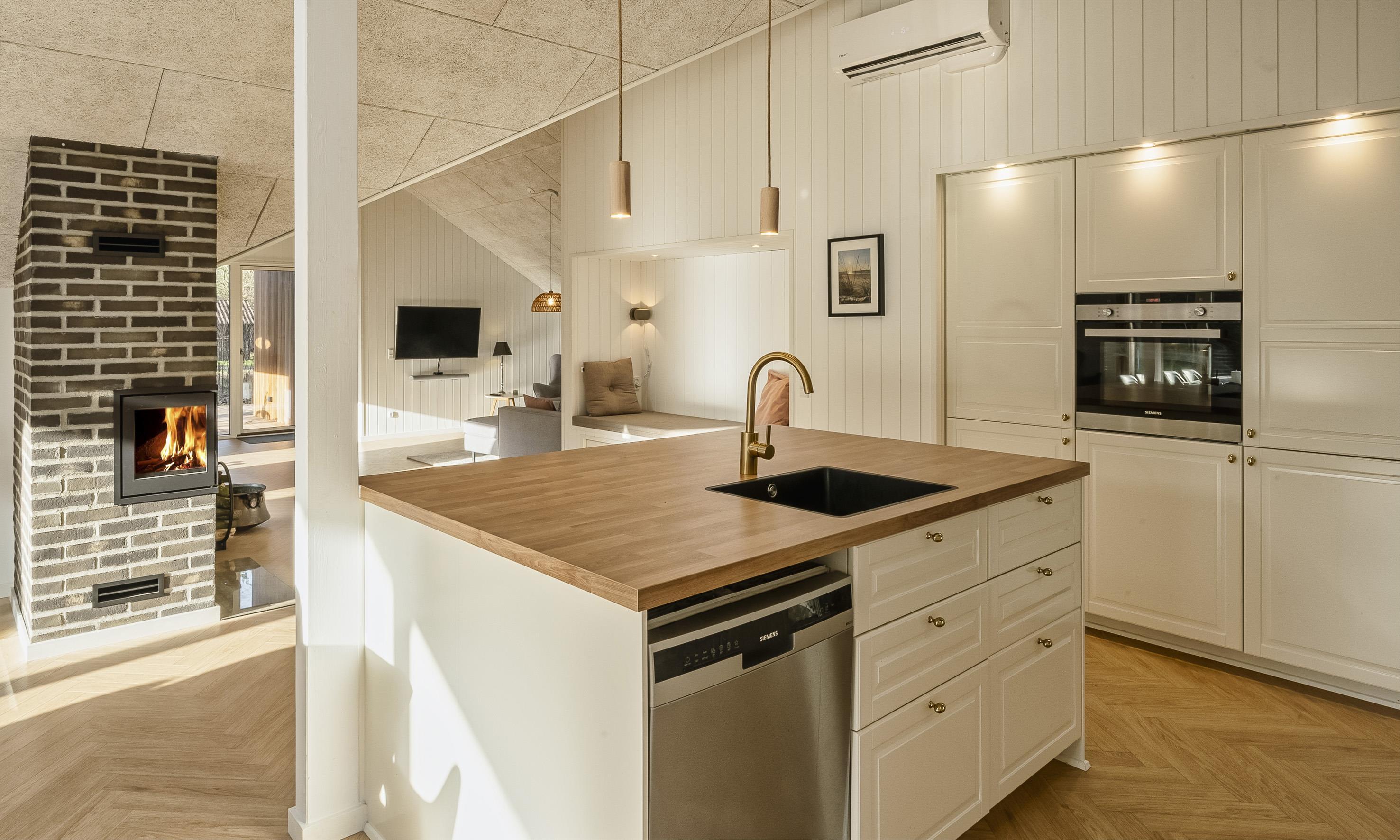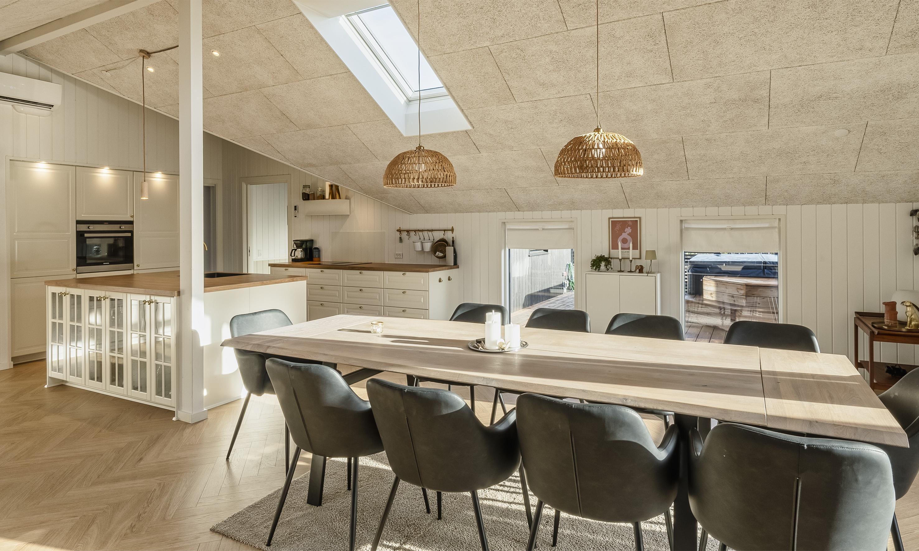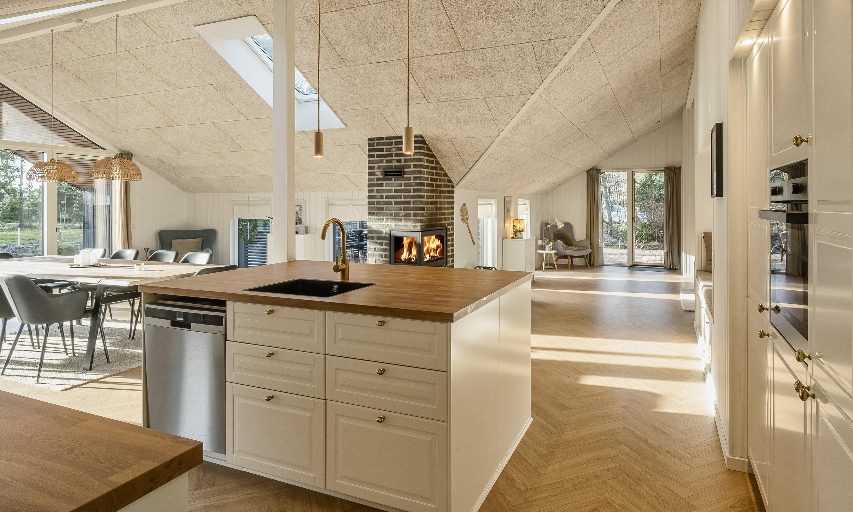 Det lyse og moderne køkken indbyder til fælles hygge madlavning. Køkkenet og spiseplads er i åben forbindelse med den hyggelige stue, hvor brændeovnen skaber en varm og afslappet atmosfære.