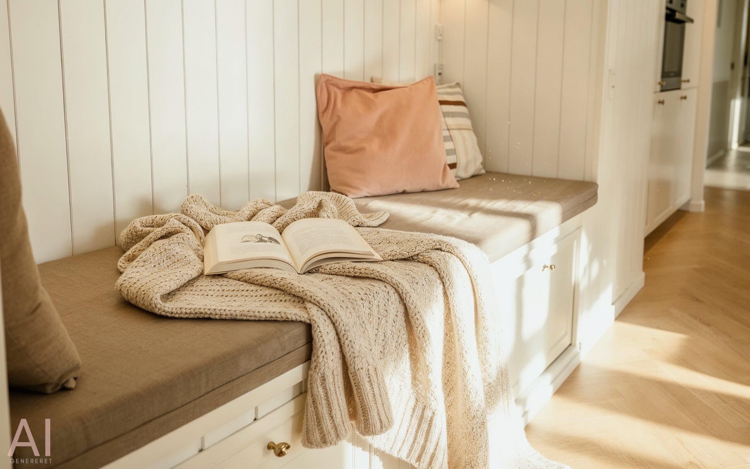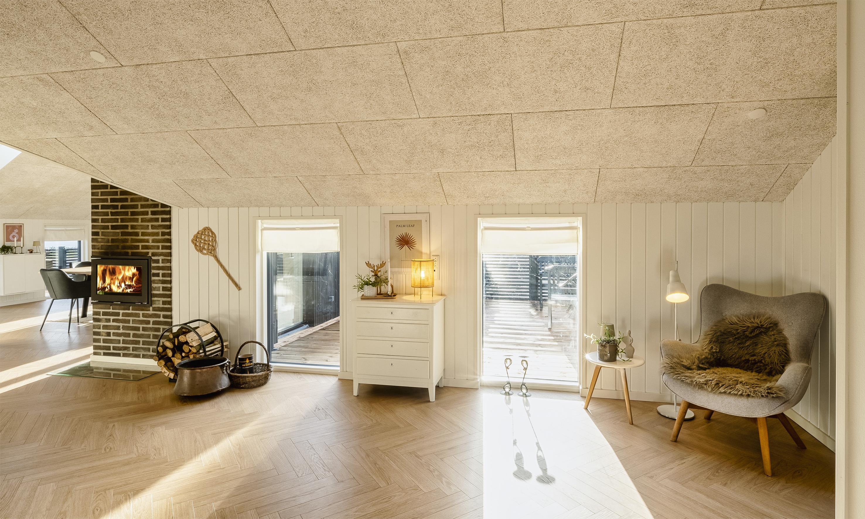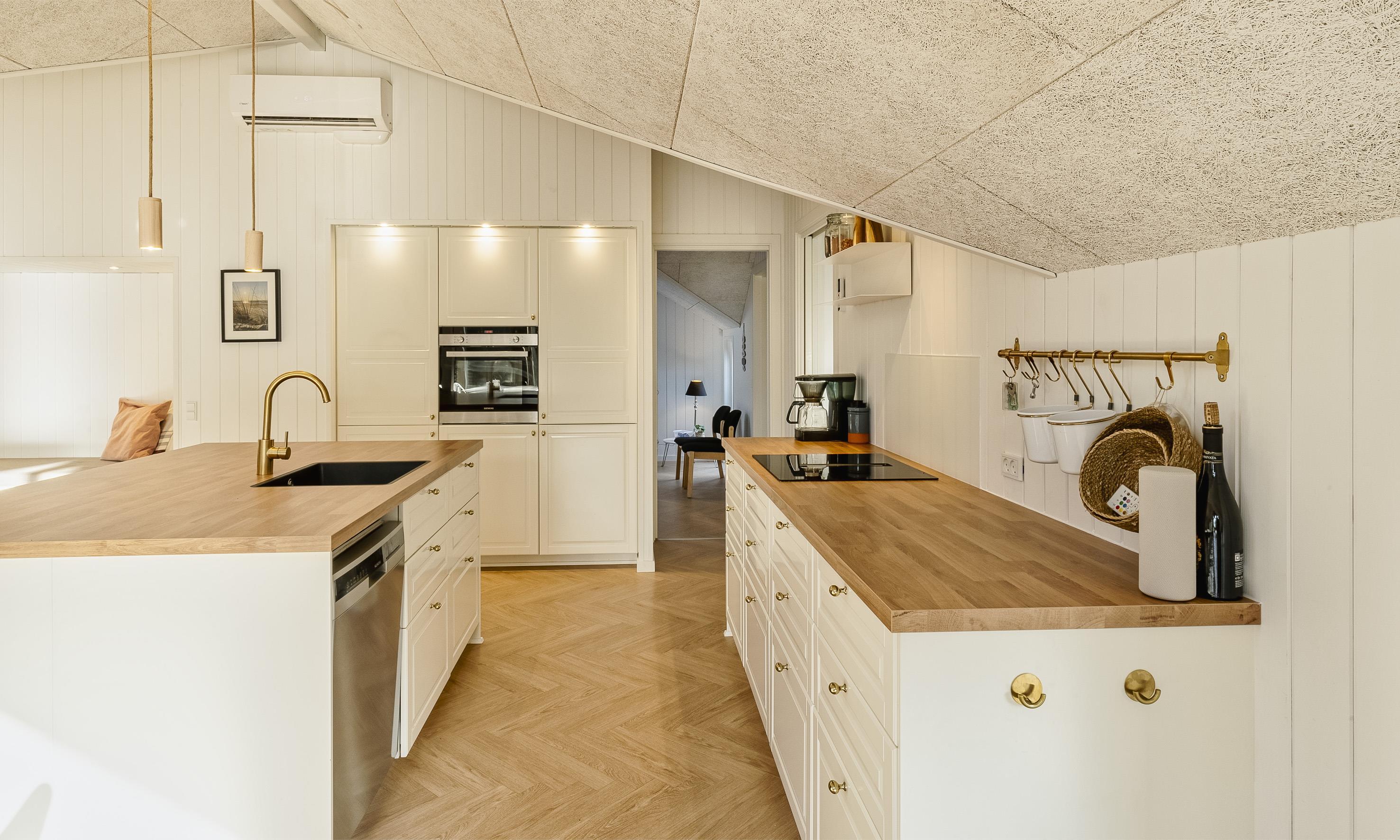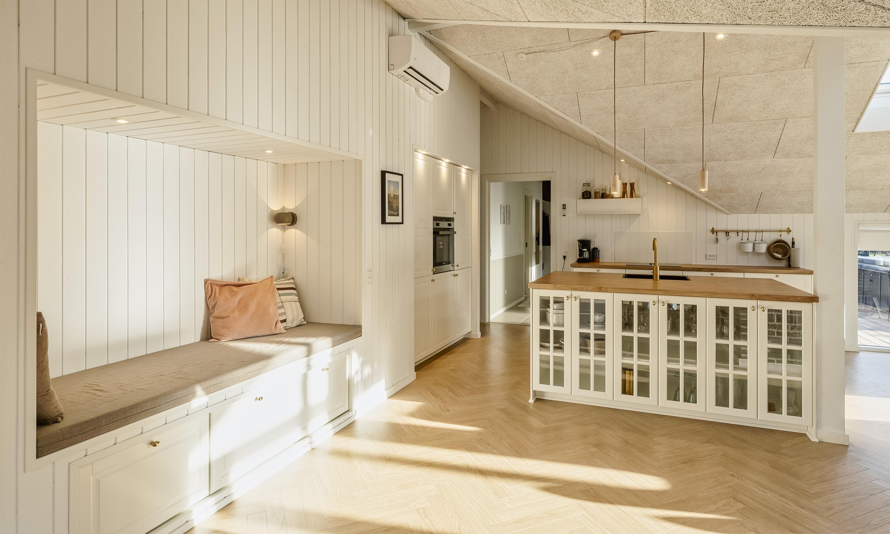 Det lyse og moderne køkken indbyder til fælles hygge madlavning. Køkkenet og spiseplads er i åben forbindelse med den hyggelige stue, hvor brændeovnen skaber en varm og afslappet atmosfære.