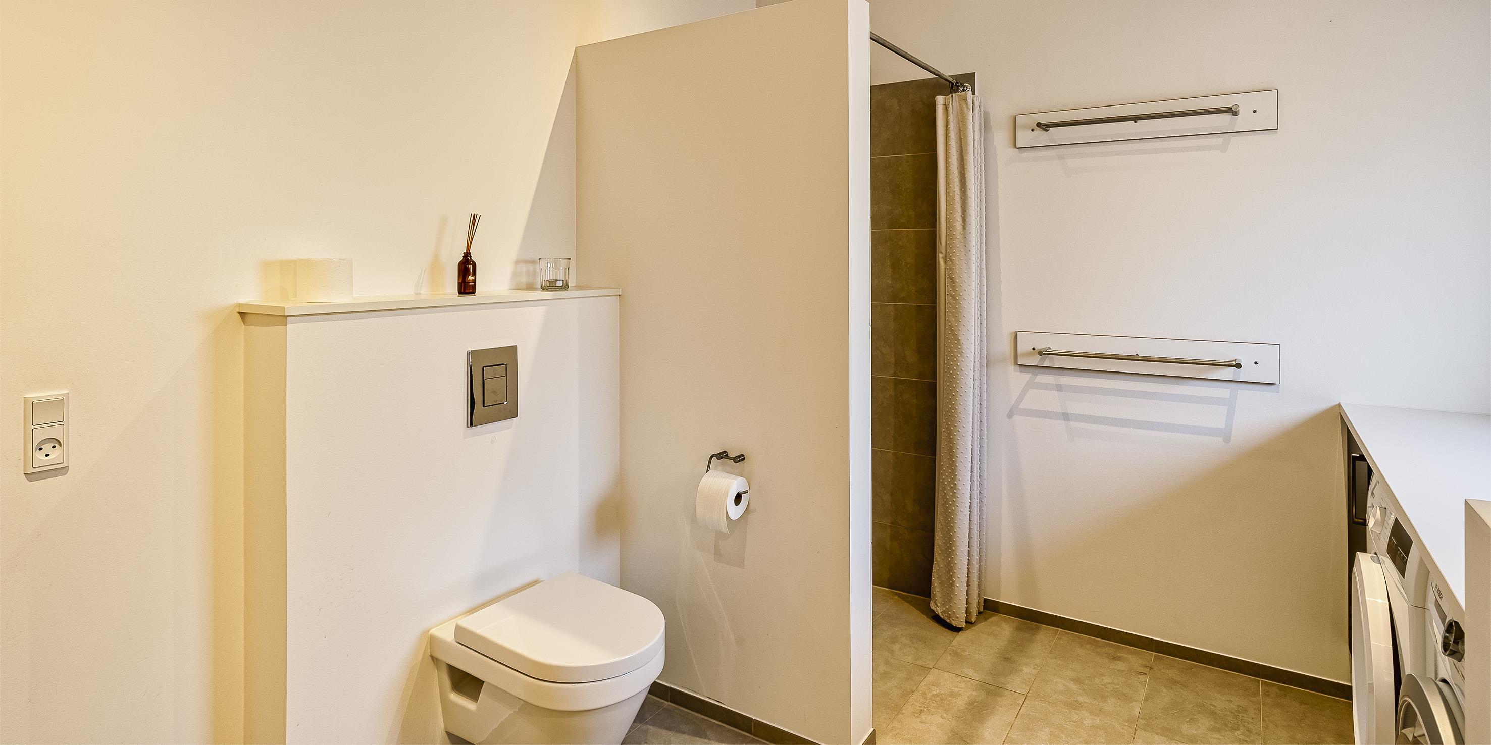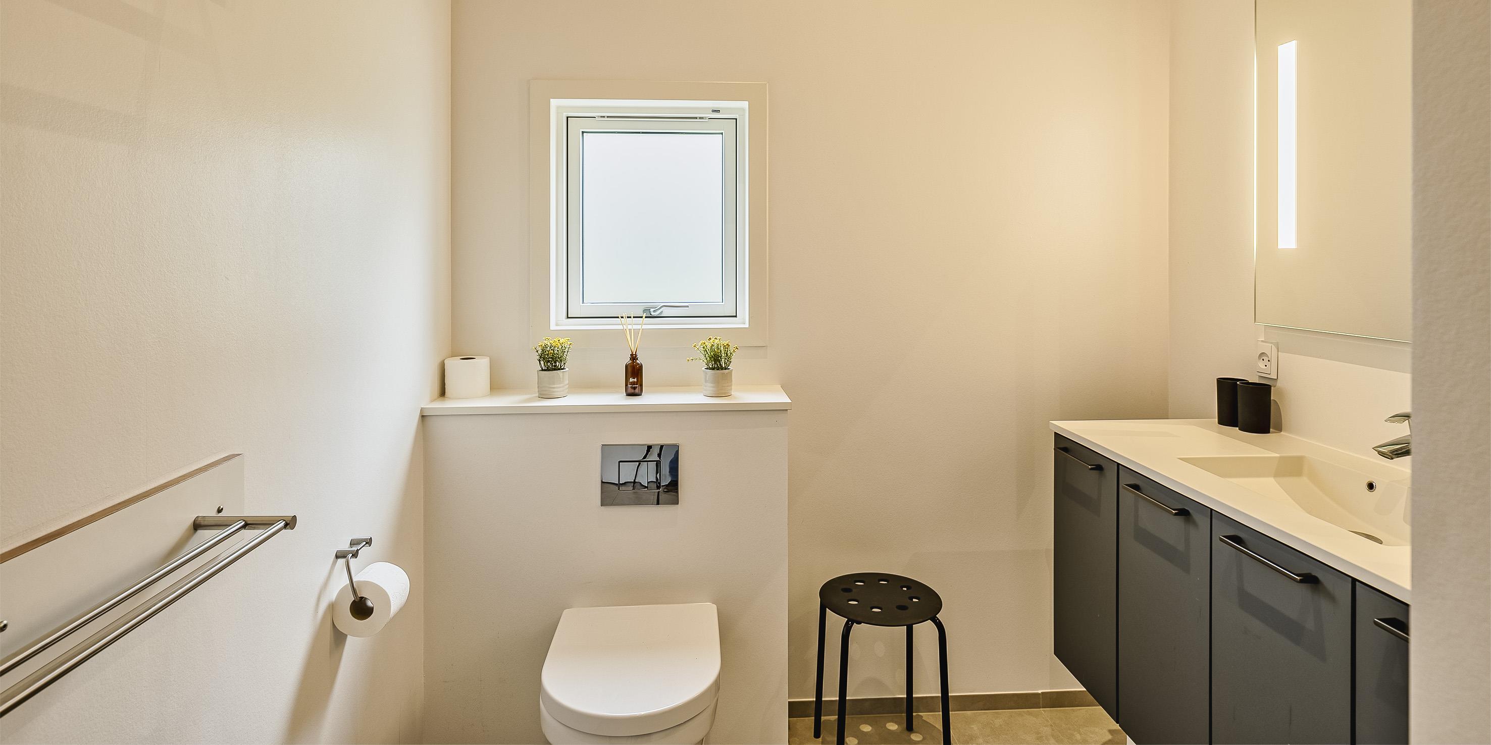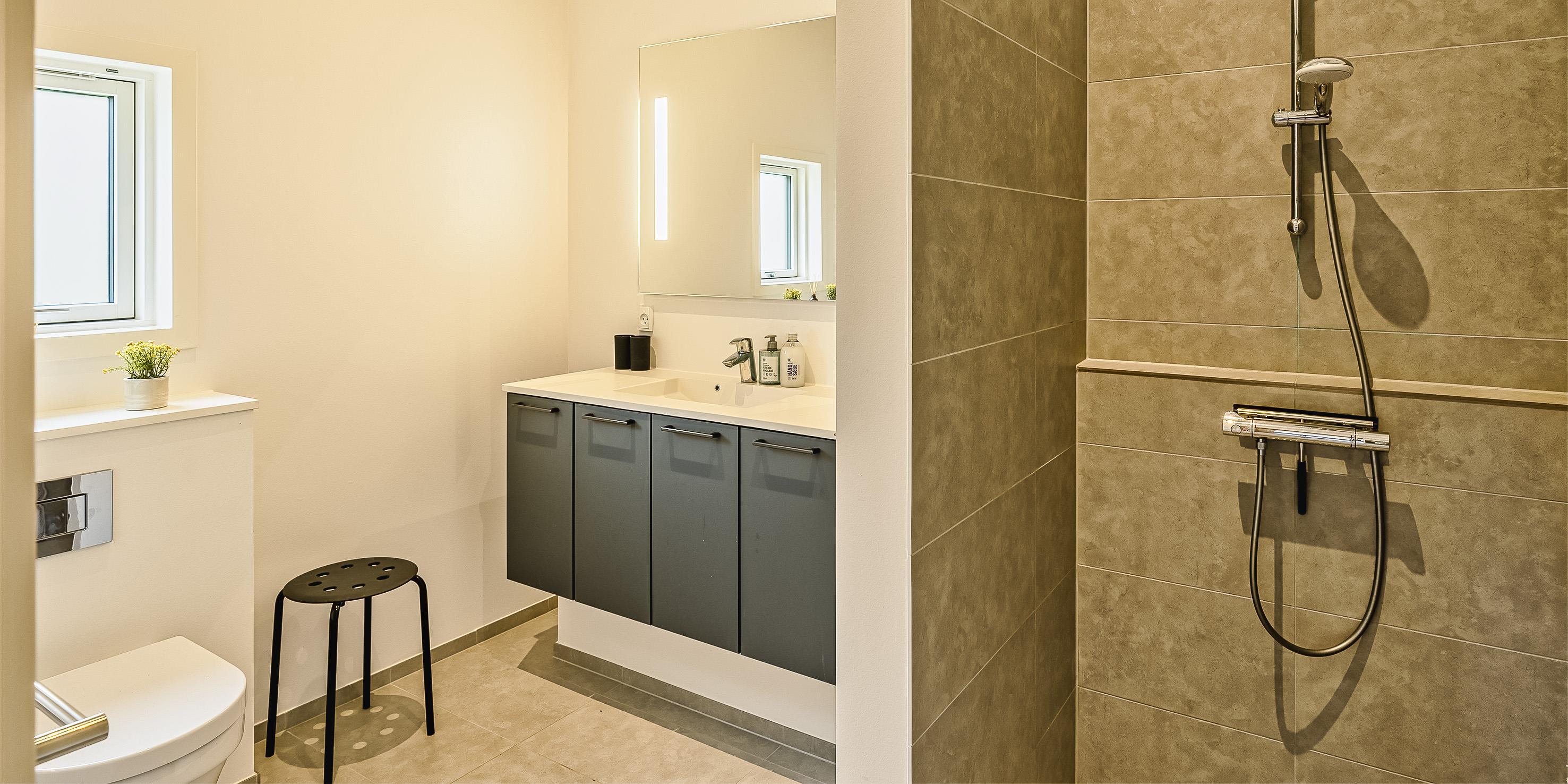 Bad med toilet, bruser og vask