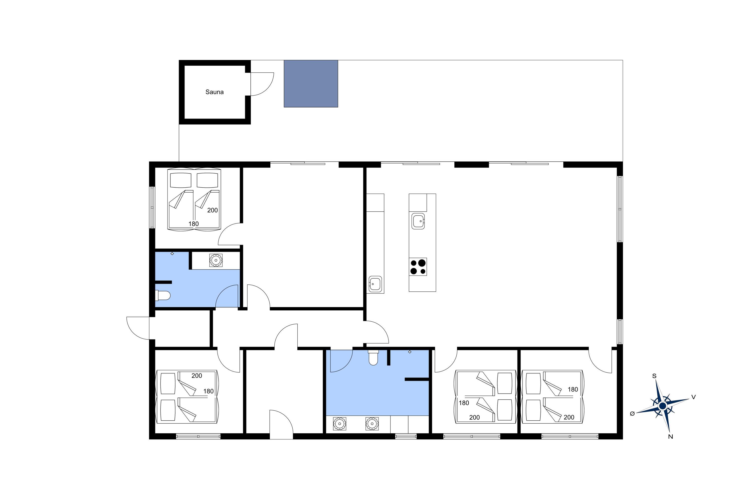 4 soveværelser med dobbeltseng 180x200 cm.